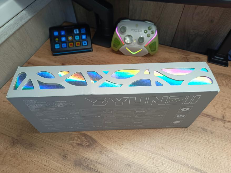 Клавиатура поставляется в качественной картонной упаковке, выполненной в узнаваемом и необычном фирменном стиле бренда YUNZII. Основу составляет прочный картонный бокс, поверх которого размещён отдельный вкладыш, визуально повторяющий заднюю часть клавиатуры и подчёркивающий внимание к деталям. В комплекте, помимо самой клавиатуры, также можно найти: