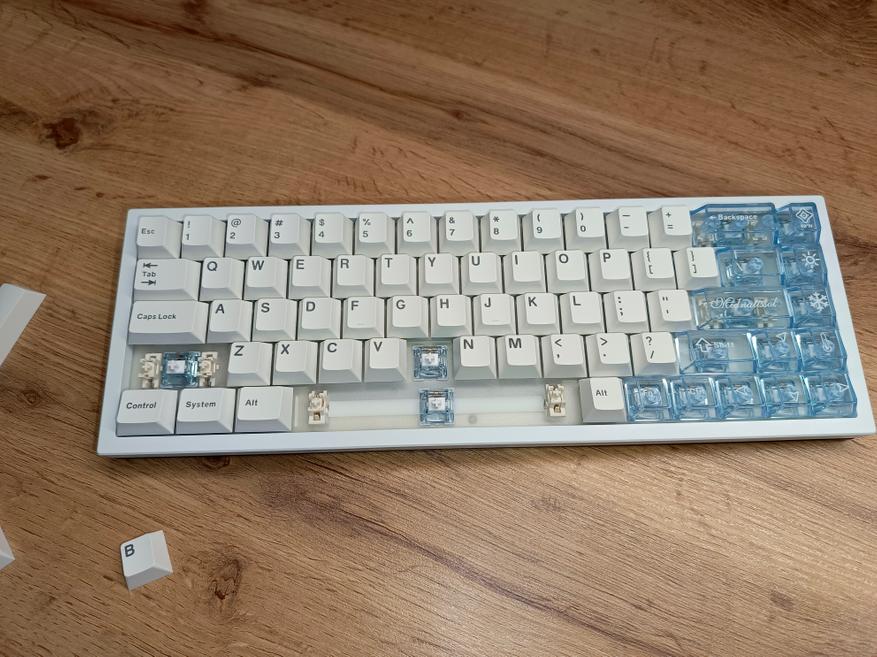 Клавиатура заметно выделяется своим внешним видом на фоне большинства других моделей. В первую очередь внимание привлекают прозрачные колпачки клавиш, сквозь которые хорошо видны установленные свитчи. При этом такими колпачками оснащена только правая часть клавиатуры, что создаёт интересный визуальный акцент. При желании их без труда можно заменить на белые или светло-голубые колпачки, входящие в комплект поставки.