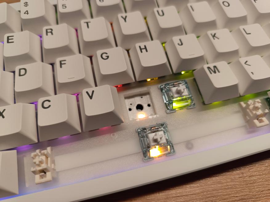 Установленные свитчи имеют формат 5-pin, однако клавиатура также полностью совместима и с 3-pin-свитчами. Благодаря системе хотсвапа, заменить вышедшие из строя переключатели либо установить другие по своему вкусу можно всего за несколько минут, без необходимости пайки. По звучанию данные свитчи отличаются тихой работой — нажатия мягкие, без выраженных щелчков и резких звуков, что делает их комфортными для повседневного использования.
