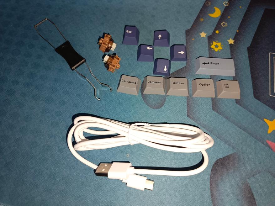 Общее качество сборки на хорошем уровне: отсутствуют скрипы, люфты и посторонние шумы. Комплектация тоже радует: есть два запасных свитча и вариант клавиш для тех, кто работает на операционной системе MAC. Переключаться между разными ОС можно с помощью комбинаций клавиш FN+A и FN+F. Минус в комплектации один и это комплектный кабель. Он длинный, но сам без фильтров от высокочастотных помех и нейлоновой оплетки.