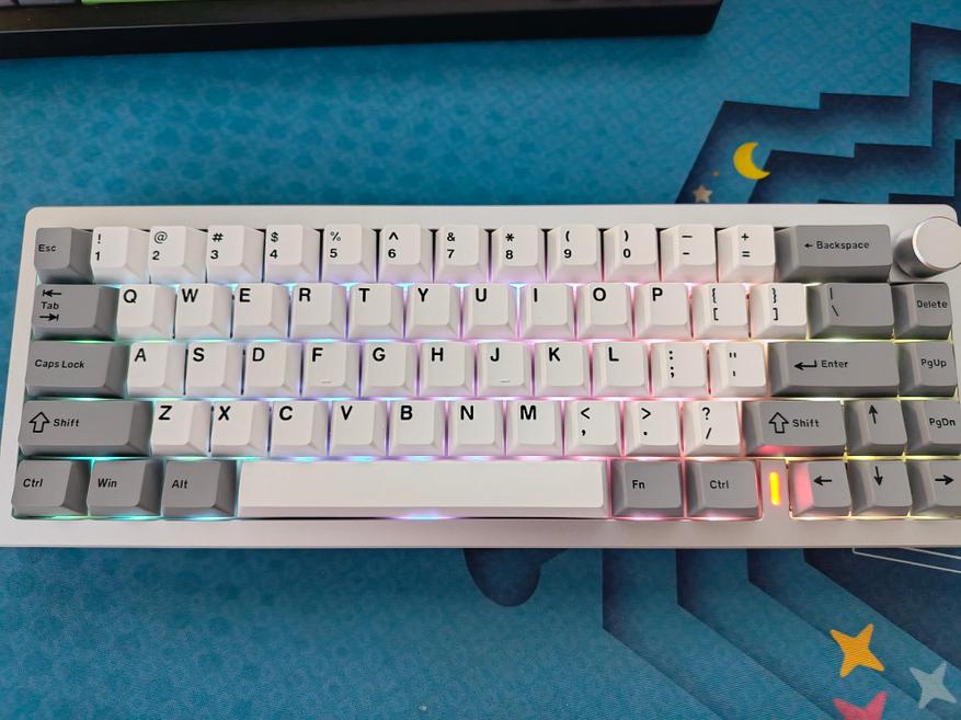 Сразу обратите внимание, что обозреваемая модель является компактной клавиатурой, и у нее 66 клавиш и один энкодер. Верхнего мультимедийного ряда с клавишами F1-F12 здесь нет. Они расположены на втором слое через клавишу FN. Кстати, клавиша FN всего одна и находится с правой стороны от пробела. Все клавиши, кроме энкодера, можно перепрограммировать под ваше предпочтение, но об этом чуть позже.