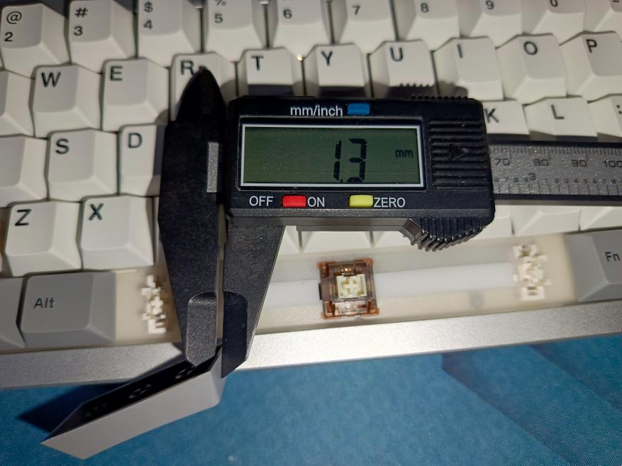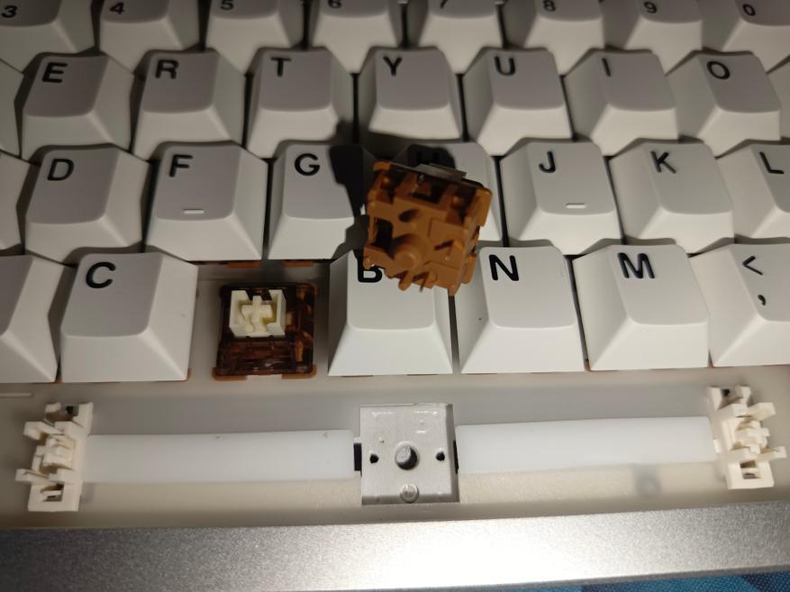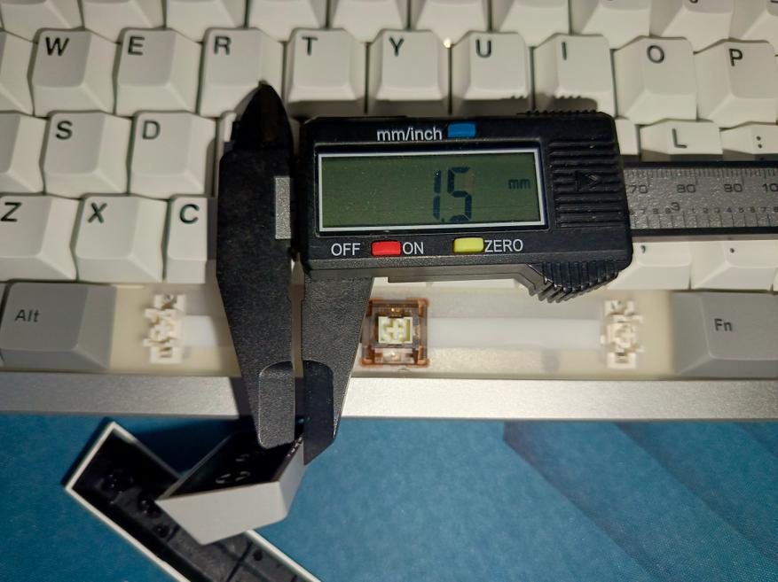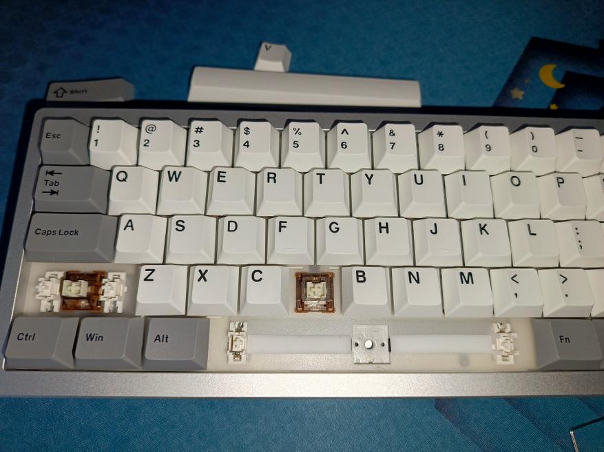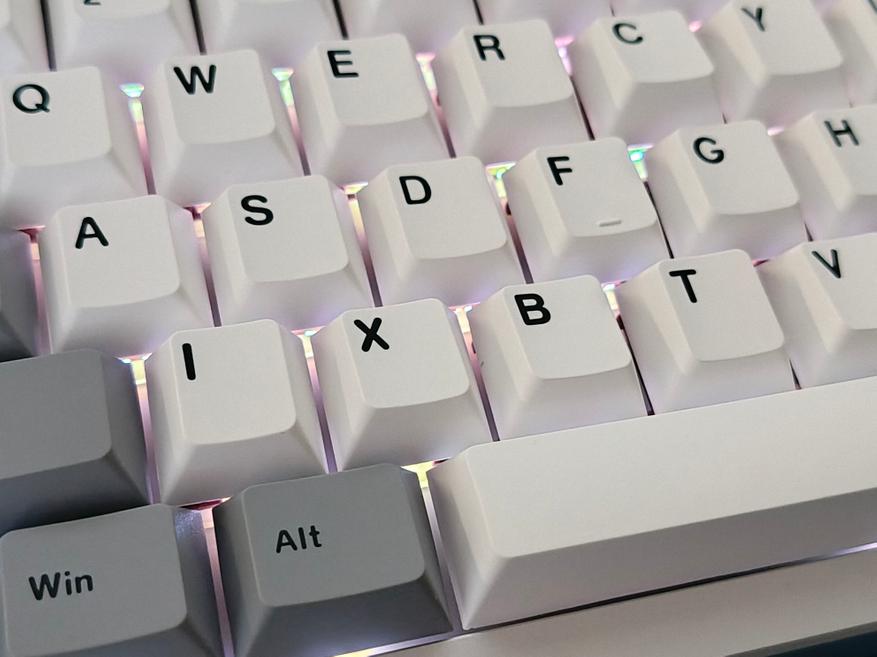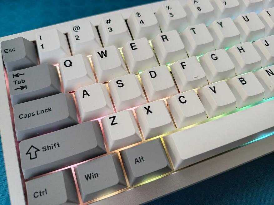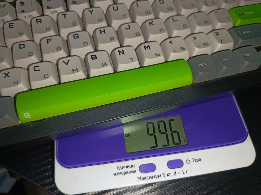 Кейкапы сделаны по технологии двойного литья. Качество среднее, так как толщина плавает от 1,3 мм до 1,5. Двойная стабилизация есть только у самых длинных клавиш, а это пробел, левый shift и enter.
