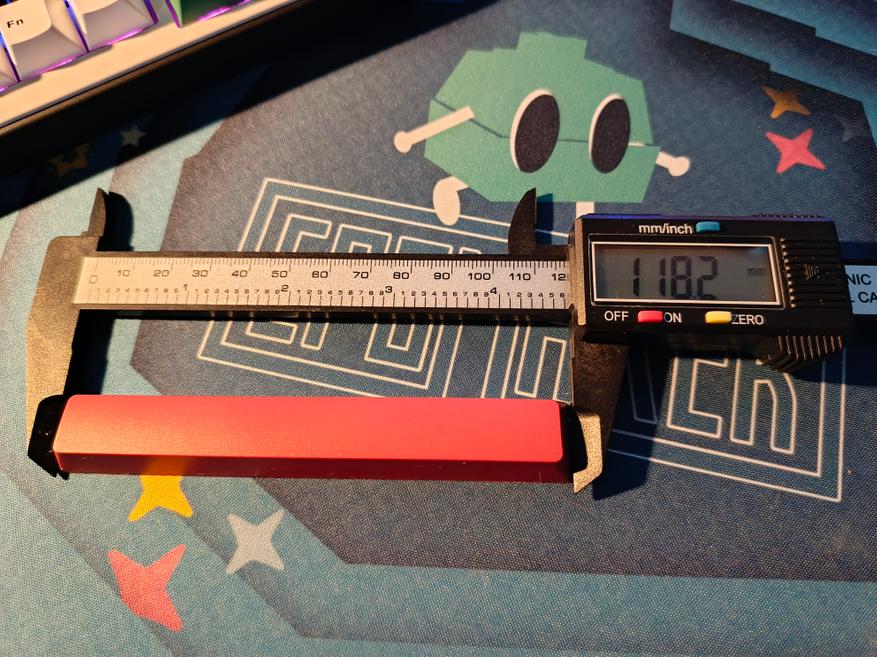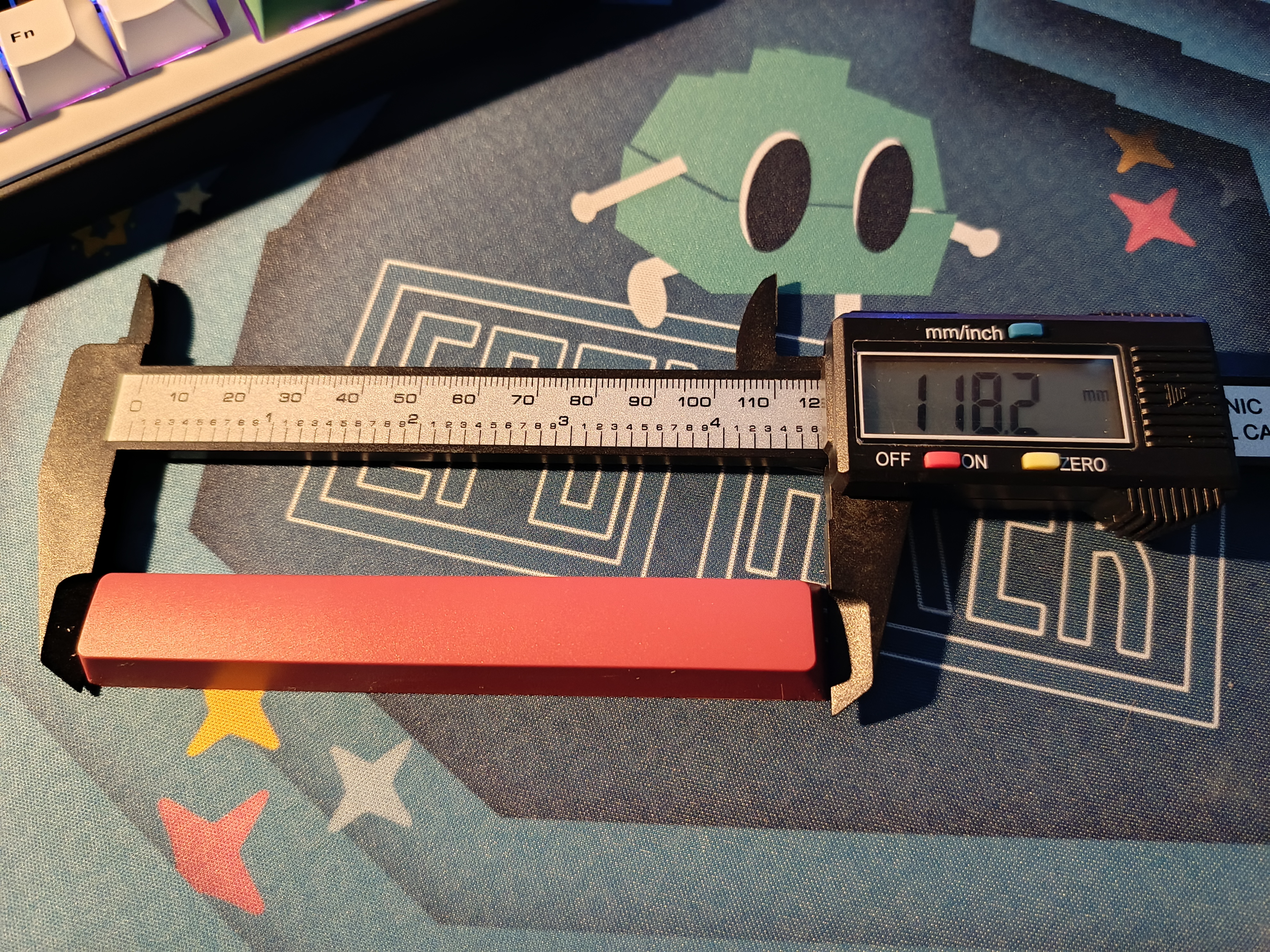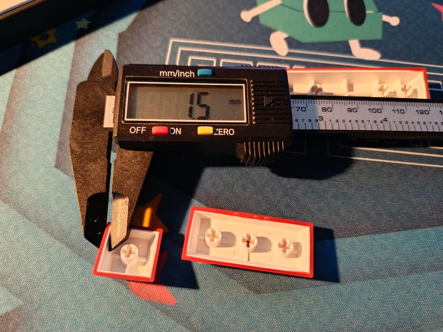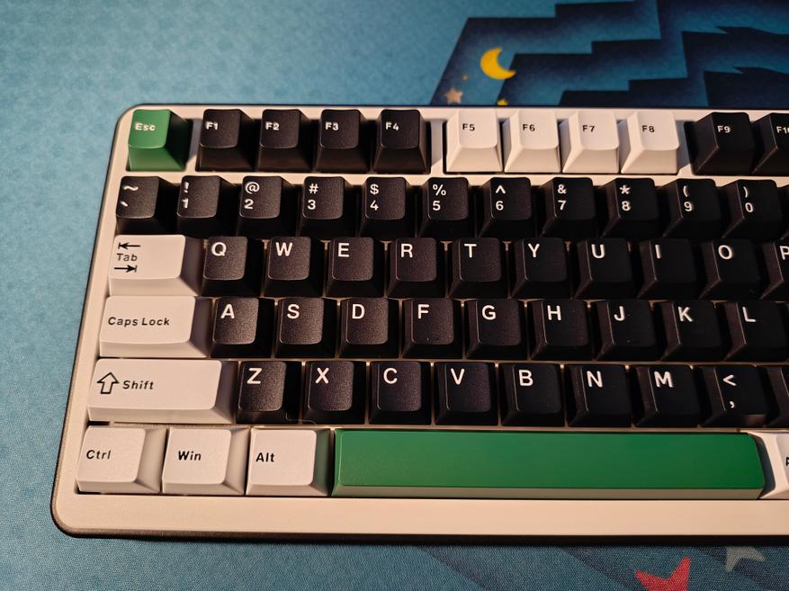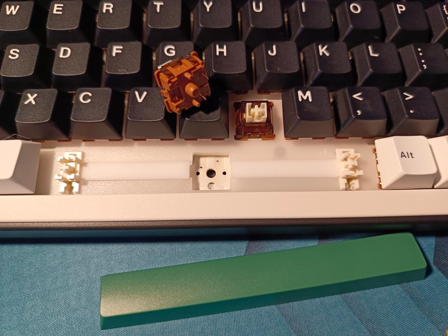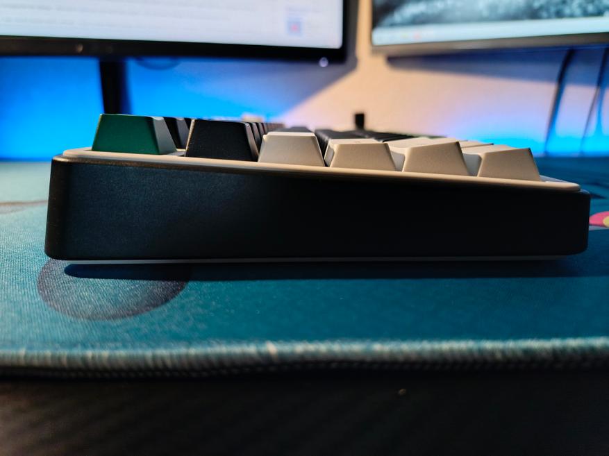 Здесь установлены PBT кейкапы с технологией двойного литья. Толщина стенок 1,5 мм. Свитчи в этой модели установлены Cocoa Cream V2 Linear Switch. У продавца можно выбрать и другие свитчи, а также цвет кейкапов. Для срабатывания данных свитчей нужно усилие в 47 грамм — тестировалось на монетках. Сами свитчи имеют 3-контактное подключение, но клавиатура поддерживает также и 5-контактные свитчи.