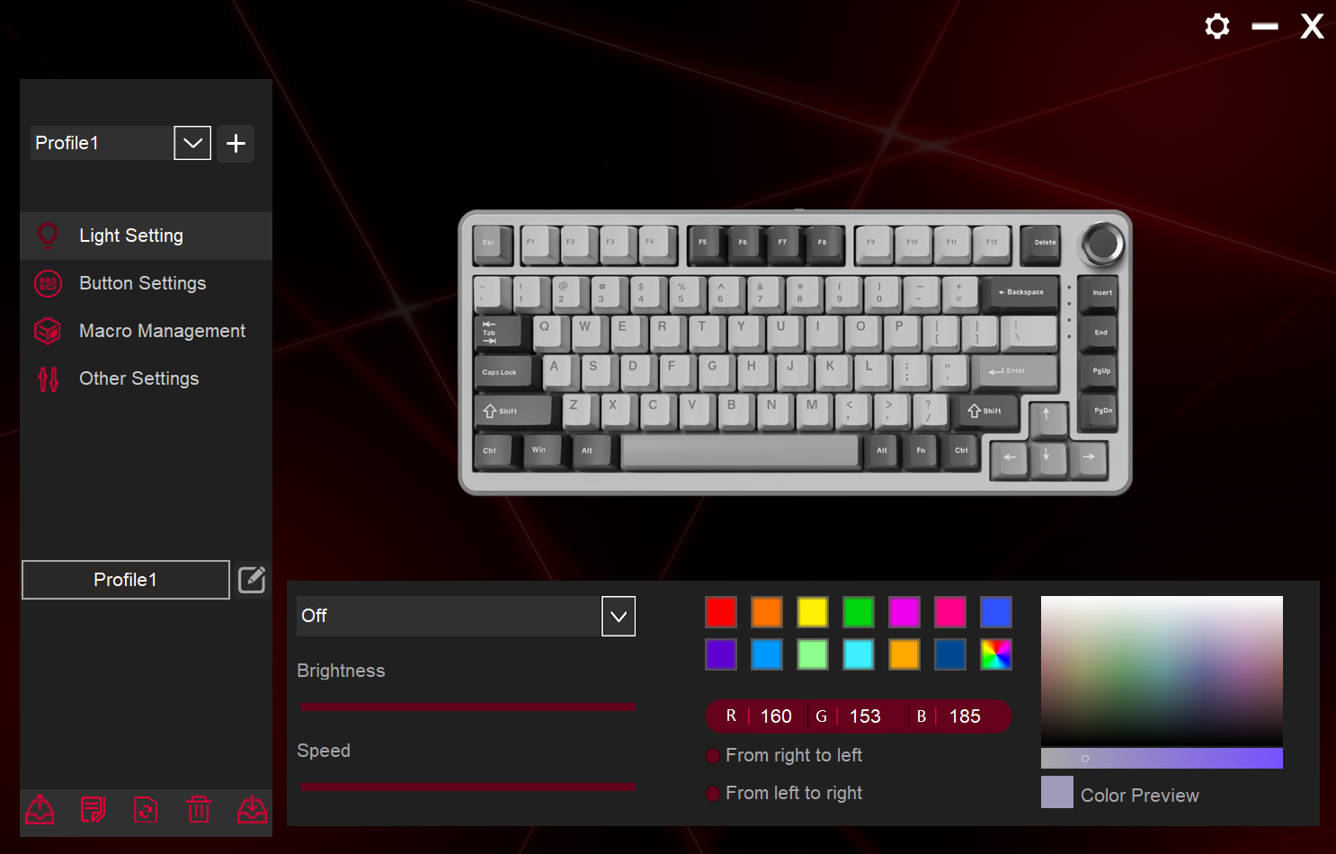 С официального сайта скачивается специальный софт для этой клавиатуры. В целом стандартный набор функций. Создание макросов, перепрограммирование каждой клавиши. Гибкая настройка подсветки. Софт работает с клавиатурой как при проводном подключении, так и при беспроводном подключении. Если вкратце, то настройки клавиатуры весьма богатые. Самое главное, что все можно сохранить в разный профиль и нажатием пары кнопок можно быстро переключать.