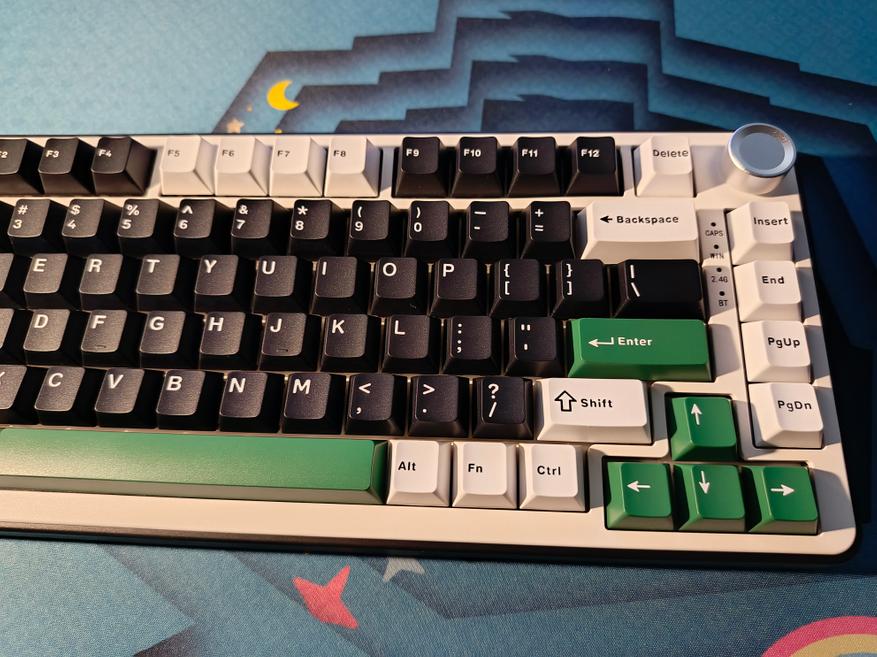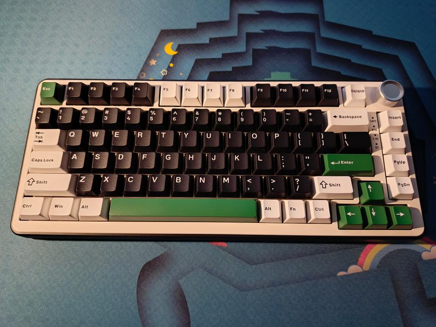 Клавиатура сделана с ANSI-компоновкой. Всего установлено 82 клавиши плюс энкодер. Энкодер выполняет стандартный набор функций. Регулировка громкости с возможностью приглушения звука или изменения яркости подсветки. Перепрограммировать под другие задачи его нельзя.