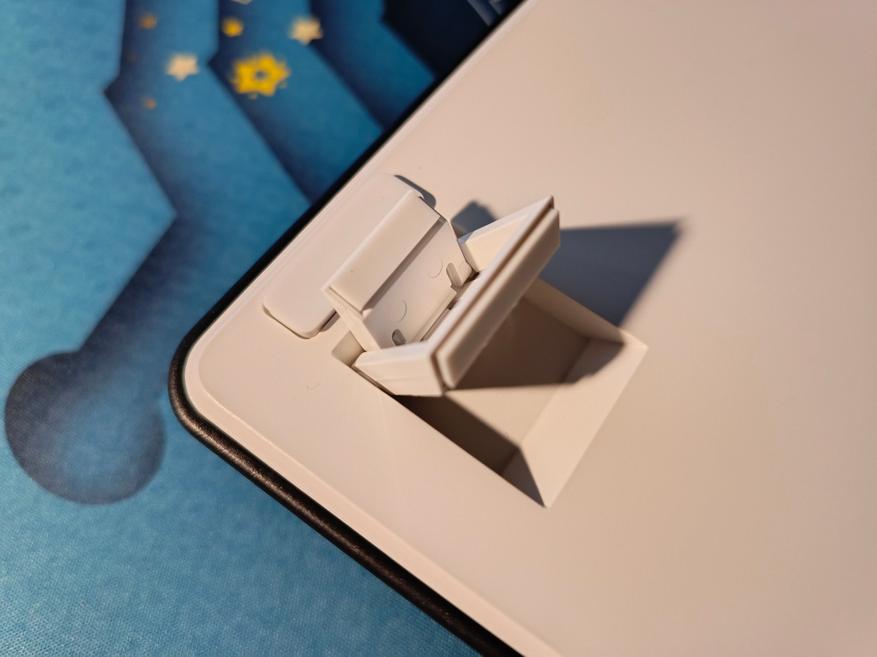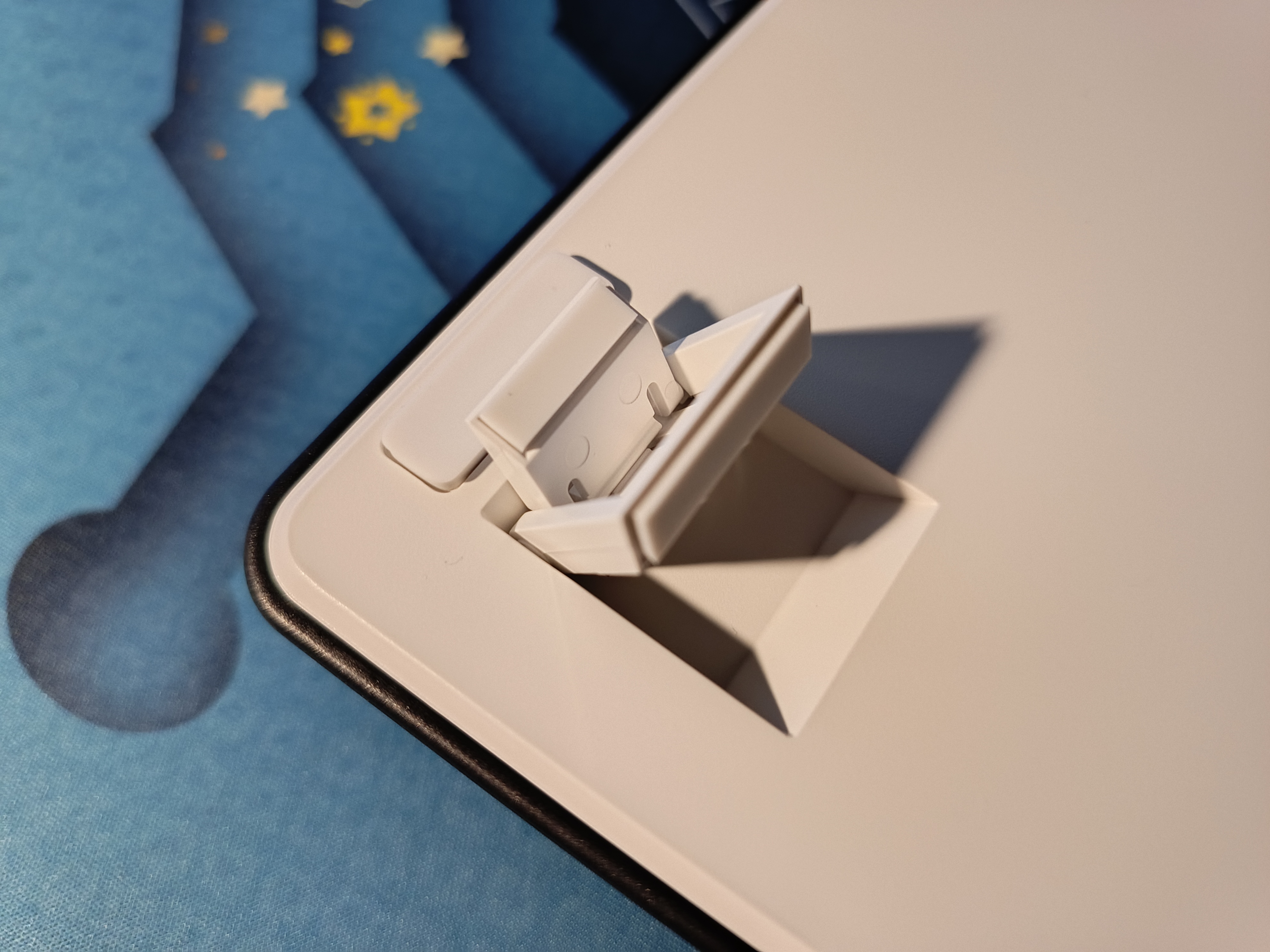 С обратной стороны установлены двойные лапки, которые позволяют изменять угол наклона. На каждой лапке наклеены антискользящие накладки, которые хорошо удерживают клавиатуру на столе. Хотя клавиатура и так не скользит по столу, так как она весит больше килограмма, почти 1400 грамм.