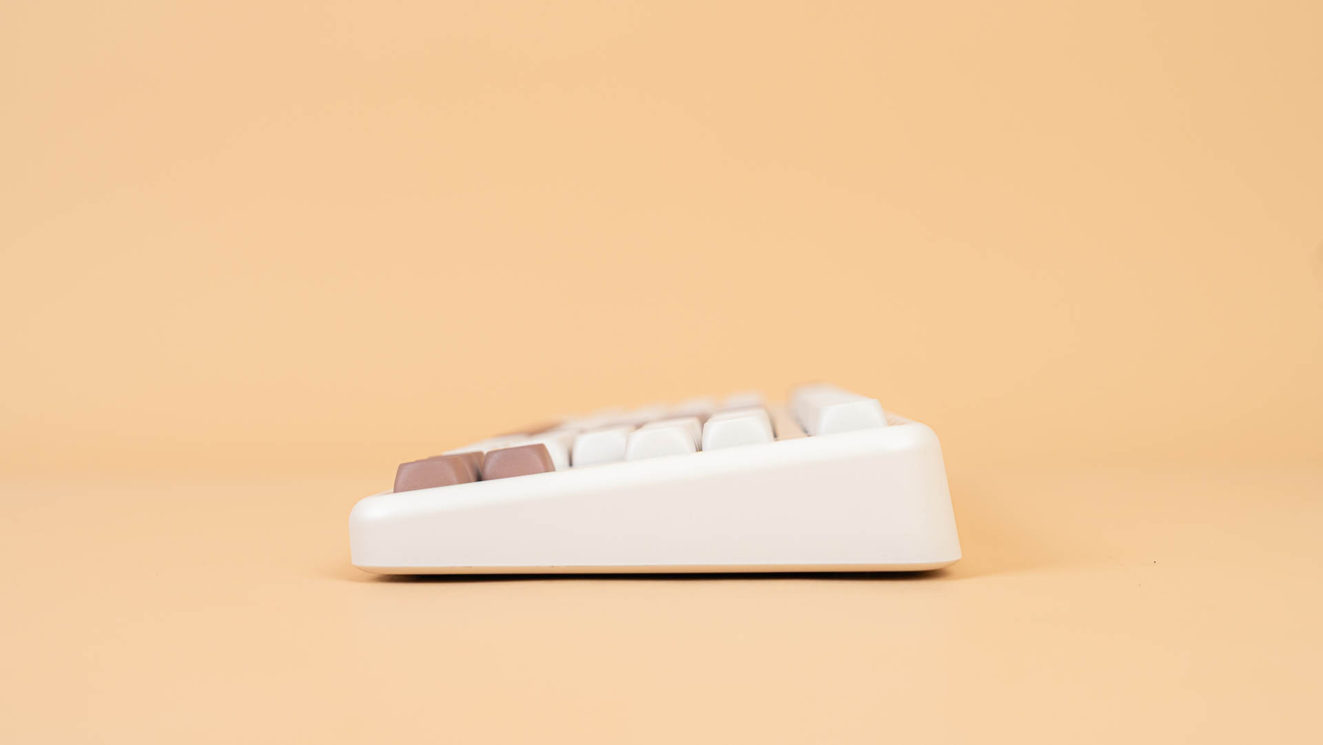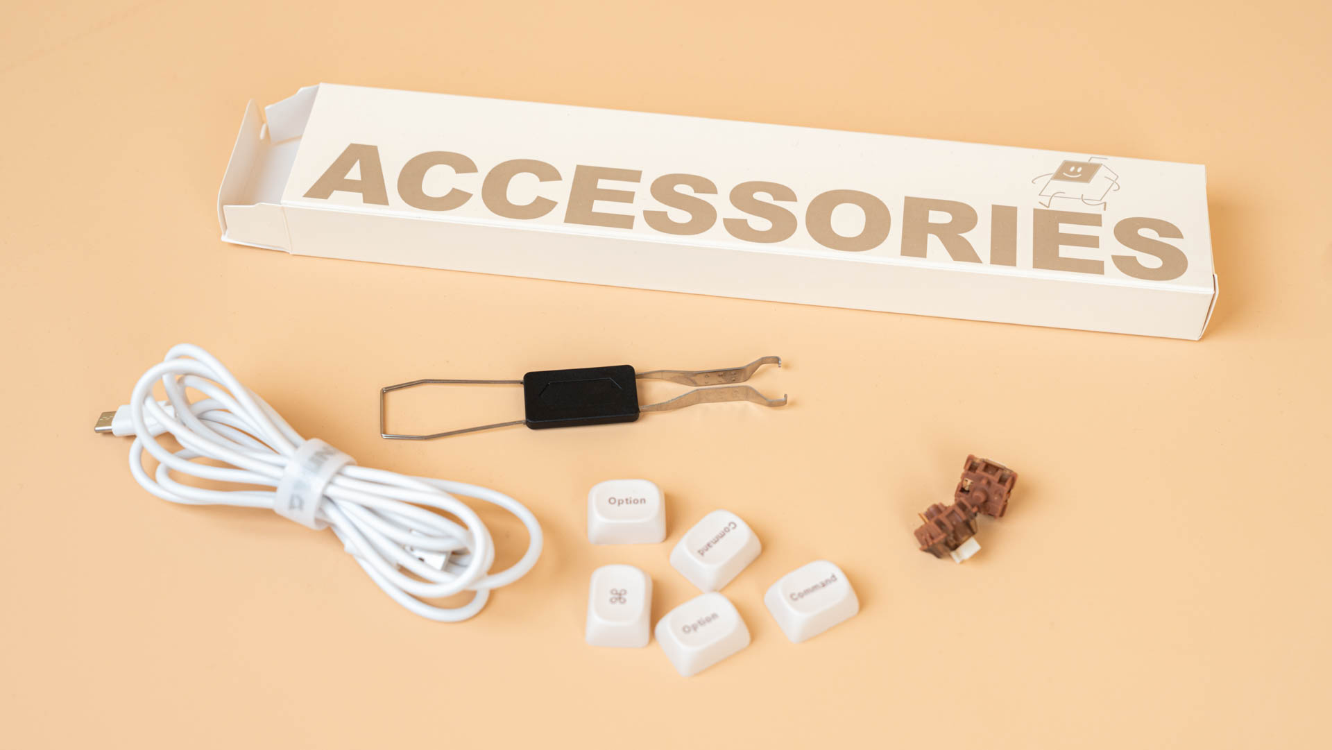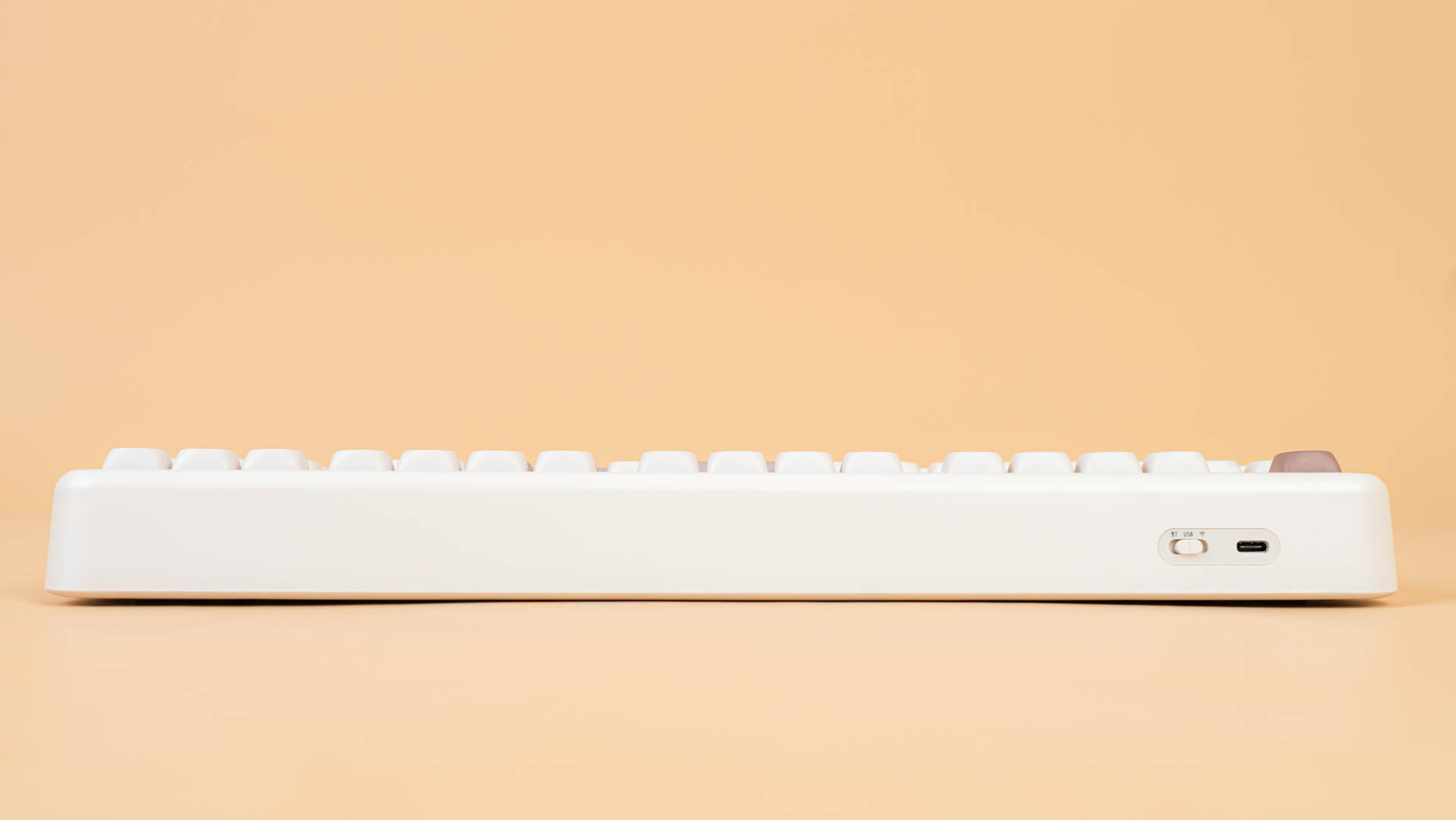 Клавиатура поставляется в плотной картонной коробке, поверх которой надета полноцветная обложка с изображением клавиатуры в выбранном цвете (в нашем случае — в элегантном светло-коричневом) и списком ключевых характеристик на английском языке. Такой подход сразу настраивает на премиальный лад и экономит время на поиск информации.