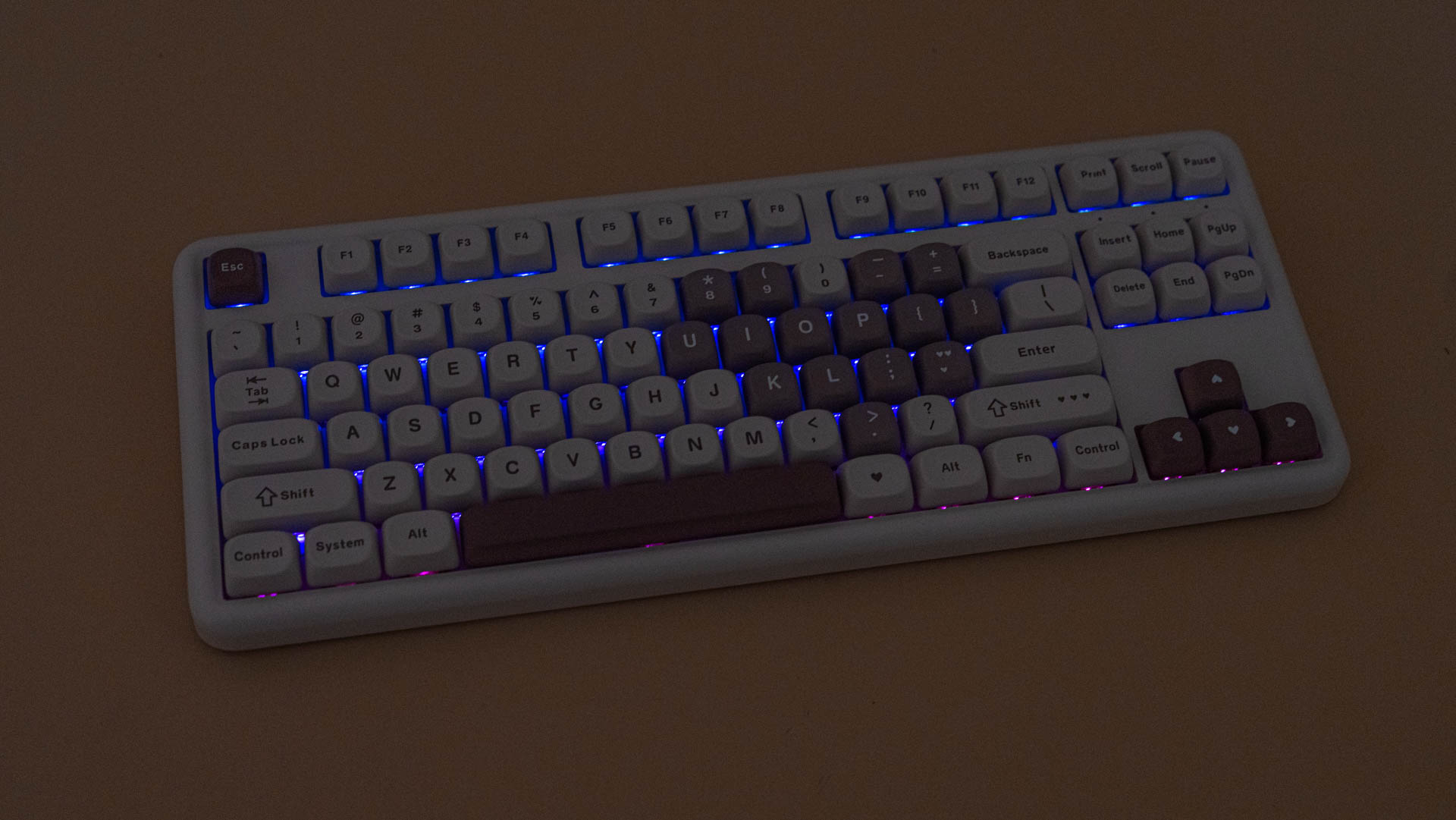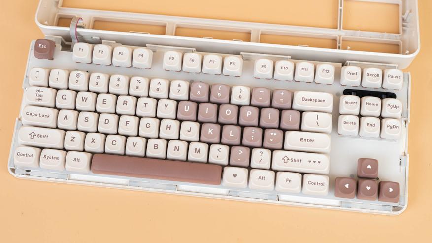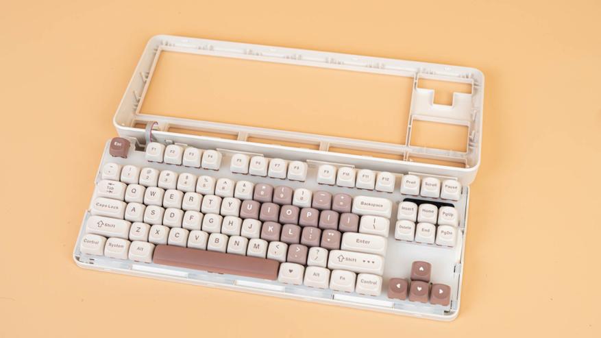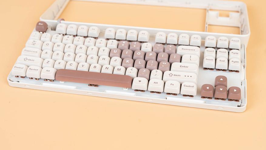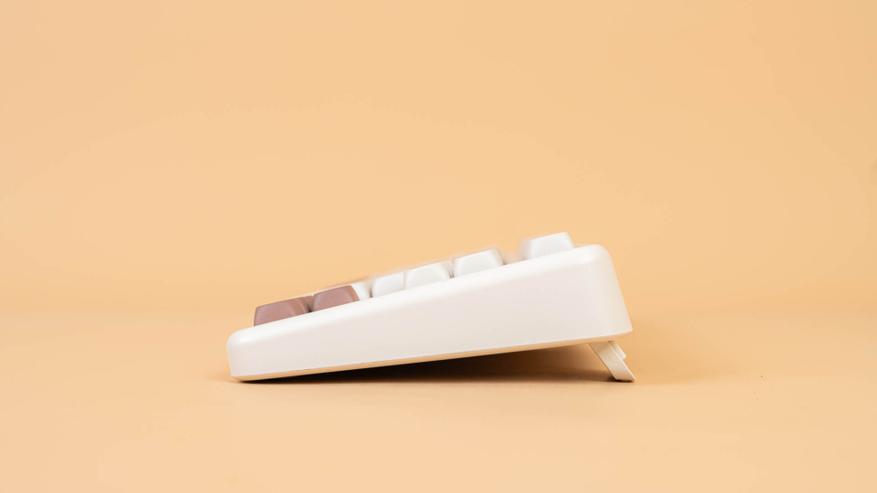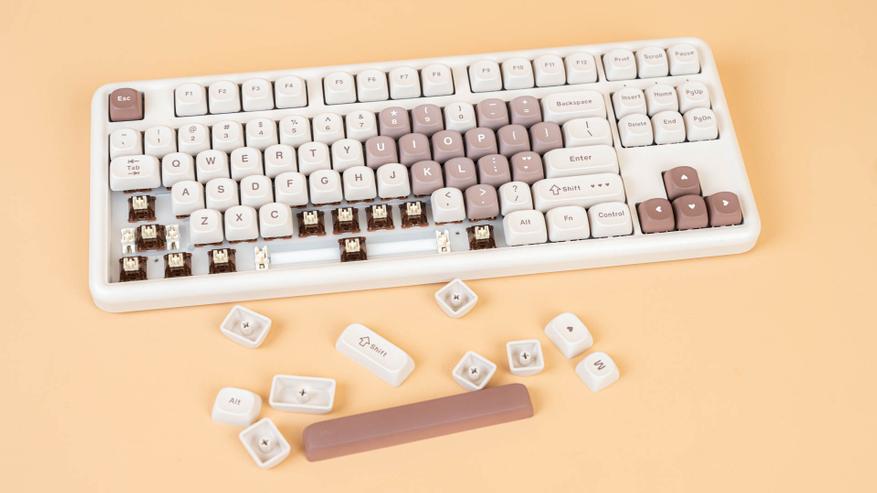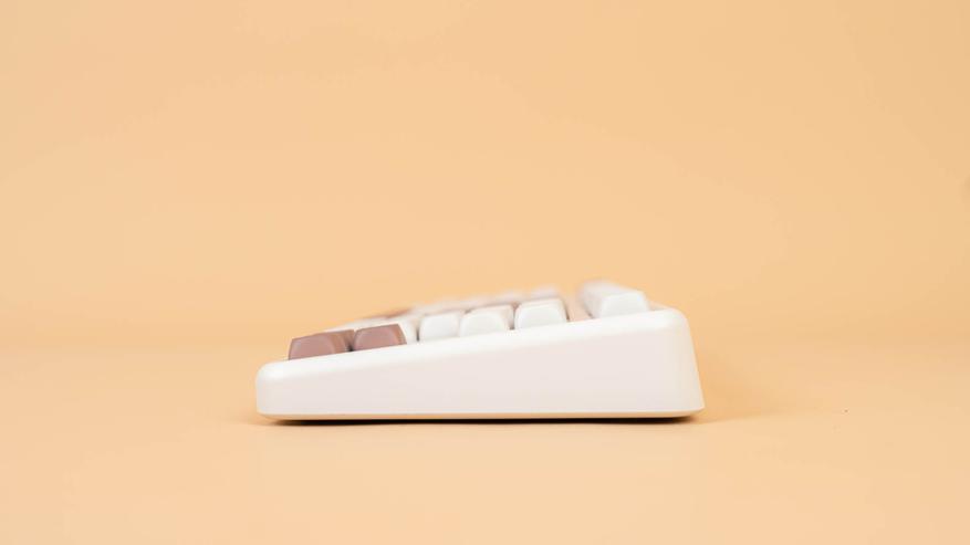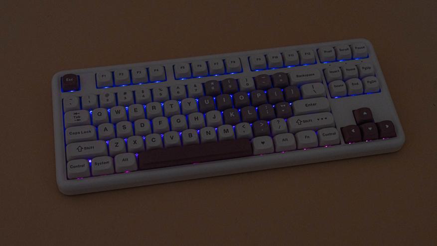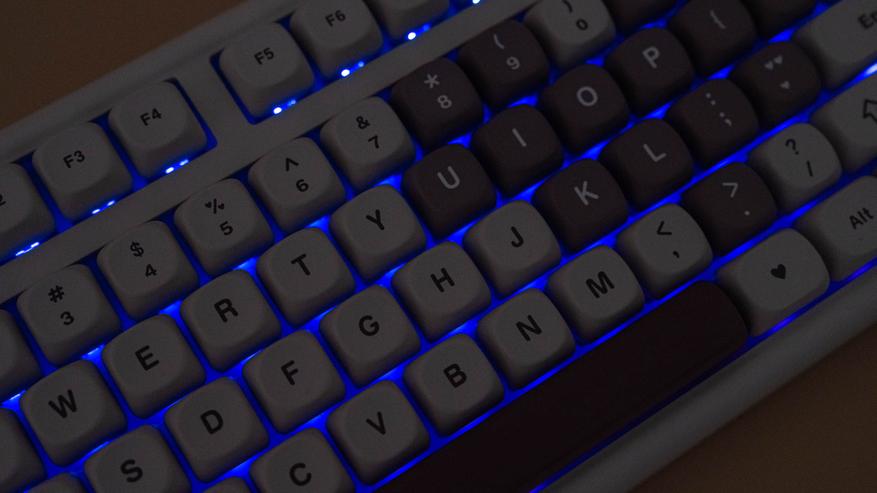 Клавиатура B87 имеет раскладку ANSI. Колпачки сделаны из прочного PBT-пластика с символами, нанесенными методом сублимации. Клавиши имеют профиль MOA, который задает их форму и высоту. К слову, под клавишей пробел присутствует шумопоглощающий материал, а в самой клавиши его нет.