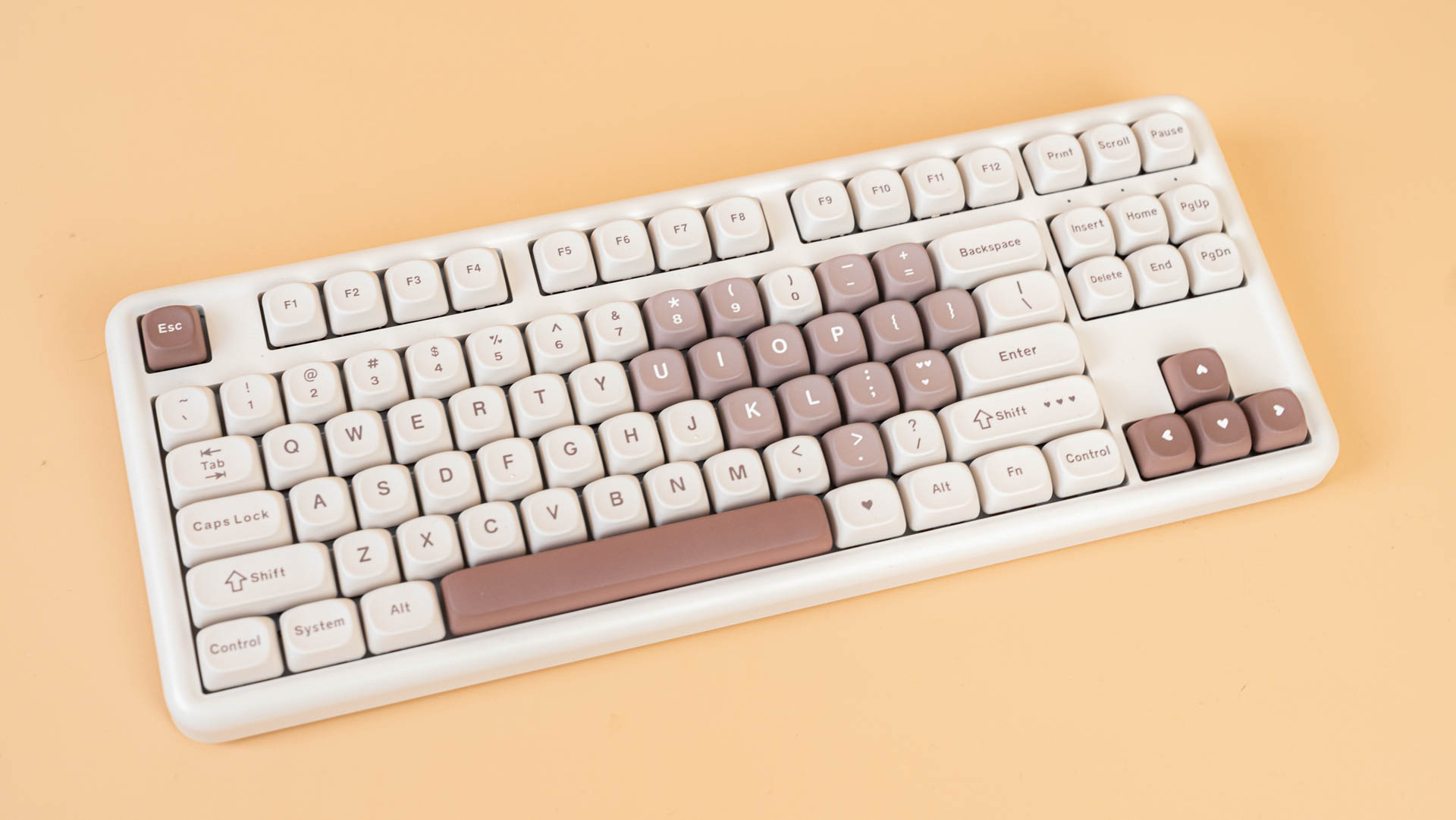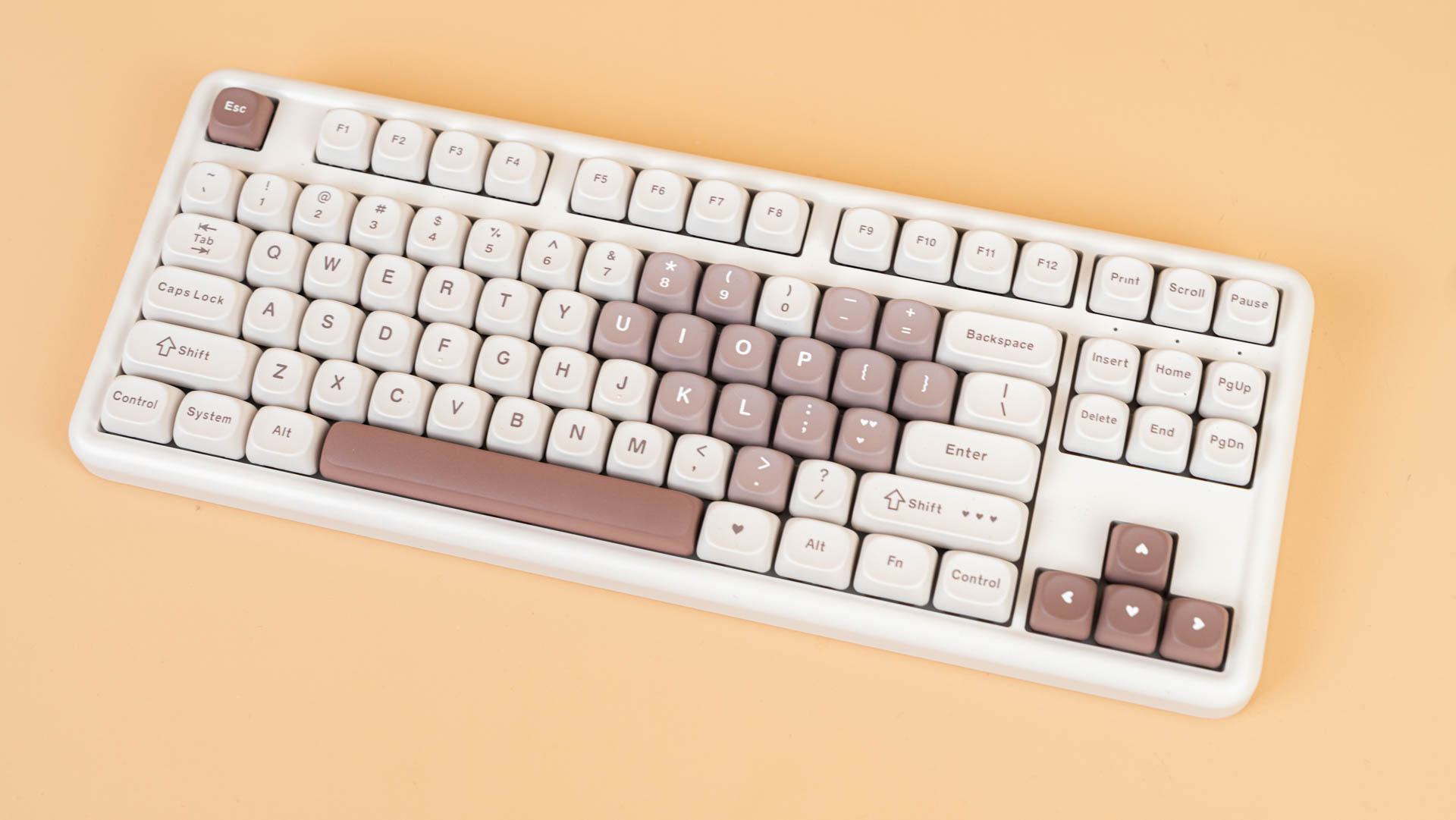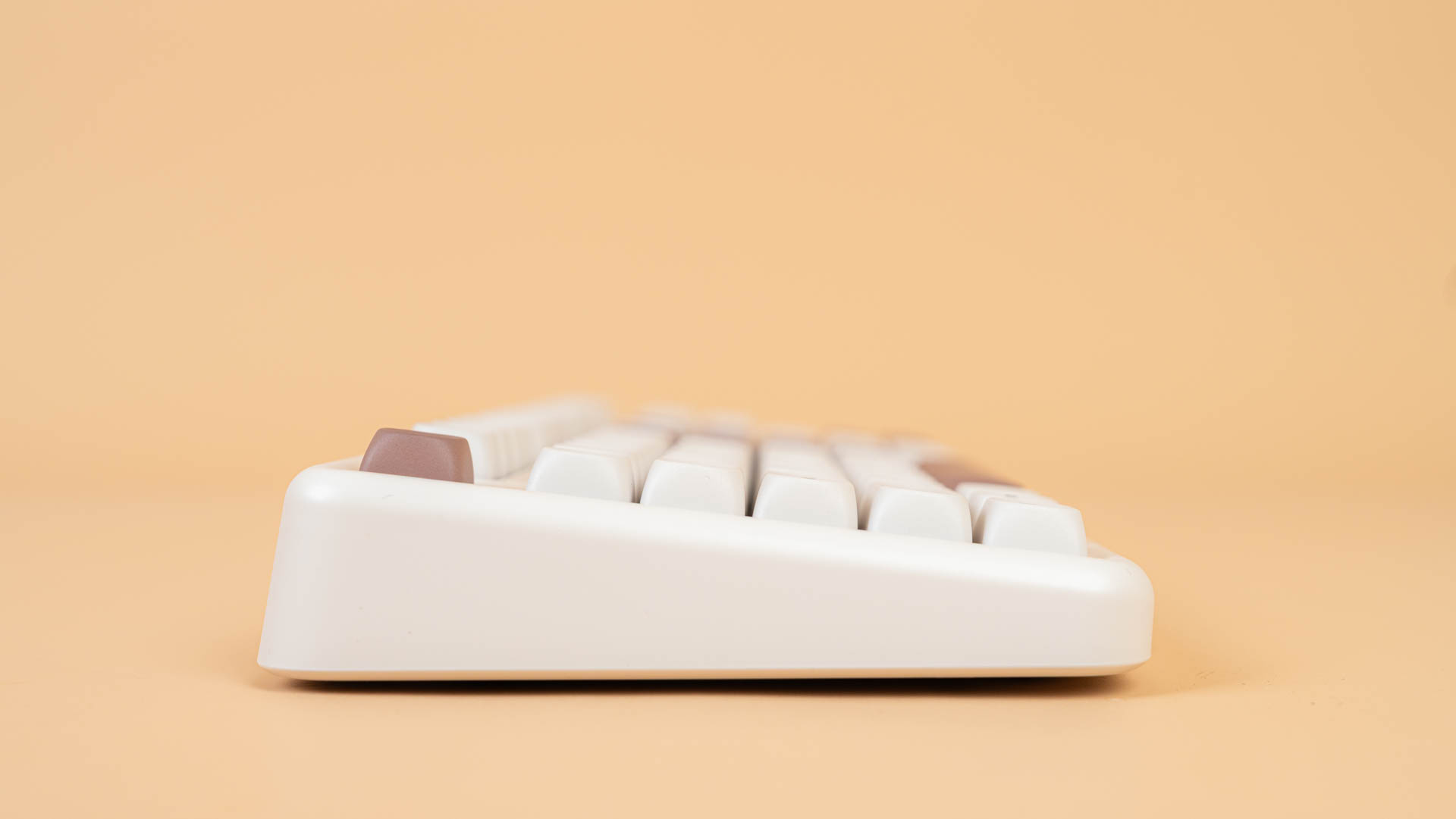 Клавиатура B87 имеет раскладку ANSI. Колпачки сделаны из прочного PBT-пластика с символами, нанесенными методом сублимации. Клавиши имеют профиль MOA, который задает их форму и высоту. К слову, под клавишей пробел присутствует шумопоглощающий материал, а в самой клавиши его нет.