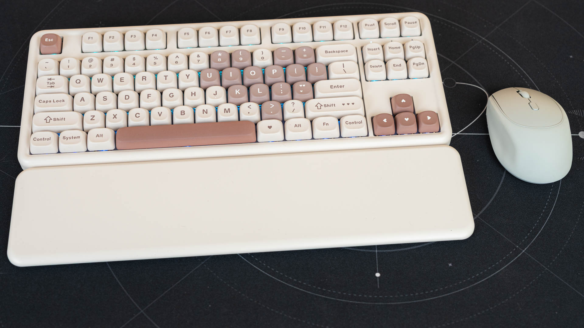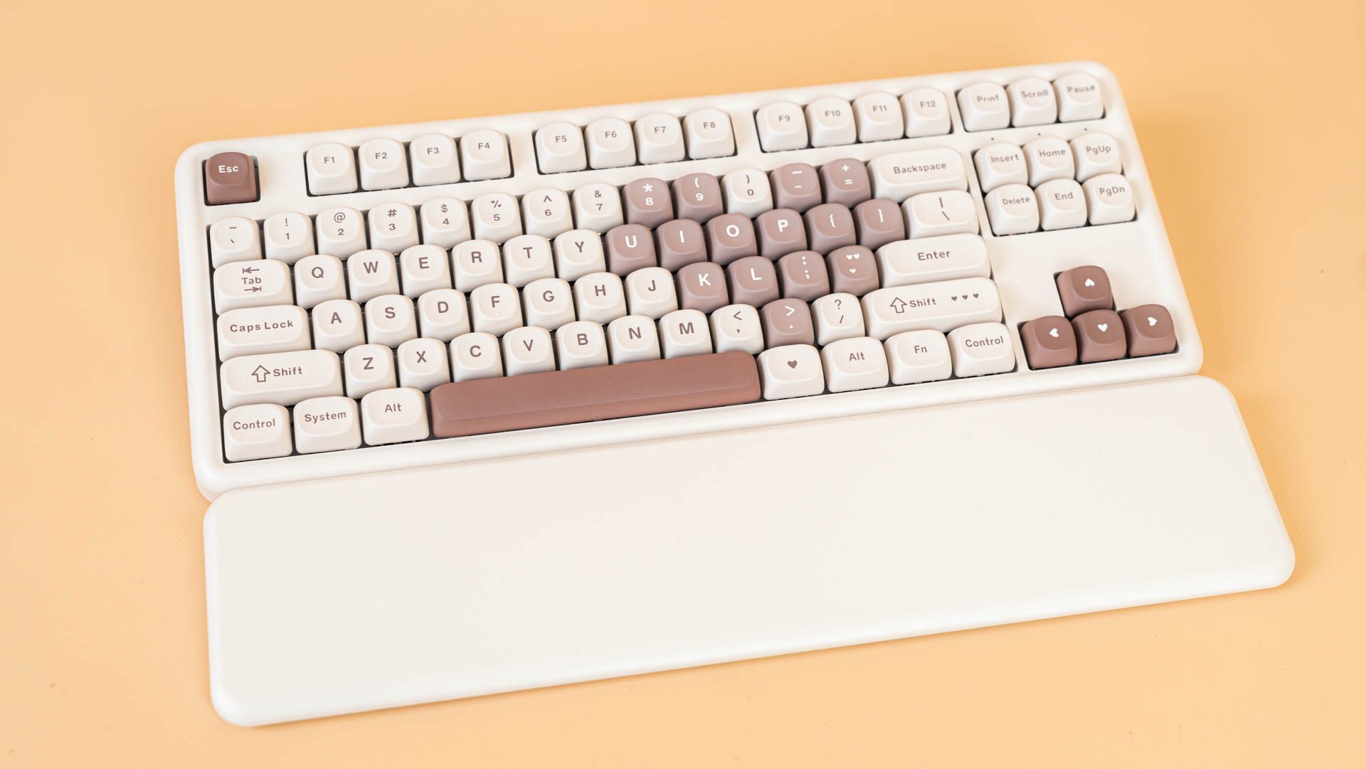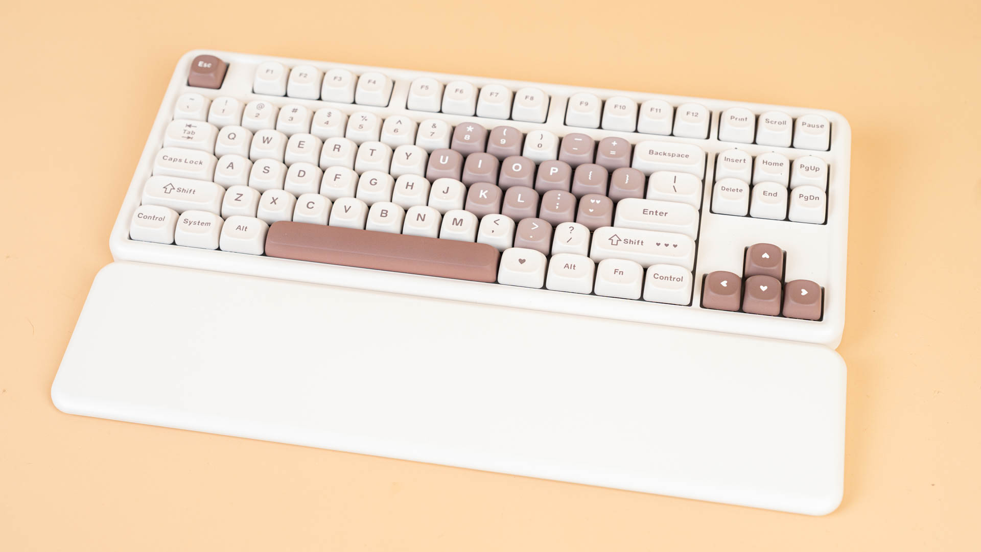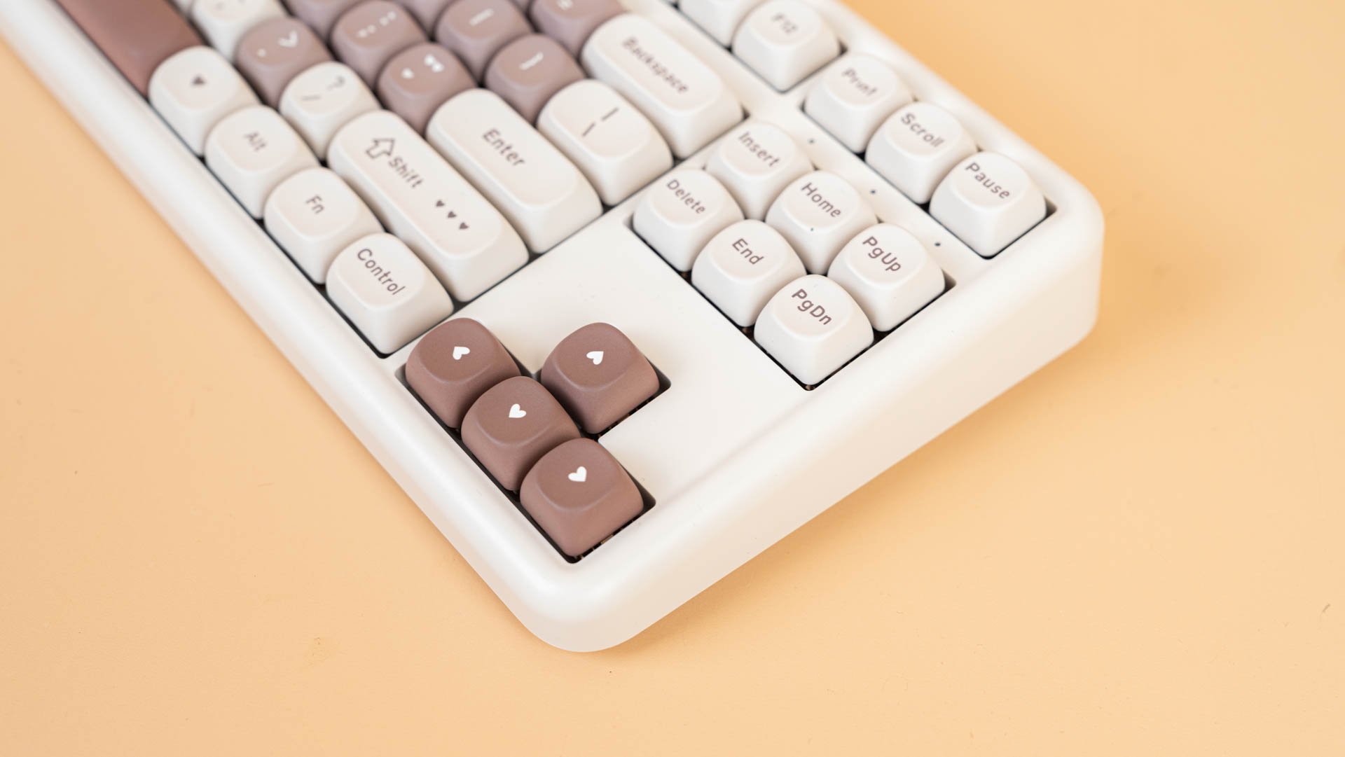 Клавиатура B87 имеет раскладку ANSI. Колпачки сделаны из прочного PBT-пластика с символами, нанесенными методом сублимации. Клавиши имеют профиль MOA, который задает их форму и высоту. К слову, под клавишей пробел присутствует шумопоглощающий материал, а в самой клавиши его нет.
