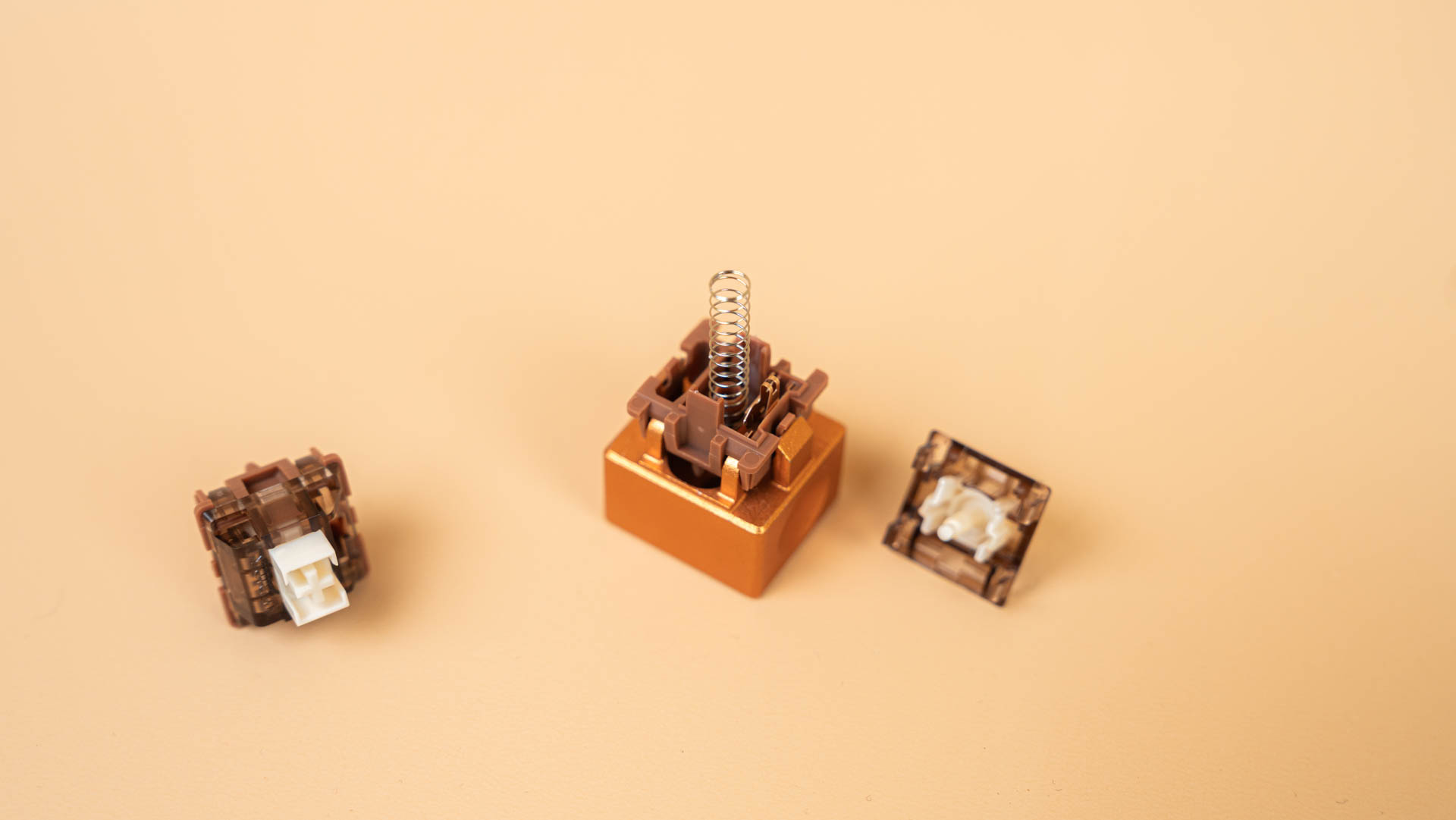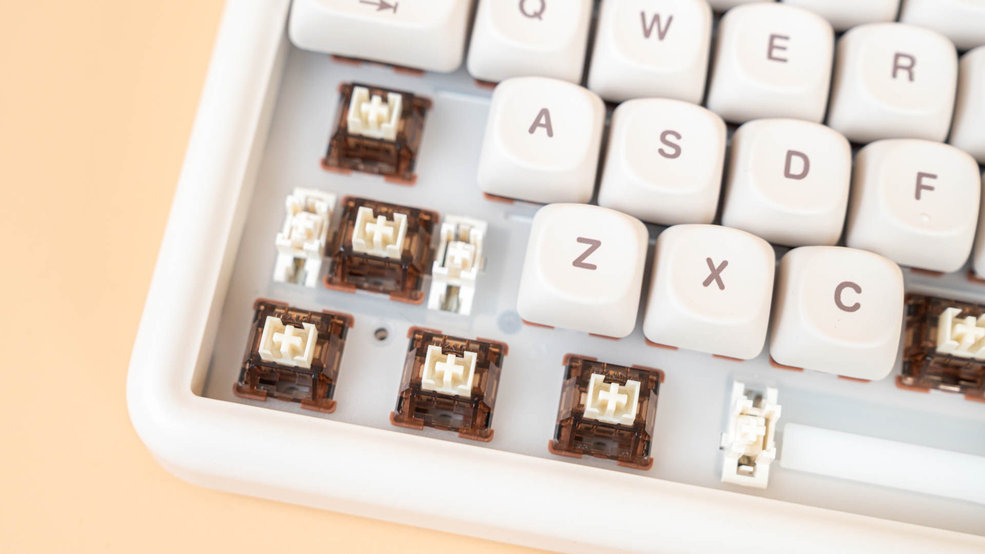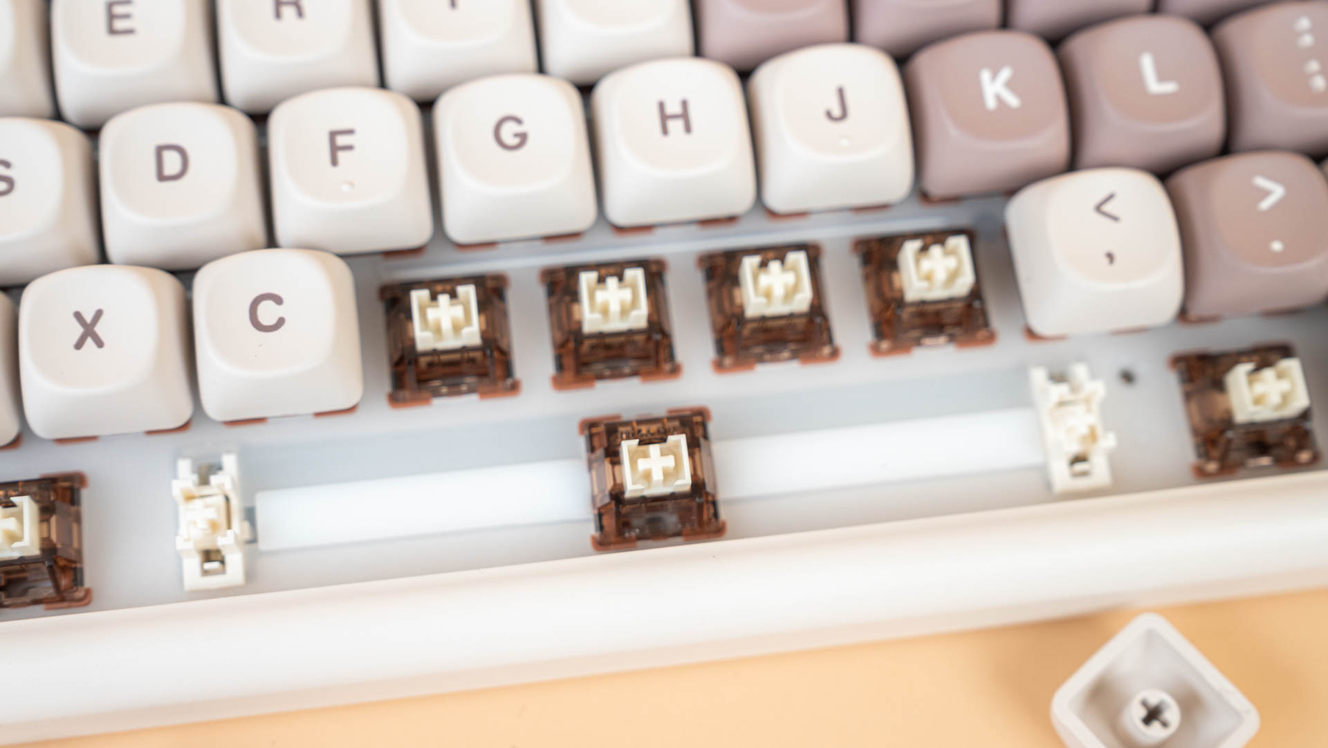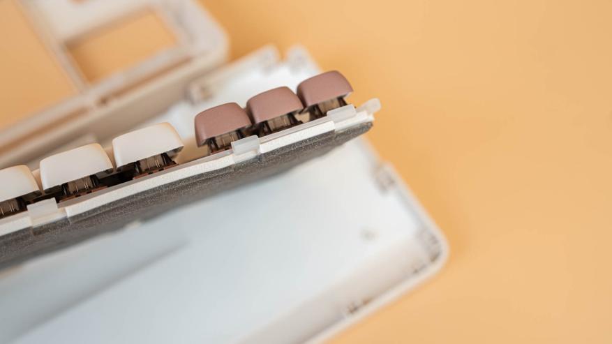 Под колпачками находятся линейные механические переключатели YUNZII Cocoa Cream V2. Переключатели выполнены в 5-пиновом форм-факторе для совместимости с платами, поддерживающими горячую замену, и оснащены стандартным крестообразным стержнем MX для установки клавишных колпачков. Прозрачный корпус обеспечивает эффективное рассеивание RGB-подсветки. Конструкция включает стержень из материала POM и корпус, состоящий из прозрачного верхнего элемента из поликарбоната и нижнего элемента из PA66 (нейлон). Рабочий ход переключателя YUNZII Cocoa Cream V2 составляет 2,0+-0,5 мм при общем ходе до 3,3 мм, а для срабатывания требуется усилие в 50+-10 gf. На заводе переключатели проходят предварительную смазку, которая способствует плавности работы.
