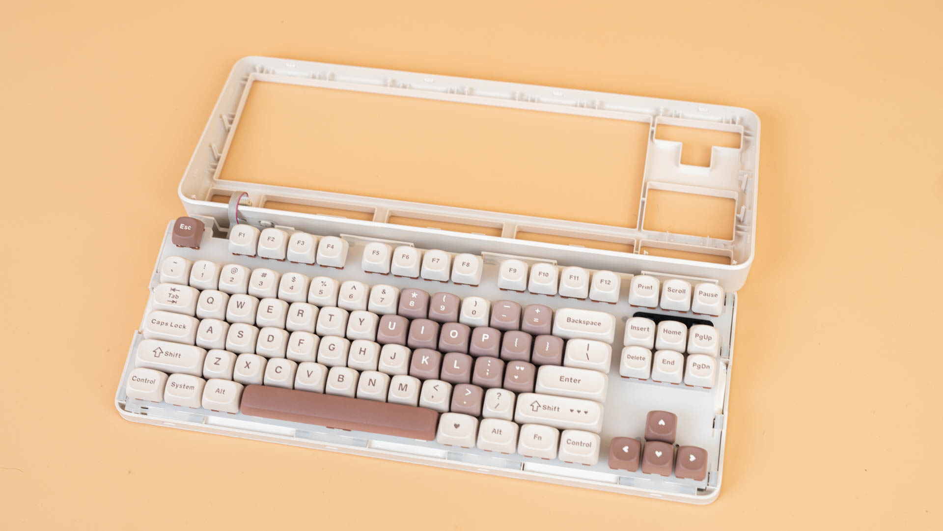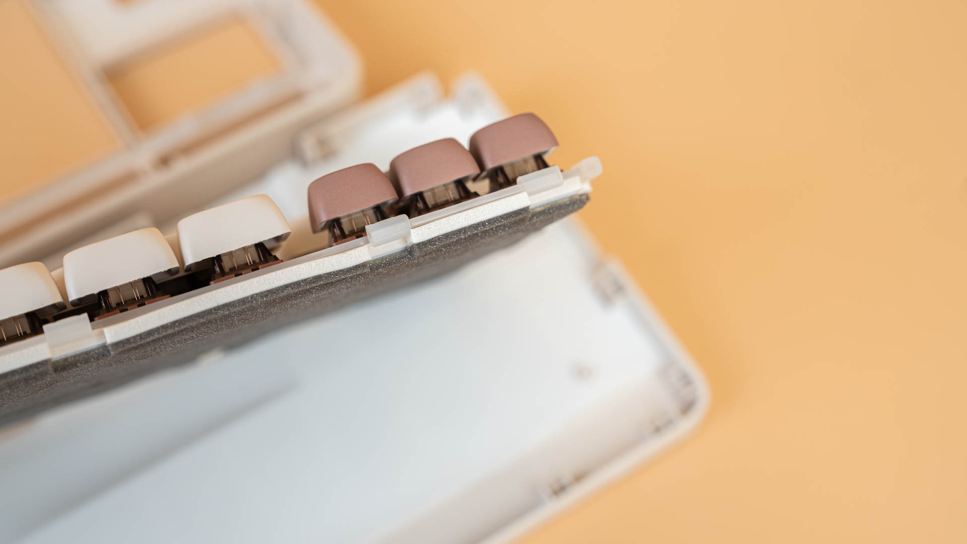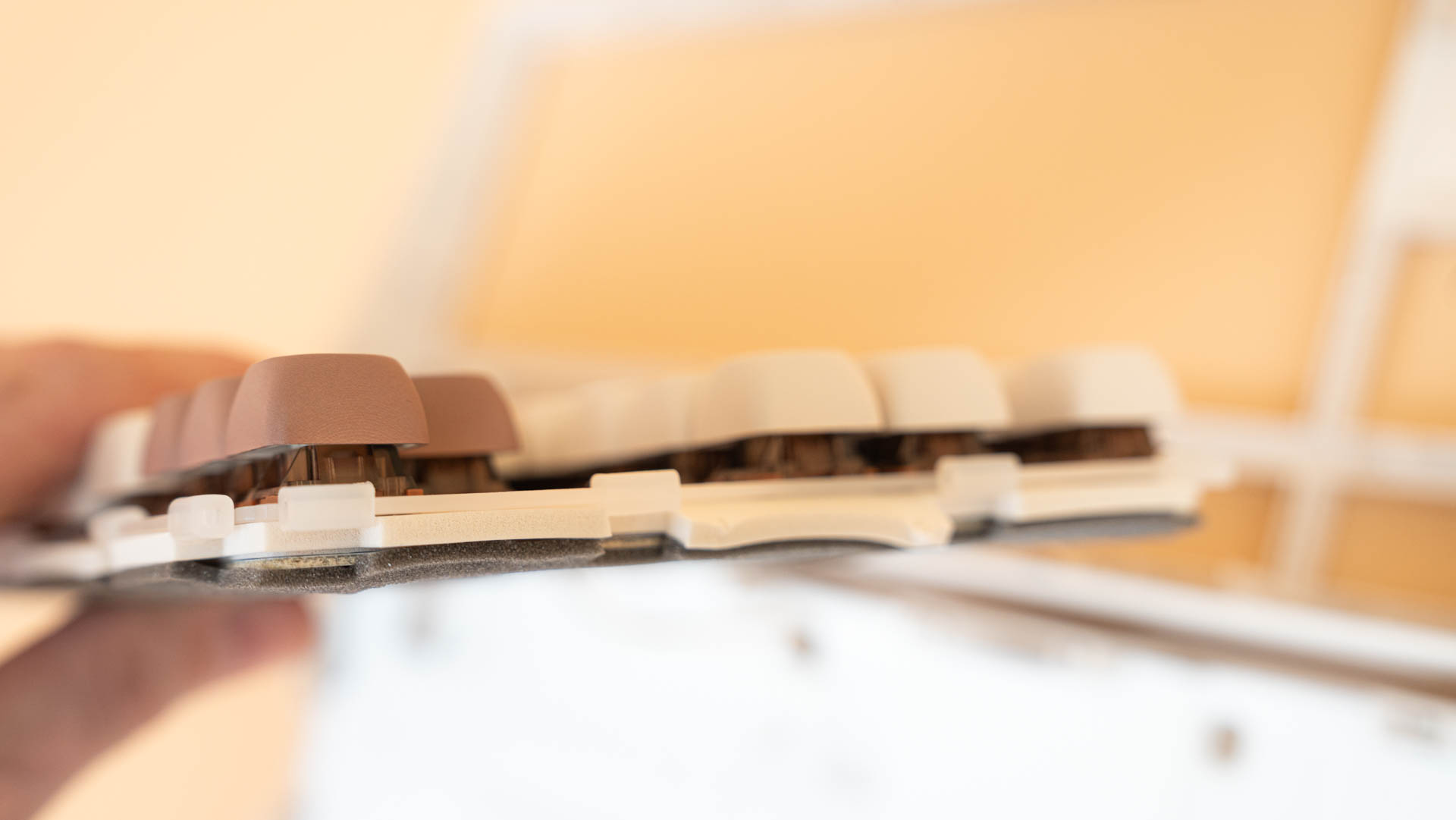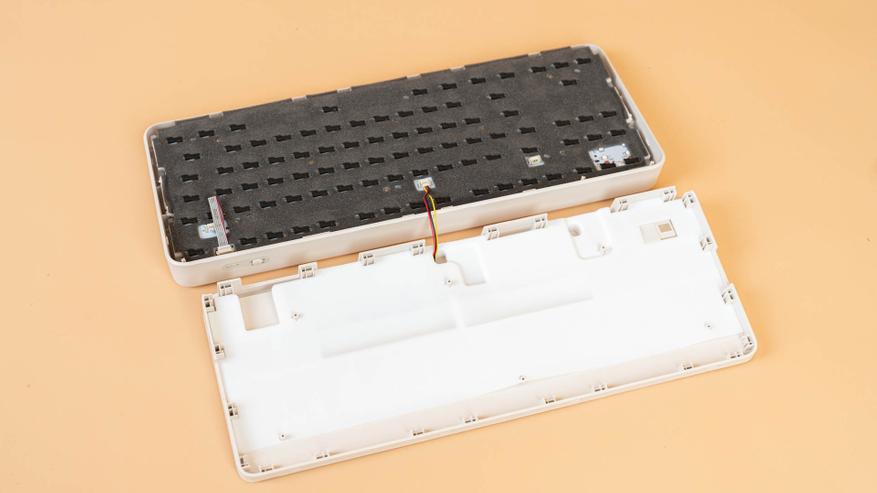 Внутри корпуса клавиатуры, подобно слоёному пирогу, располагается сложная система гашения звука и вибрации. В самом основании находится силиконовый демпфер, над которым покоится слой поролона, предназначенный для смягчения ударов переключателей. Выше располагается печатная плата, укрытая тонкой пеновой прослойкой, поверх которой лежит панель переключателя IXPE. Завершают эту конструкцию полиэтиленовая сэндвич-пена, плата из поликарбоната и, наконец, демпферная шайба (гаскет).