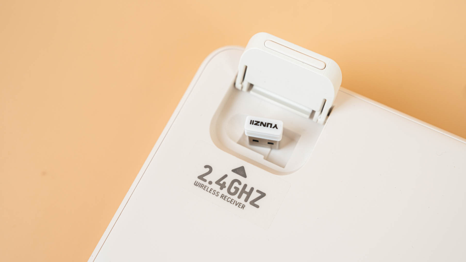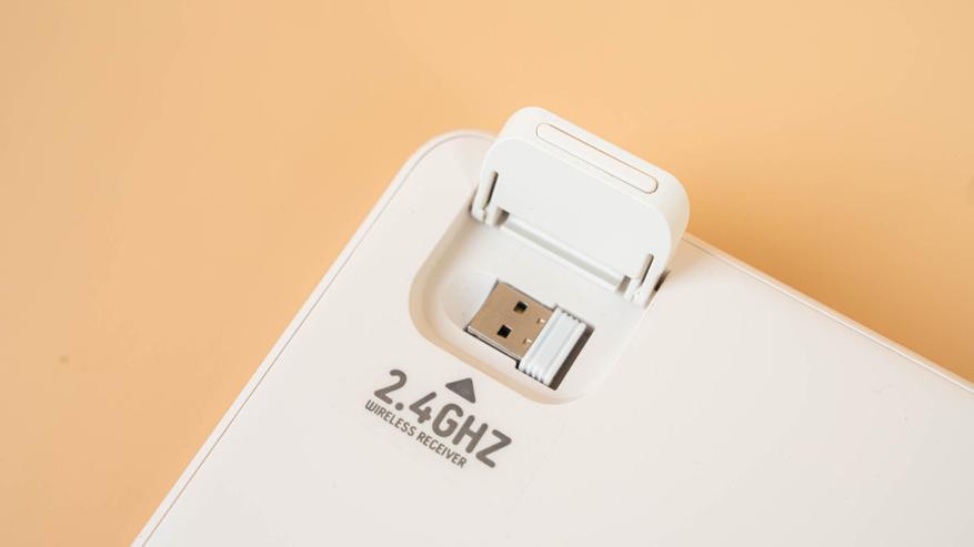Под левой регулируемой ножкой в нише спрятан передатчик 2,4 ГГц с магнитным фиксатором и выемкой под палец для удобного извлечения.