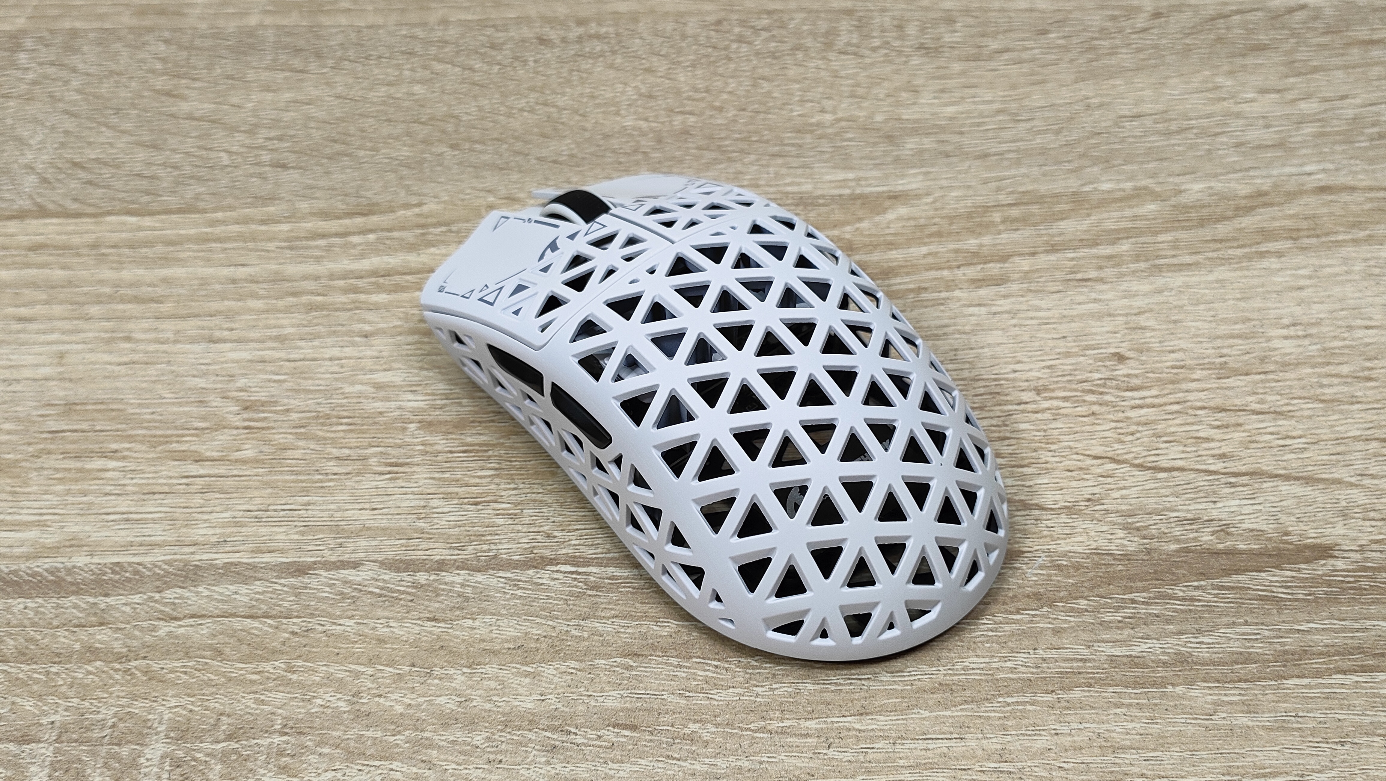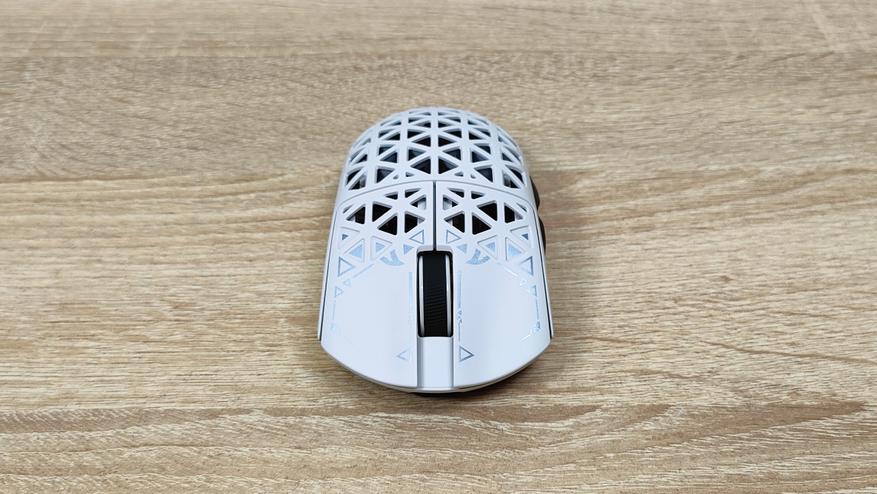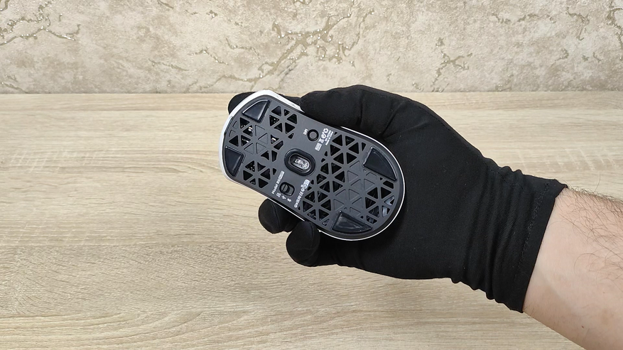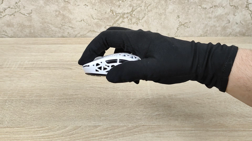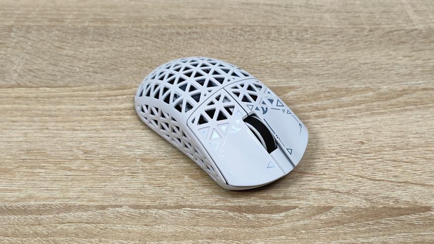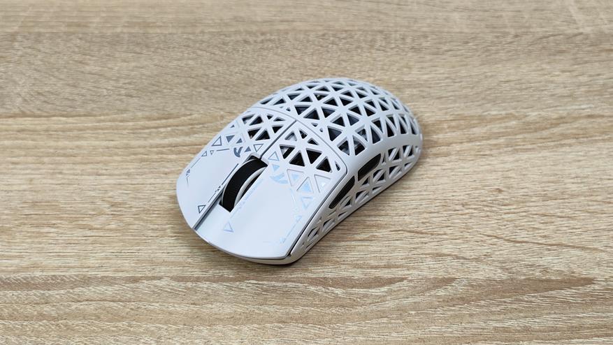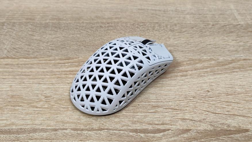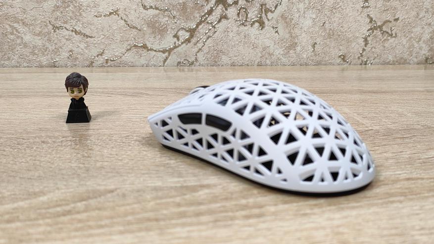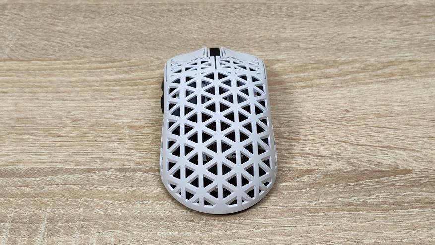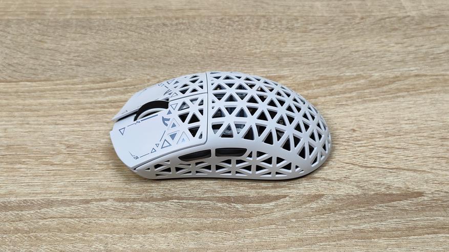 Указано, что мышь имеет корпус из углепластика, других подробностей нет, но хочется верить что кроме лёгкости у мыши есть и прочность. Сразу можно обратить внимание, что корпус весь перфорирован, а это означает, что к вопросу гигиены нужно будет подходить более плотно, так как несмотря на чистоплотность пользователя (допустим), внутрь все же будут попадать частички кожи пыль и так далее, поэтому лучше обзавестись хотя бы чем-то, чем можно продуть, например, воздуходувкой или баллончиком. Можно, конечно, воспользоваться собственными силами, заодно потренировать лёгкие и попытаться выдуть все пылинки. Форма у мыши распространённая, наверняка многие видели подобную у других брендов, но мышь такое устройство, что можно по отдельности брать все составляющие: корпус, переключатели, энкодер, сенсор, аккумулятор; и получать в больших количествах разные устройства, на разные кошелёк и нужды. В данном случае используется хороший лёгкий корпус, а также хороший сенсор.