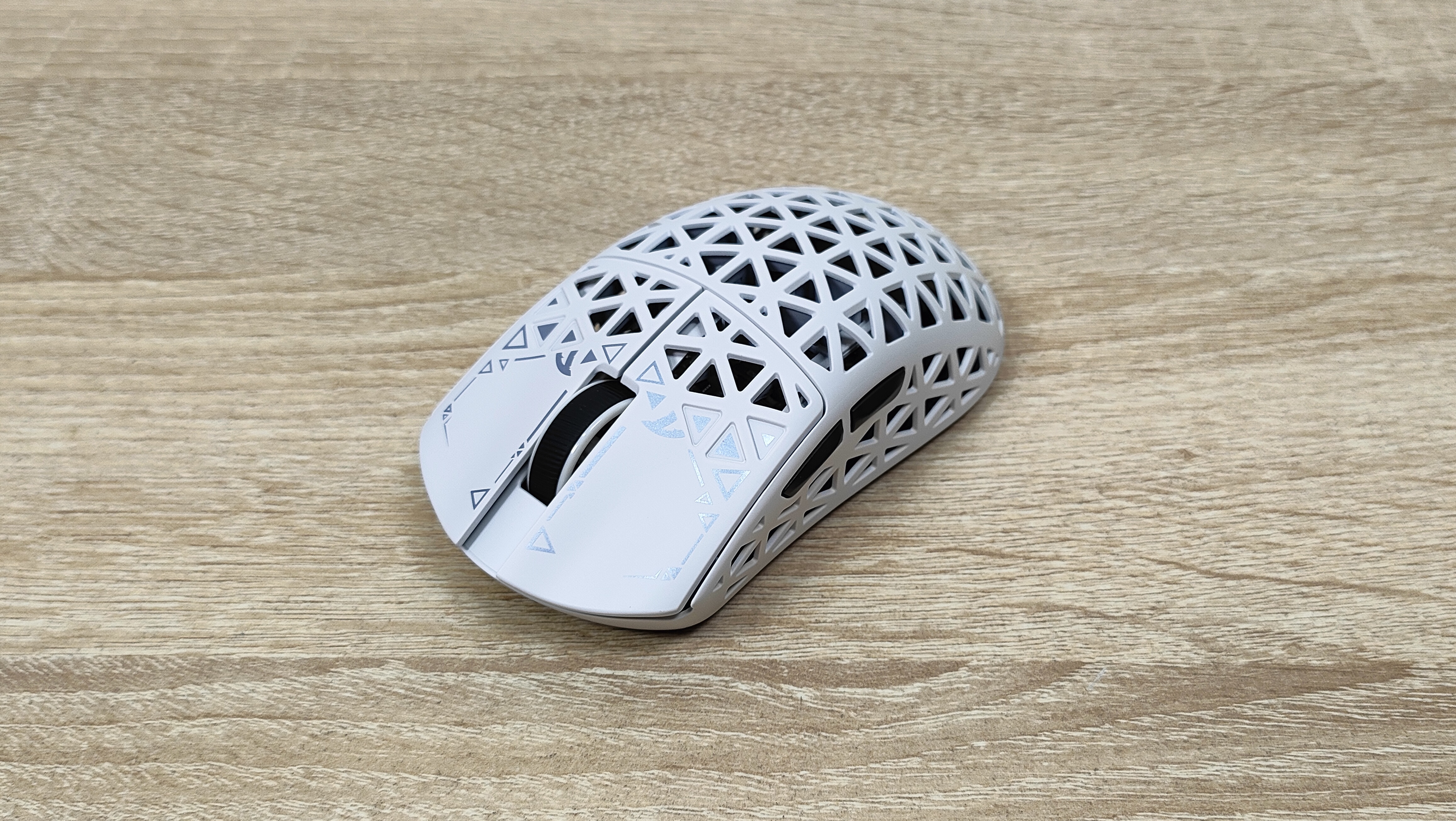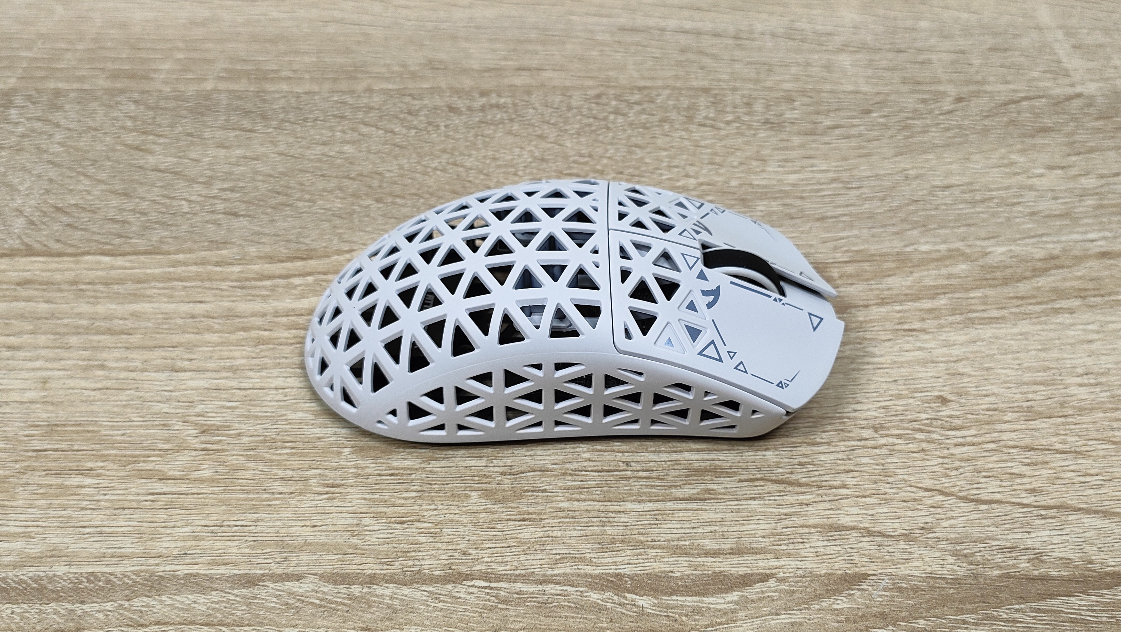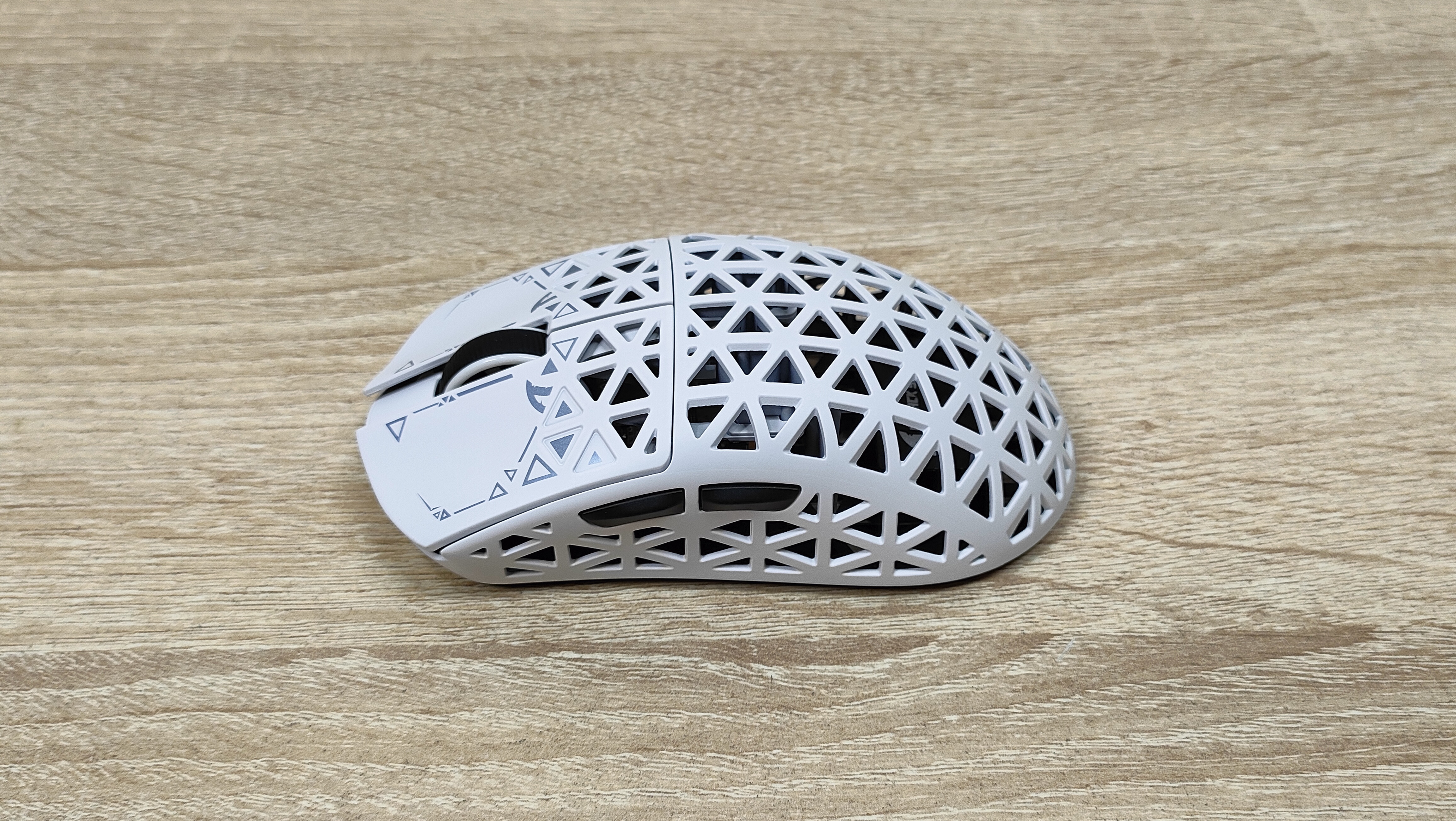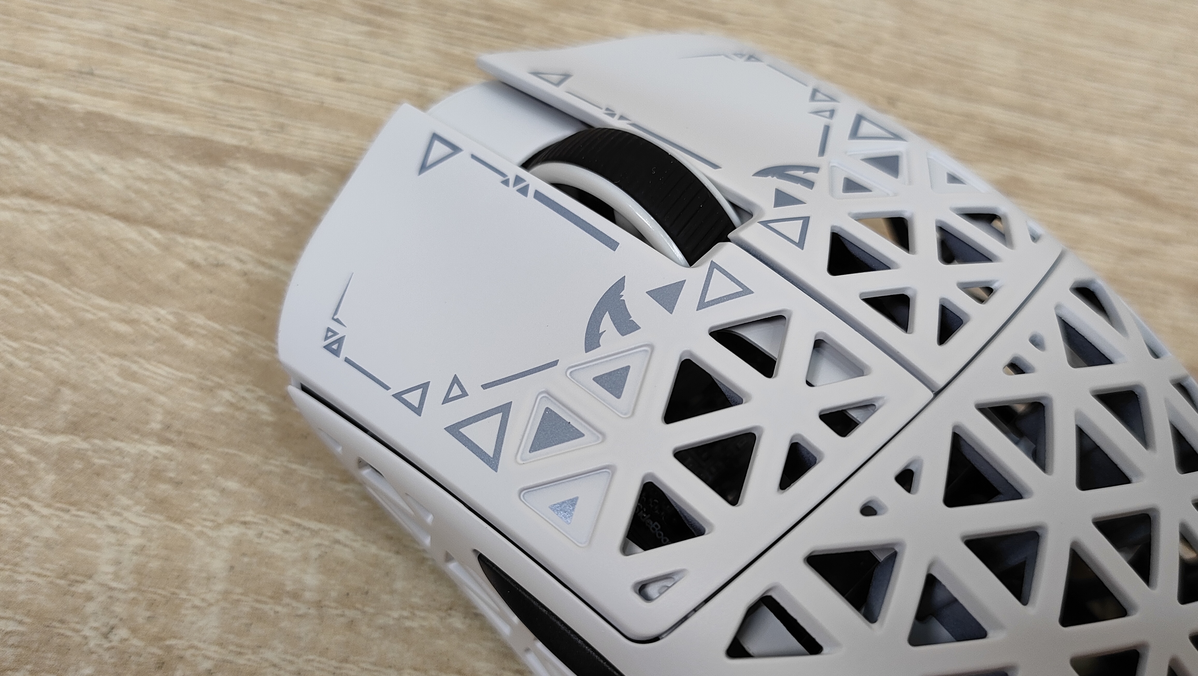 Указано, что мышь имеет корпус из углепластика, других подробностей нет, но хочется верить что кроме лёгкости у мыши есть и прочность. Сразу можно обратить внимание, что корпус весь перфорирован, а это означает, что к вопросу гигиены нужно будет подходить более плотно, так как несмотря на чистоплотность пользователя (допустим), внутрь все же будут попадать частички кожи пыль и так далее, поэтому лучше обзавестись хотя бы чем-то, чем можно продуть, например, воздуходувкой или баллончиком. Можно, конечно, воспользоваться собственными силами, заодно потренировать лёгкие и попытаться выдуть все пылинки. Форма у мыши распространённая, наверняка многие видели подобную у других брендов, но мышь такое устройство, что можно по отдельности брать все составляющие: корпус, переключатели, энкодер, сенсор, аккумулятор; и получать в больших количествах разные устройства, на разные кошелёк и нужды. В данном случае используется хороший лёгкий корпус, а также хороший сенсор.