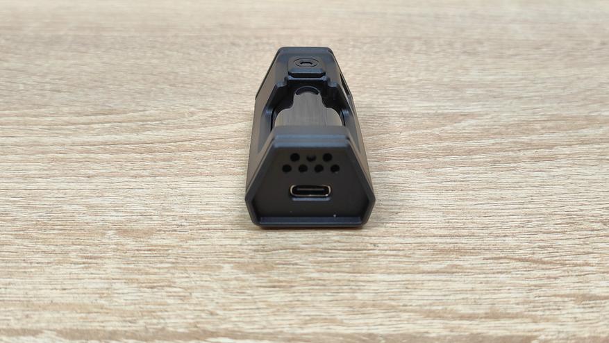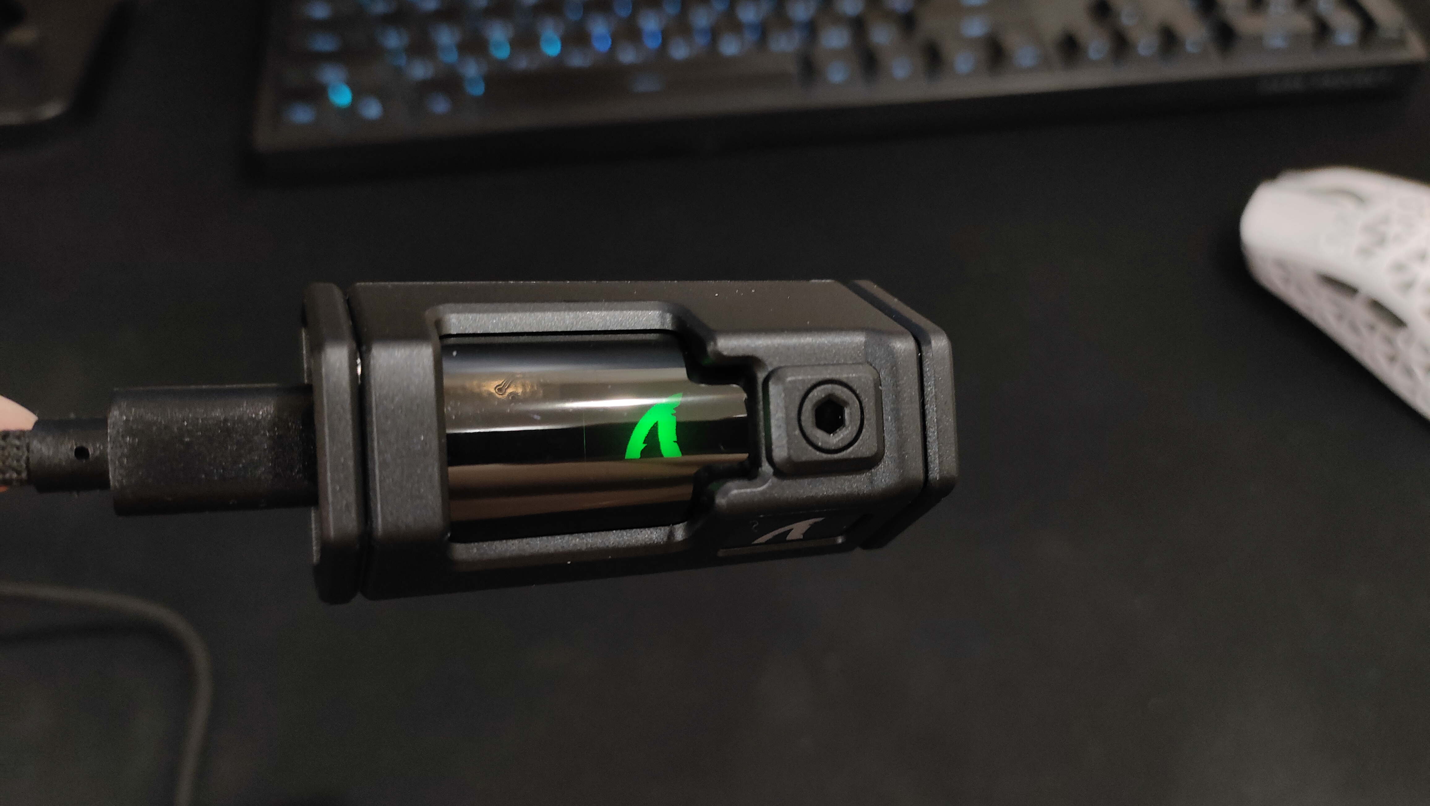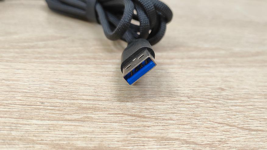 Как и у многих современных устройств, 8К приёмопередатчик имеет крупное исполнение, но в данном случае он ещё и симпатичен. Мне он почему-то напоминает какую-то цистерну из игры, в которой должна быть обязательно какая-то жидкость ядовитого цвета, где находится какой-нибудь монстр. Возможно, это я такой странный, но какой есть, мне с этим жить. В любом случае, выглядит не так как у всех, а ещё я предполагаю, что у этой штуки есть подсветка и, возможно, она как-то красиво подсвечивается. Кабель средней жесткости, соответственно с небольшим эффектом памяти, учитывая низкий вес мыши, лучше его предварительно расправить и проложить, чтобы потом он не тянул и не толкал мышь.