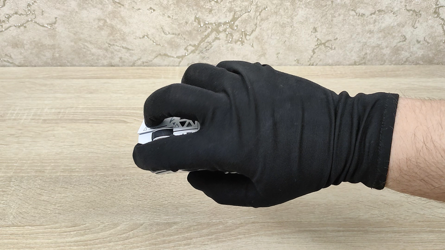 Мышь для руки средних размеров, возможно, даже некоторые крупные ладони будут комфортно себя чувствовать на данном устройстве. Малый вес (у меня весы показали 42 г) в сочетании с тефлоновыми ножками очень хорошо управляется и мышь легко скользит по поверхности. Баланс у мыши также хороший и при удержании двумя пальцами примерно по центру, она не перевешивает в ту или иную сторону.