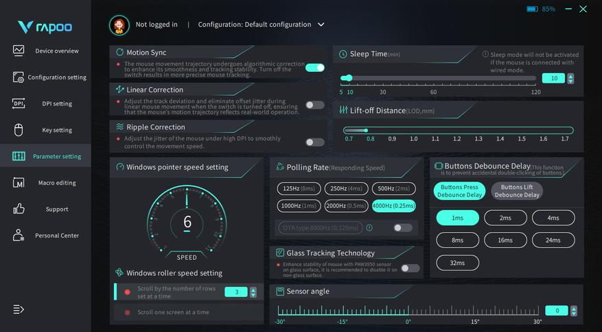 Здесь стандартные функции: настройка DPI, переназначение кнопок (включая макросы) и частоты опроса. Плюс интересные фичи, вроде регулировки Lift-Off — то есть, на какой высоте отрыва мышь перестает регистрировать движения. Есть и спорные улучшения, такие как коррекция траектории при дрожании. Также можно задать время перехода в спящий режим. Через ПО обновляется прошивка приемника и мыши. Устройство имеет встроенную память, так что настройки сохраняются в мыши и не сбрасываются при подключении к другому ПК.
