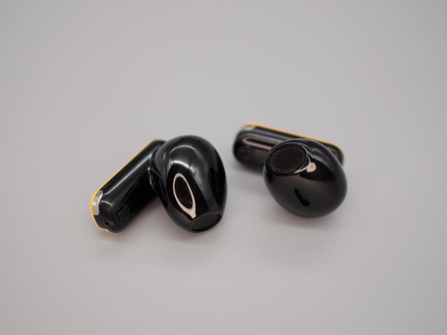 В нижней части каждого наушника находятся глянцевые металлические парные контактные площадки для зарядки в кейсе Рядом располагается отверстие микрофона.