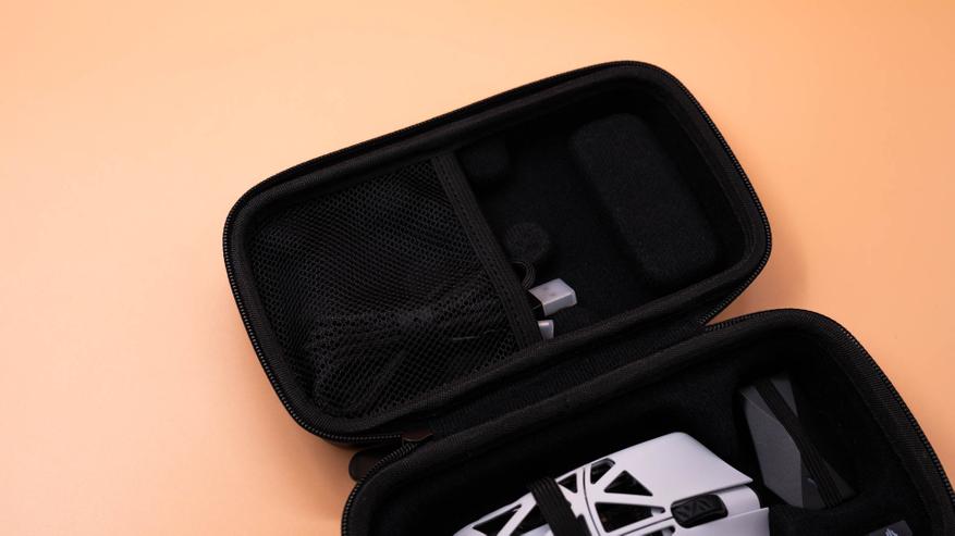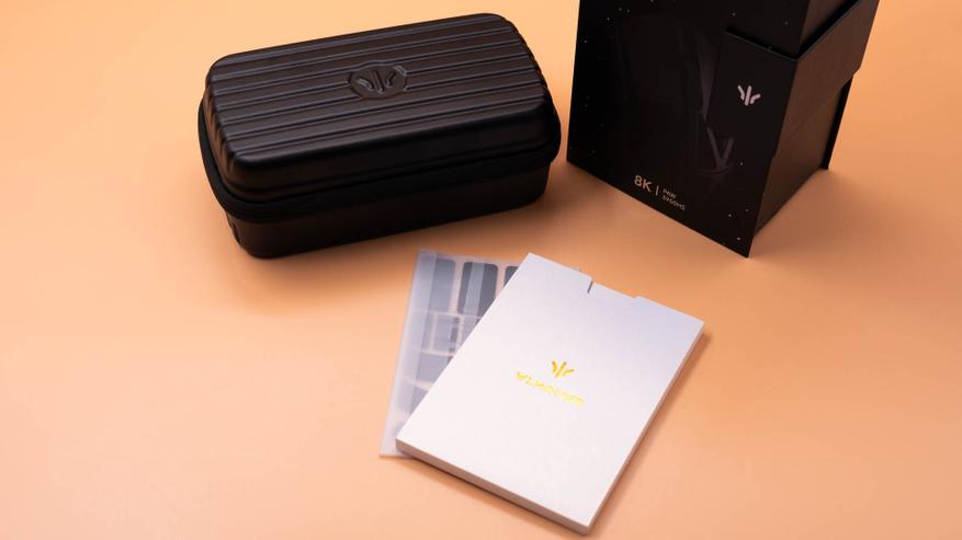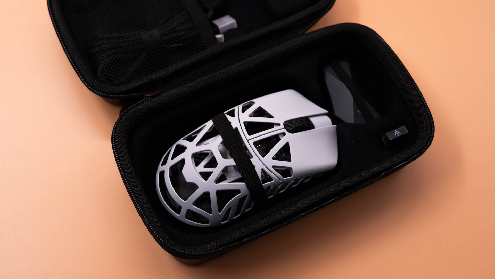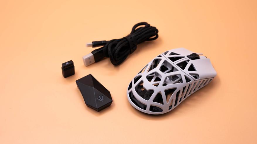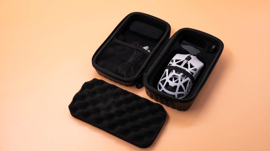 Сразу при вскрытии коробки взгляду открывается прочный чехол-кейс на молнии, внутри которого аккуратно размещены все компоненты комплектации: сама мышка, два беспроводных приемника (8K и стандартный 1K донгл), паракордовый кабель USB-C. Чехол-кейс не просто является элементом презентации, но и предлагает удобное и надежное решение для транспортировки и хранения устройства со всеми аксессуарами, что добавляет ценности всему продукту.