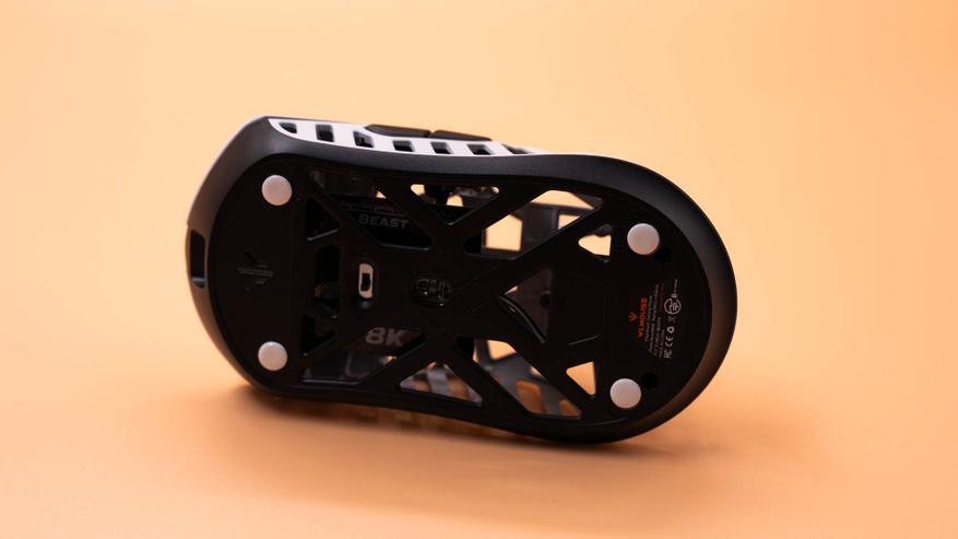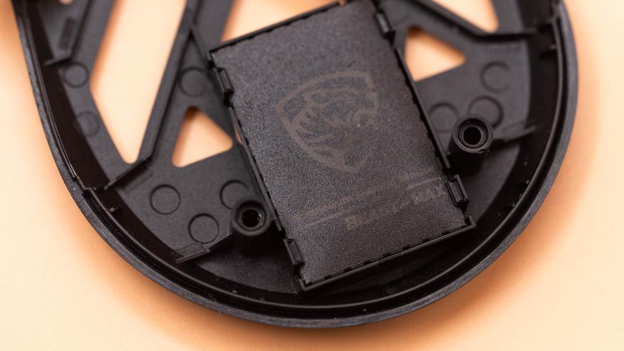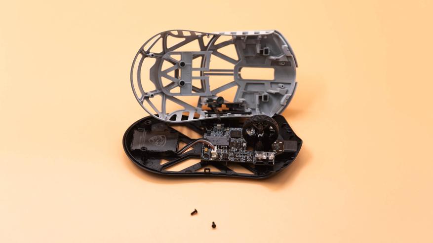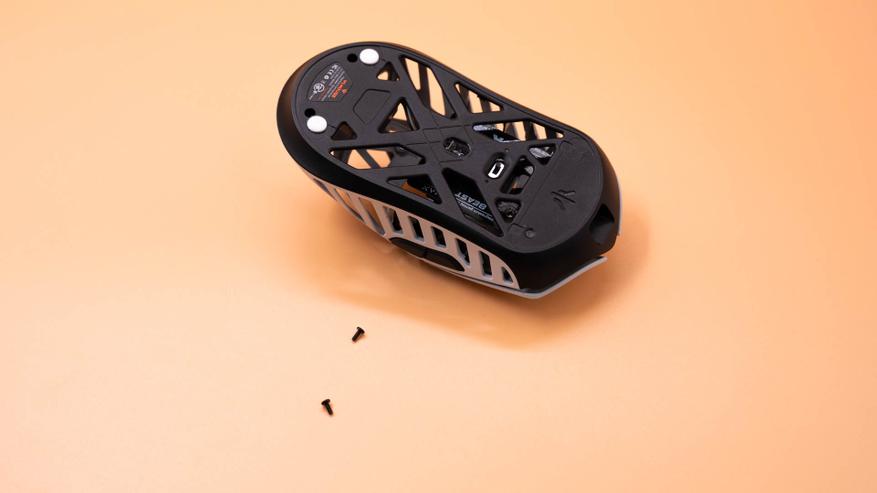 Корпус мышки WLmouse Beast X Max разбирается через основание, где расположены два крепежных винта. Две части корпуса дополнительно фиксируется двумя защелками по периметру, что требует их аккуратного разделения с помощью тонкого неметаллического инструмента.
