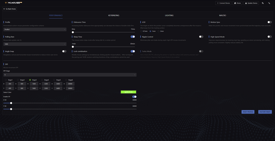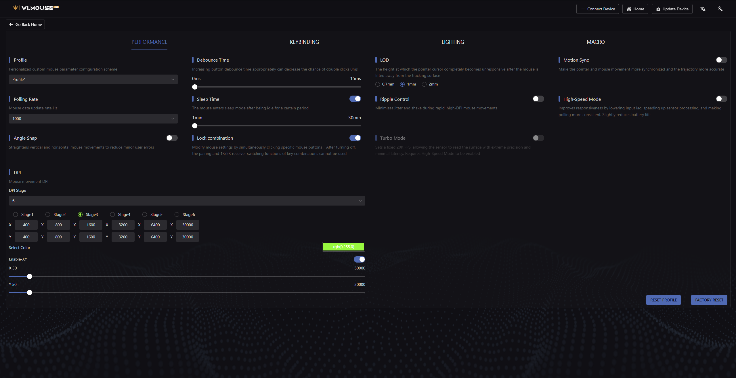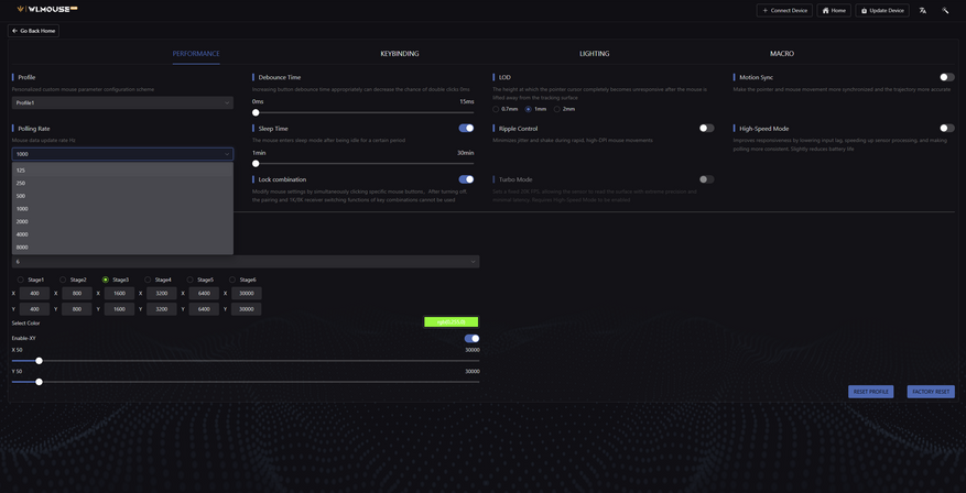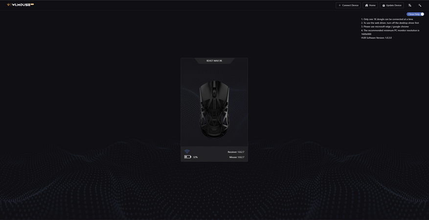 Для настройки мыши WLmouse Beast X Max используется веб-интерфейс. Это позволяет изменять её параметры с любого компьютера в сети Интернет без установки дополнительного программного обеспечения. Интерфейс обеспечивает удобный доступ ко всем настройкам устройства. Дополнительными достоинствами веб-интерфейса являются независимость от операционной системы и постоянное развитие функциональных возможностей за счёт облачных обновлений.