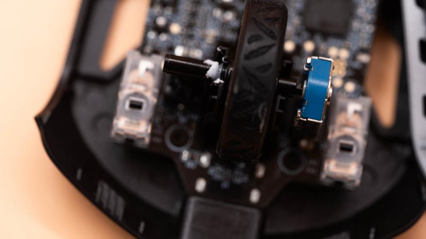 Колесо прокрутки имеет полую конструкцию и протектор с диагональным рисунком. Прокрутка осуществляется с небольшим усилием, обеспечивая четкие тактильные отсечки. Механизм смазан, а звук его работы напоминает трещетку средней громкости.