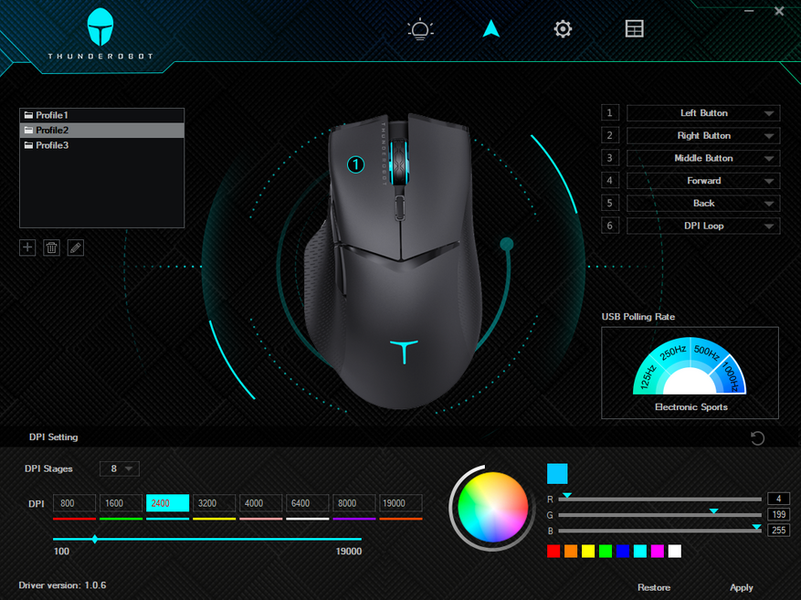 В следующей вкладке, настраивается DPI. Минимальное значение 100 DPI, а максимальное 19000 DPI. Шаг настройки идёт в 100 DPI. Для каждого режима, можно установить любой цвет свечения. Кстати колесико и буква «Т» как раз светится постоянно выбранным цветом, для установленного DPI.