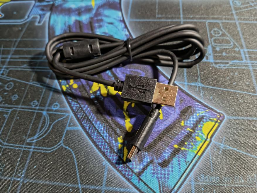 В передней части установлен популярный Type-c разъём, с помощью которого мыша заряжается. Комплектный кабель имеет длину 1.6 метра, а для подавлении высокочастотных помех предусмотрен фильтр. Кабель мягкий, но без тканевой оплетки. Я думаю этим кабелем пользоваться мало кто будет, ведь мышка беспроводная, если только для зарядки. Я убрал его обратно в коробку, так как на столе всегда лежит зарядка от смартфона, с таким же разъёмом. Кстати если у вас разрядилась мышка и вы ее поставили на зарядку, то ей можно продолжать пользоваться.