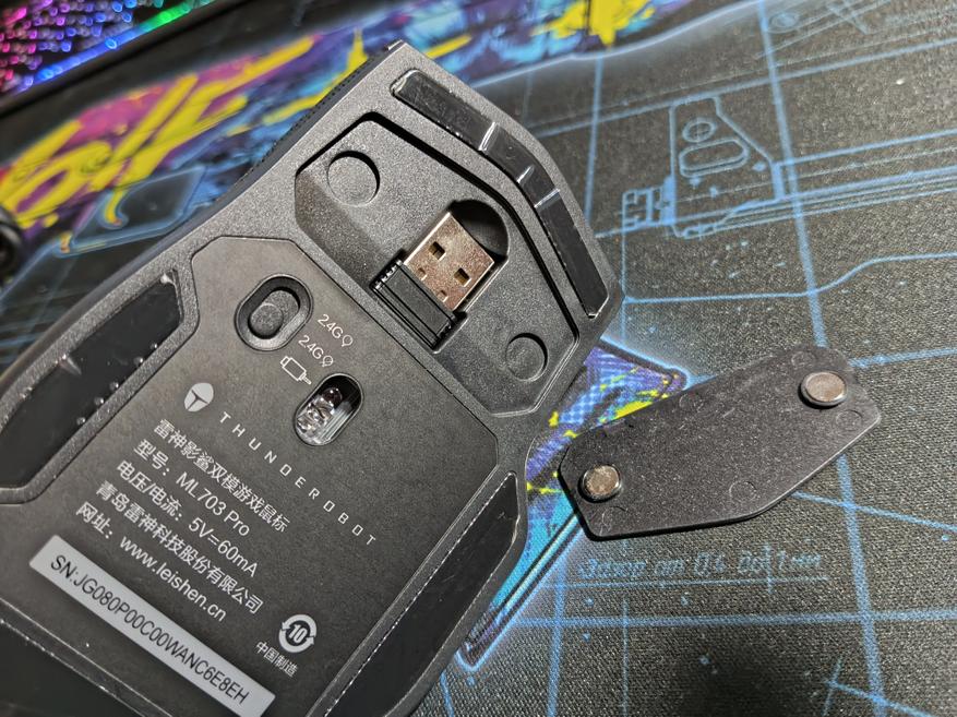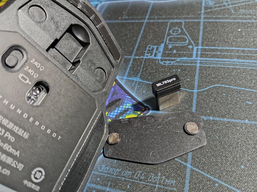 Под крышкой, которая держится с помощью двух, маленьких, неодимовых магнитов. Крышка держится хорошо и если стукнуть мышкой об стол в порыве ожесточенной игры, она не отвалится. Под этой крышкой находится wi-fi адаптер. Большим плюсом является, что производитель сверху адаптера нанёс название модели. Это удобно, когда вам надо отсоединить мышку, а у вас подключены ещё другие беспроводные устройства.