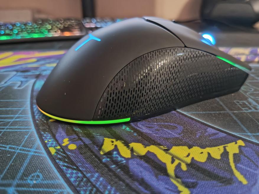 Мышка оснащена встроенной, RGB подсветкой, которую можно настроить на свой вкус. Подсветка точечно распределена по корпусу, цвета яркие, насыщенные. На первой фотографии вы можете наблюдать сбоку подсвечивает три из четырех квадратиков, голубом цветом. Это отображает состояние заряда аккумулятора, что весьма удобно.