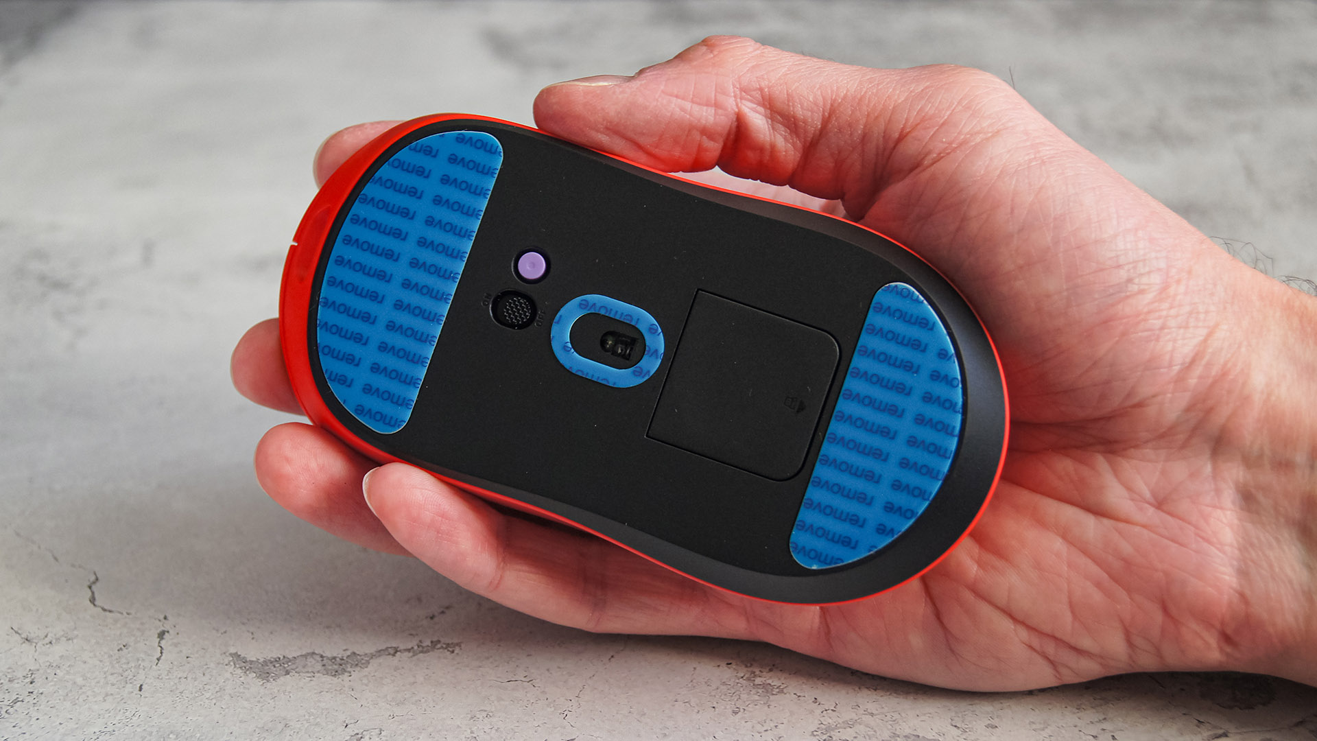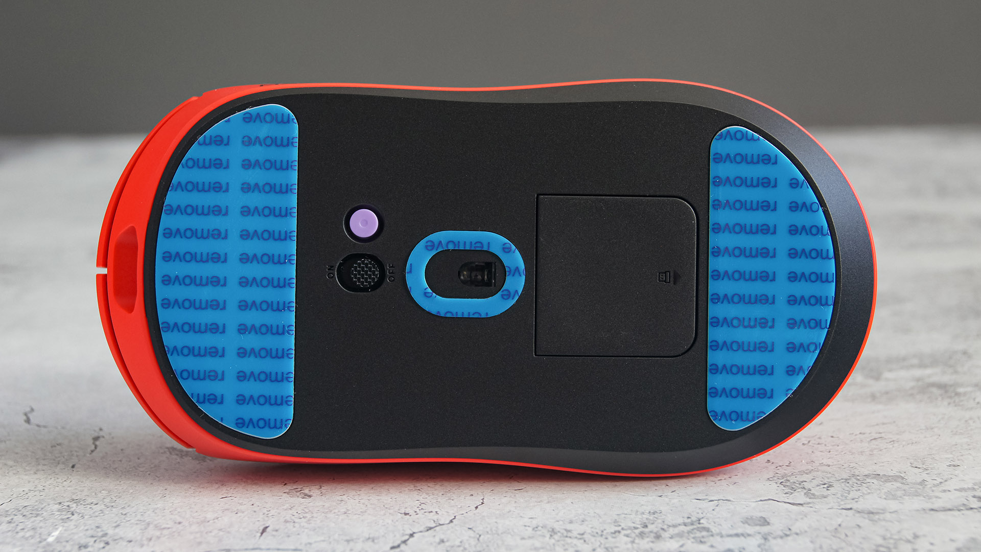 Взгляд на нижнюю часть подтверждает использование черного пластика. За плавное скольжение отвечают два крупных элемента из PTFE (чистого тефлона), а также кольцевая вставка вокруг линзы сенсора. Перед началом работы обязательно удалите защитные наклейки — специальные подсказки напомнят об этом.