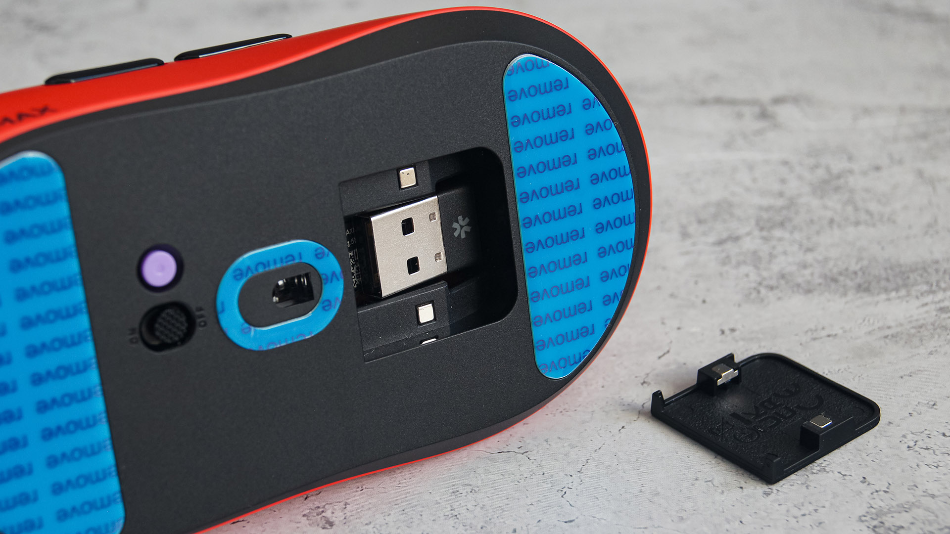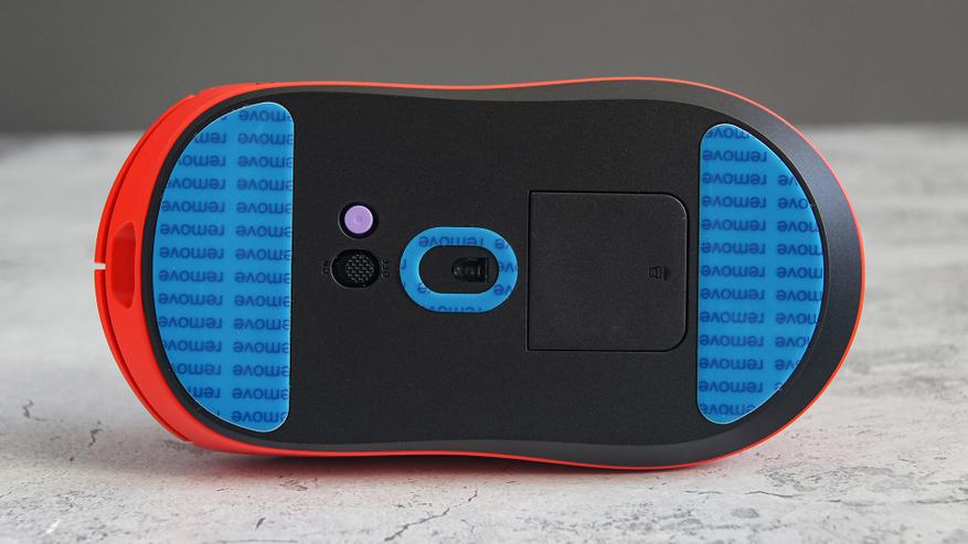 Слева предусмотрен технический отсек с магнитной крышкой для хранения USB-трансивера. Любопытно, что при первой распаковке адаптер лежит не в мыши, а в отдельном ложементе коробки.