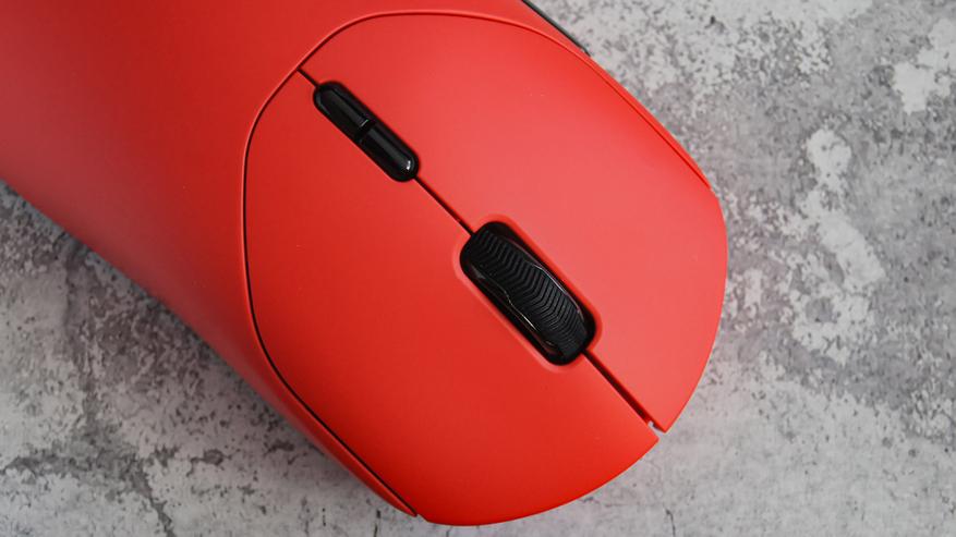 Основные клавиши конструктивно отделены от корпуса. Между ними расположено колесо прокрутки в «шине» из цепкого силикона с направленным протектором. Чуть ниже находятся две кнопки, которые по умолчанию отвечают за оперативную смену DPI.