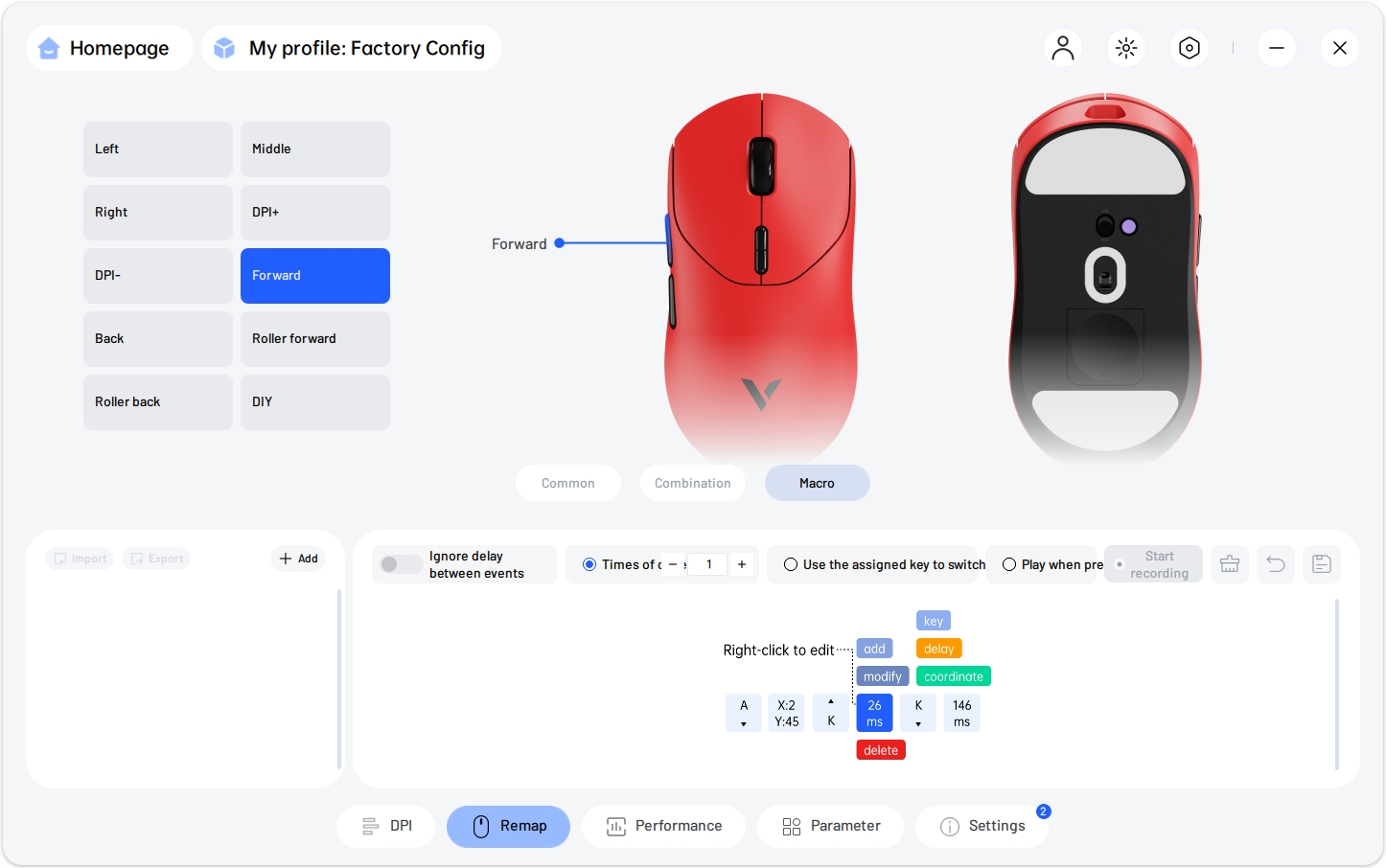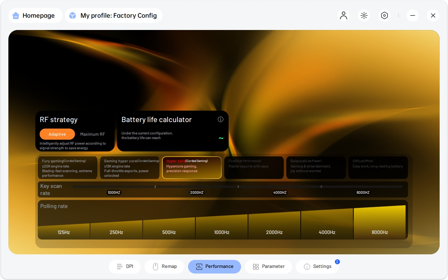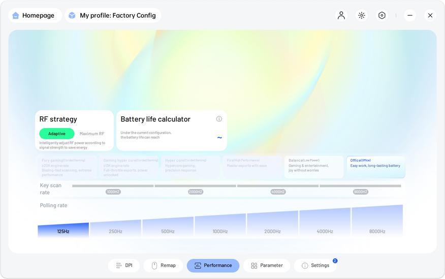 Для калибровки используется современная утилита Rapoo A HUB. Все инструменты распределены по интуитивно понятным вкладкам. Функционал исчерпывающий: от назначения макросов и сложных комбинаций до тонкой настройки датчика.