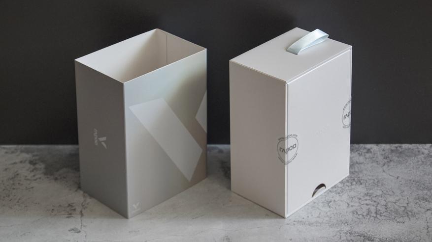 Знакомство с устройством начинается с премиальной коробки, состоящей из двух частей. Упаковка выполнена в формате «пенала»: внешняя накладка (шубер) имеет серебристо-перламутровый финиш, который под лучами света переливается подобно жемчугу. Под этой нарядной оболочкой находится основной бокс, изготовленный из плотного белоснежного картона.