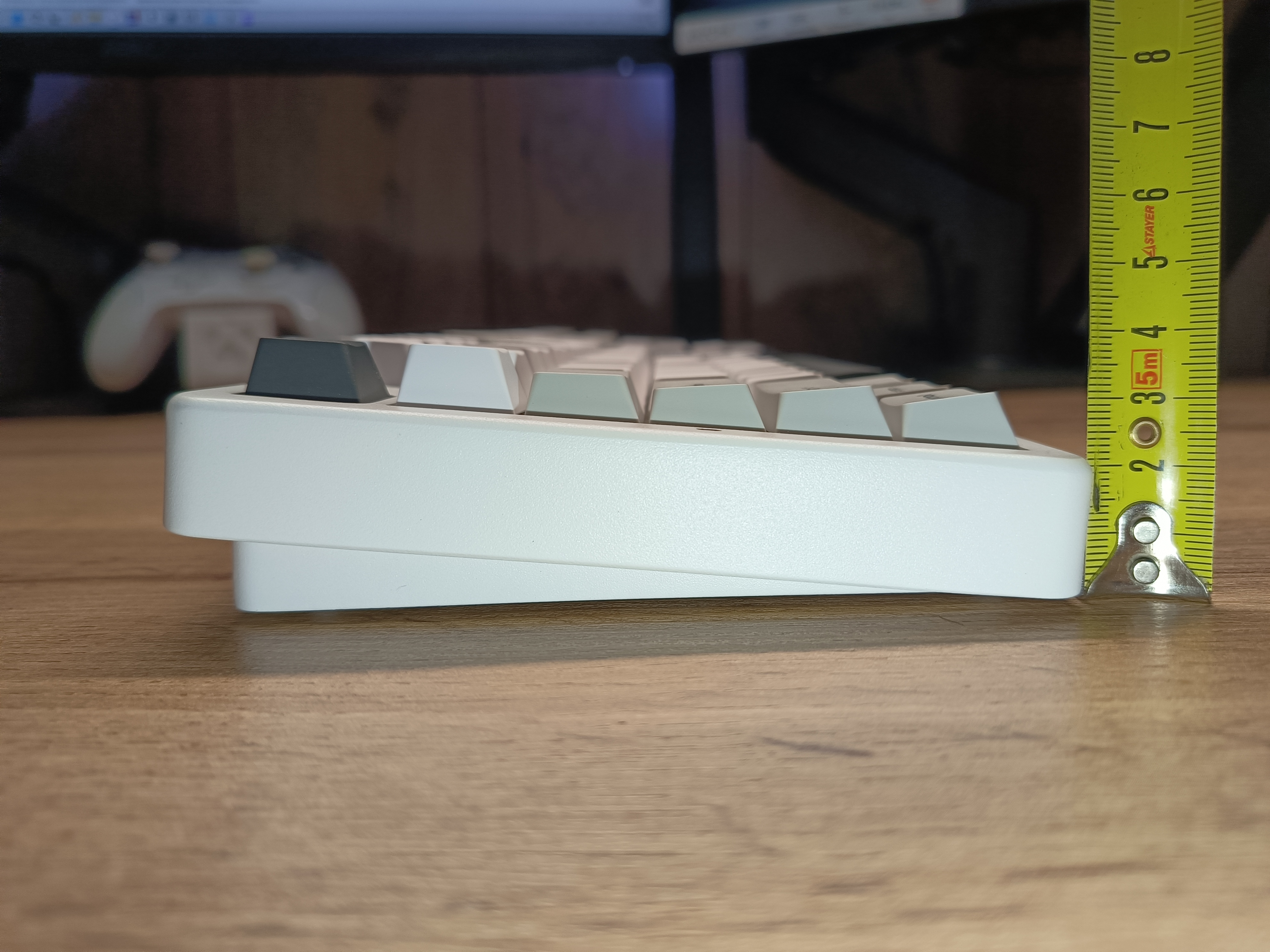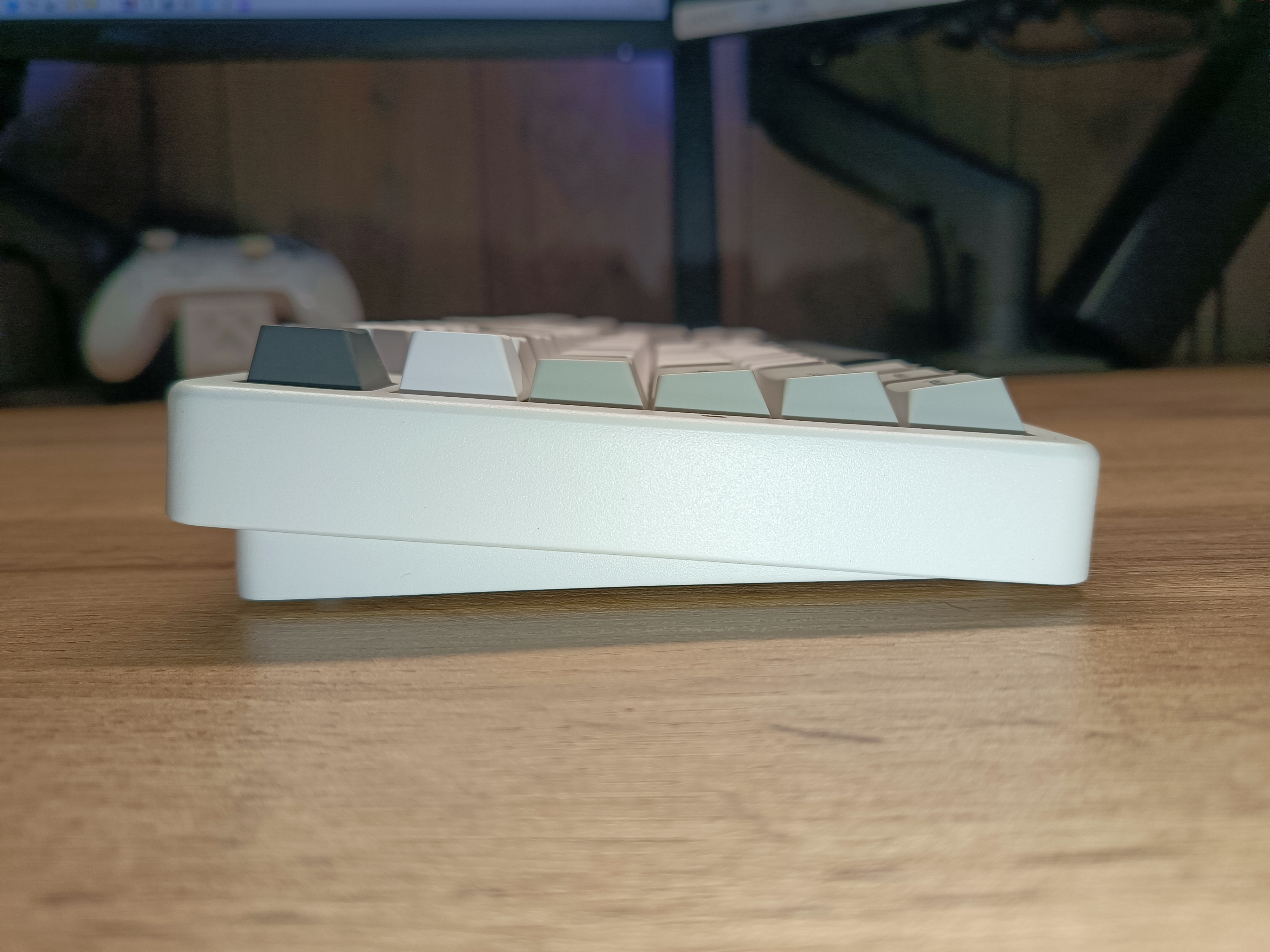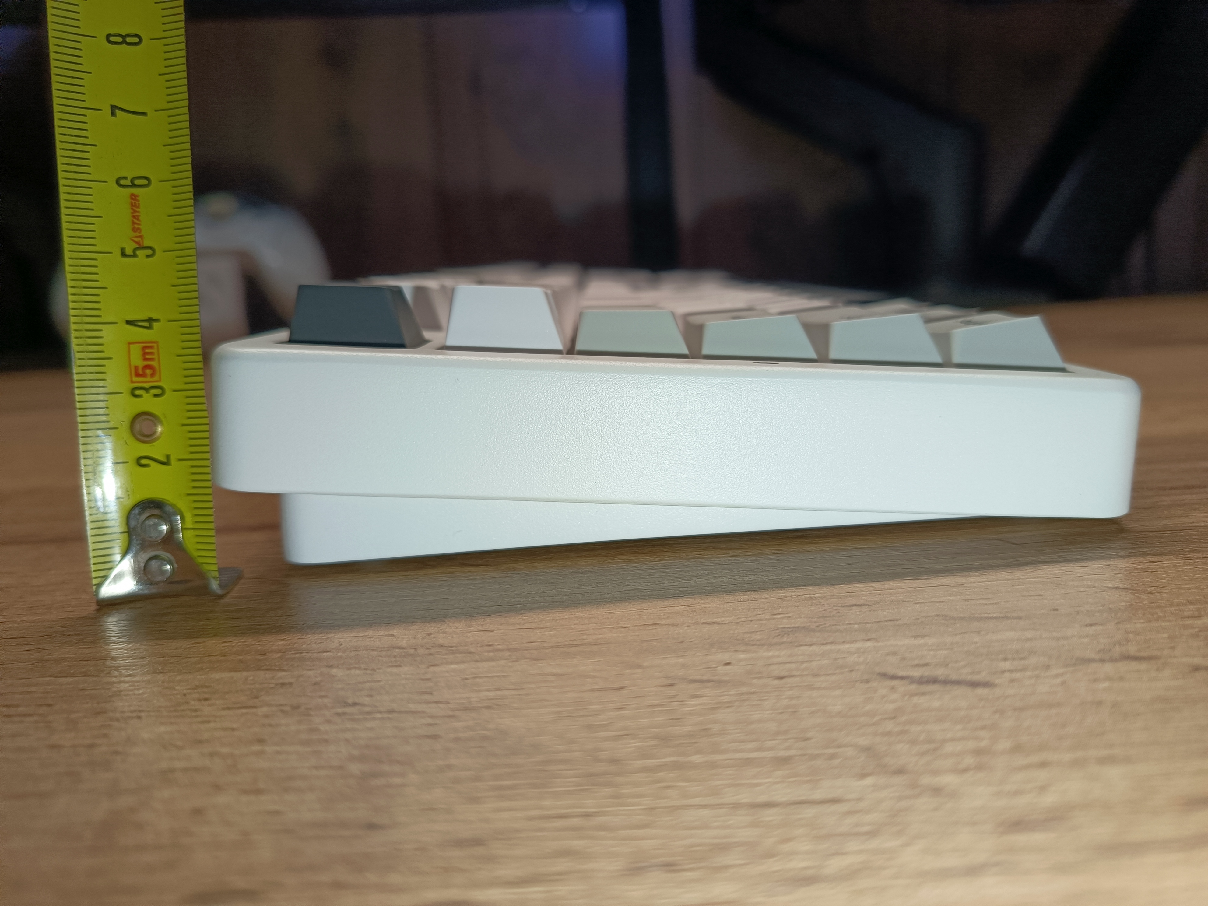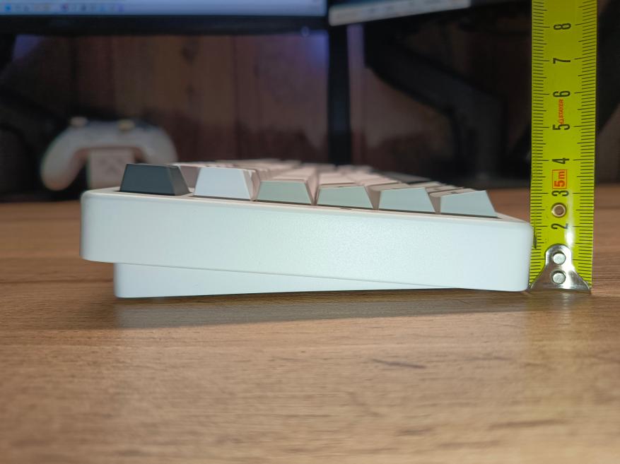 Профиль Cherry, который имеет наклон свитчей к центральной части клавиатуры. При таком весе и профиле изменения угла наклона в этой модели нет. С задней части в левом краю выведен тумблер, отвечающий за режимы подключения, и разъём USB-C для зарядки.