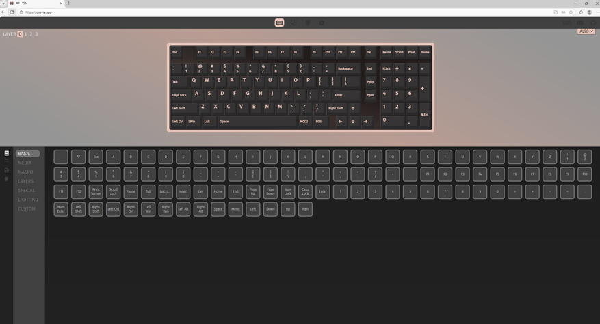 Далее загружаем этот профиль на сайте, и после этого открываются все настройки. Можно создать макросы, изменить режим подсветки, переназначить клавиши. В целом стандартный набор возможностей для клавиатуры через VIA-профиль.