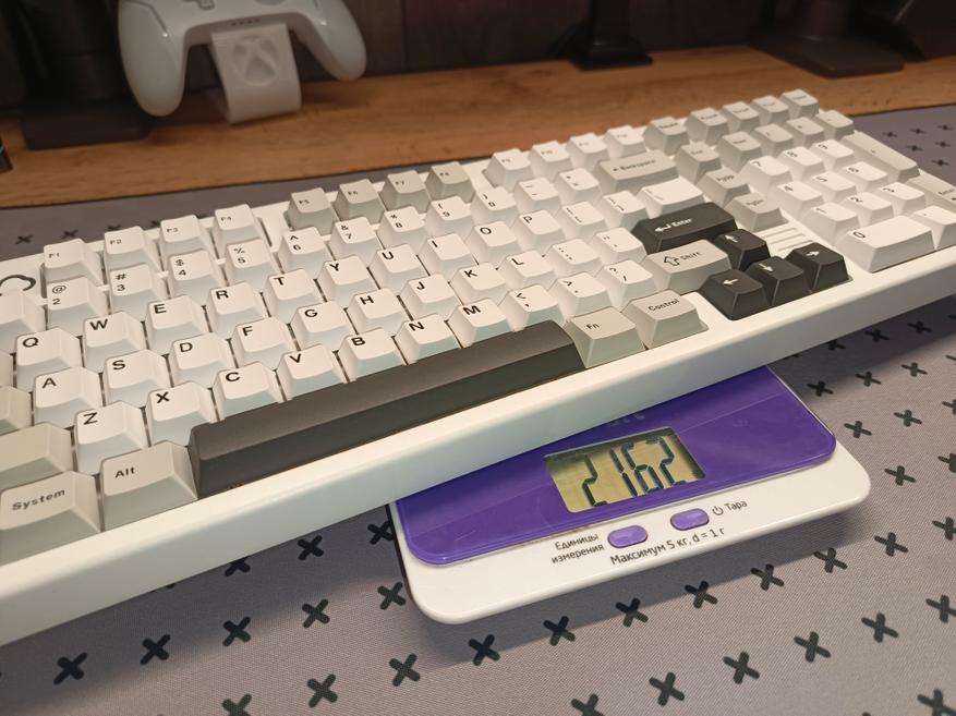 Полностью алюминиевый корпус, который собран по гаскет-структуре. Вес клавиатуры 2162 грамма. Про скрипы, люфт и аналогичные проблемы можно забыть сразу, но появляются другая. Эту модель не особо удобно двигать по столу из-за большого веса. Поэтому этот вариант для тех, кто любит статику — один раз установил и забыл.