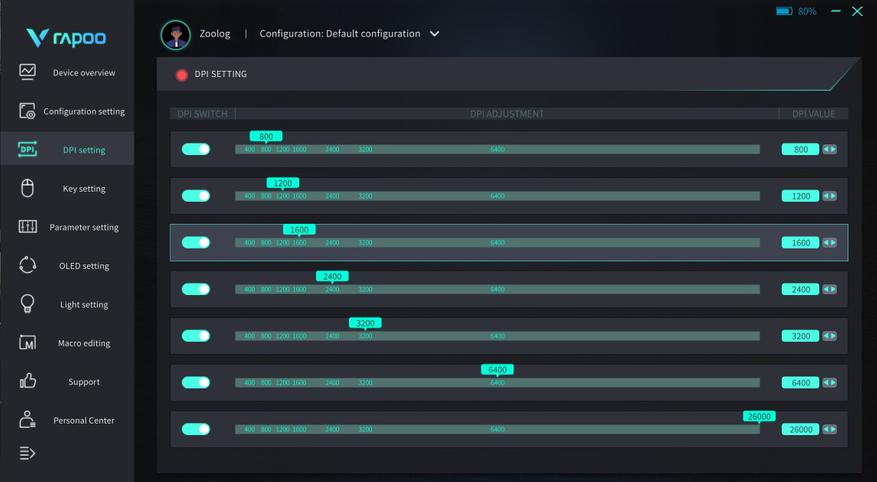 Для переключения DPI доступно семь ступеней. Каждую из них можно настроить ползунком. Есть возможность убрать лишние ступени, сняв галочку напротив полоски.