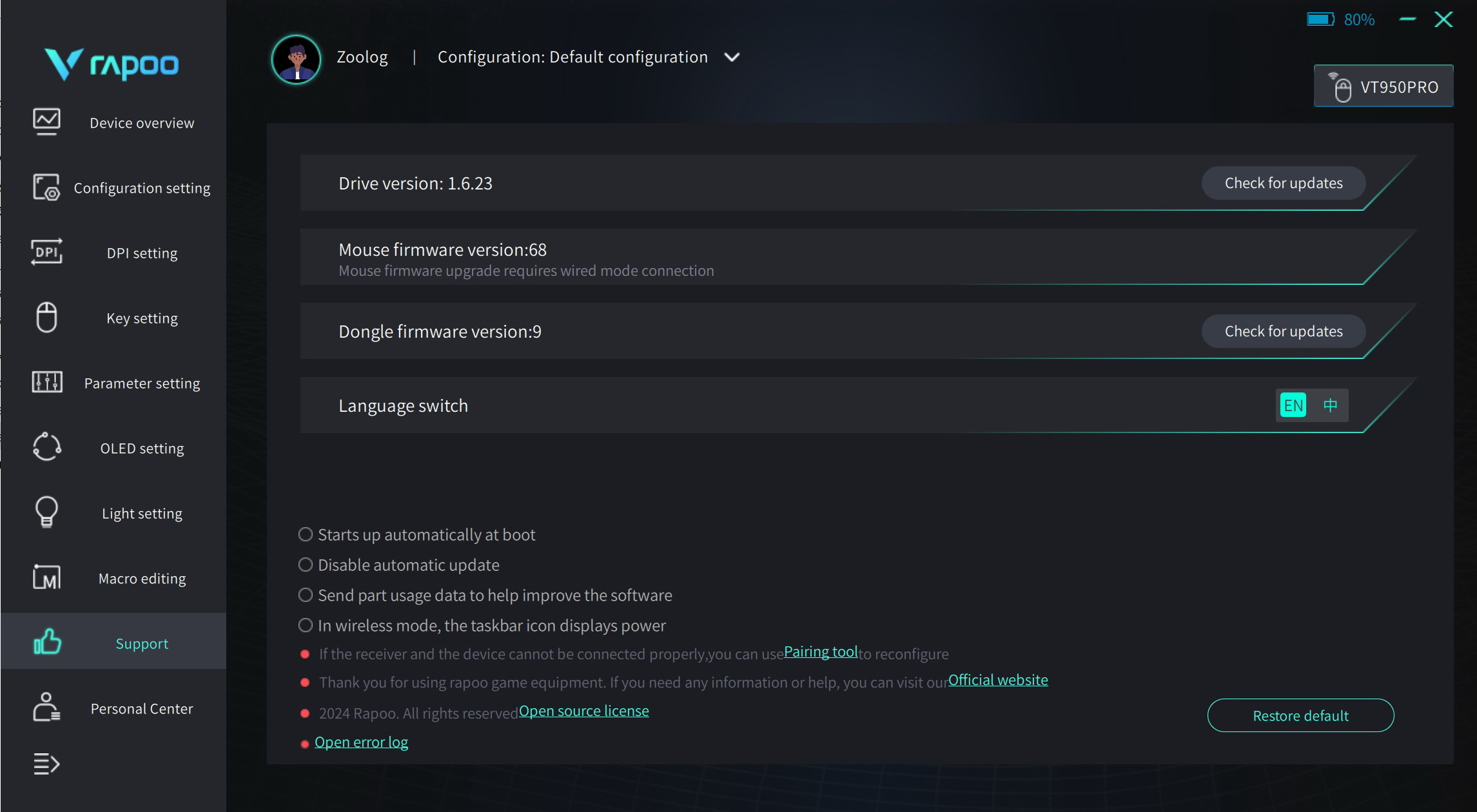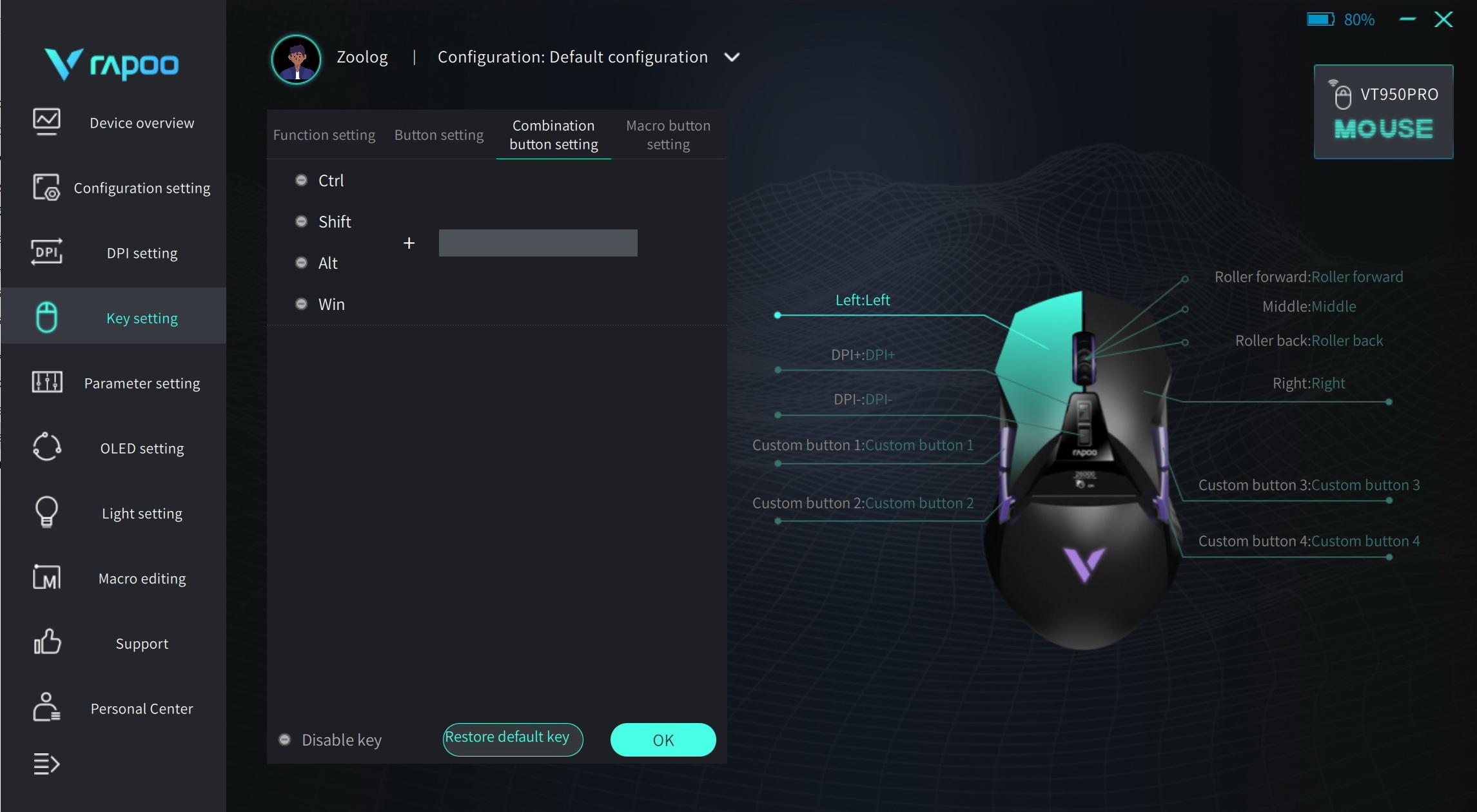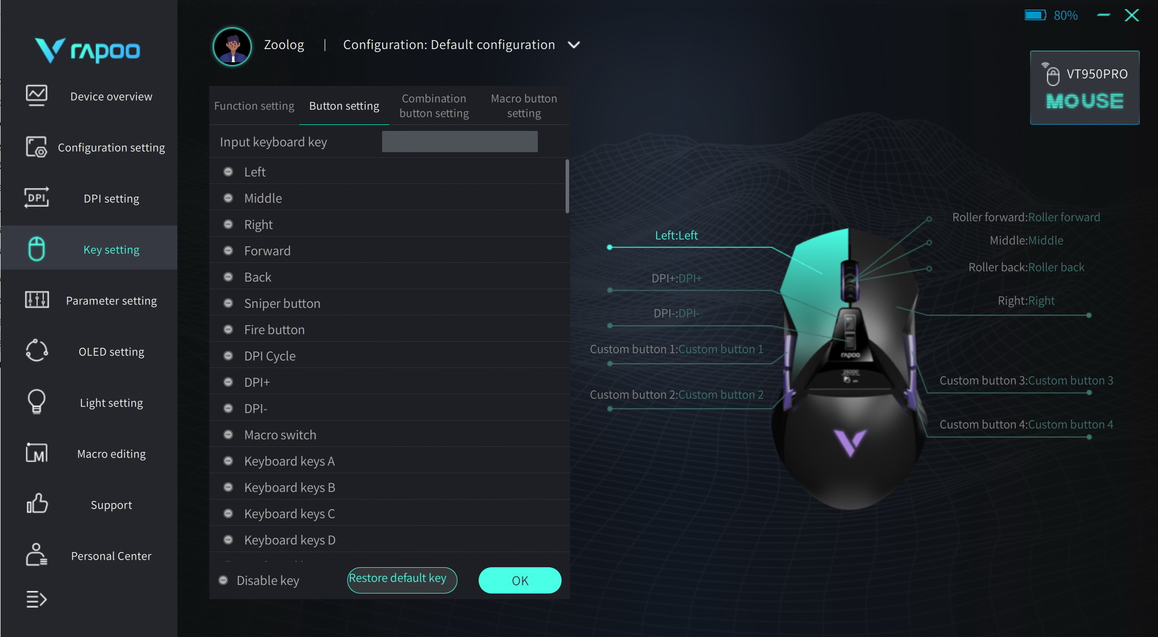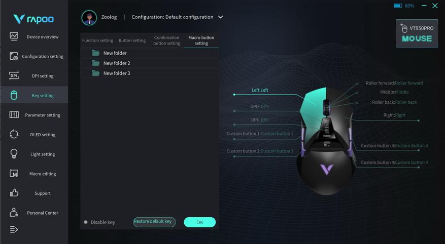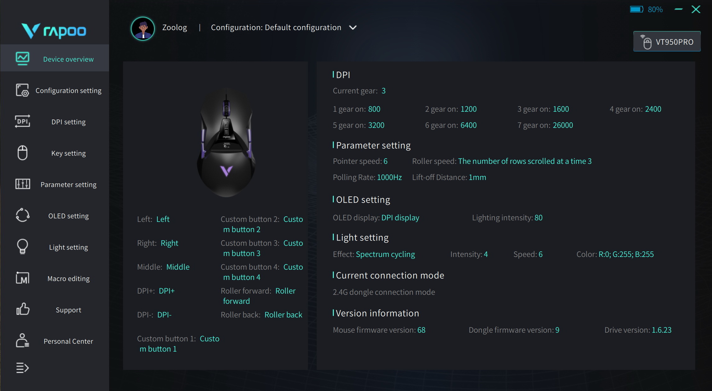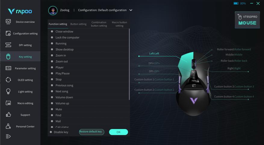 Фирменное ПО я скачал с русскоязычного сайта Rapoo https://www.rapoo.com/ru/центр-загрузки-2/. Никаких сложностей, а то на Ютубе я видел жалобы, что приходилось искать на китайских сайтах. Называется программа RapooGameDev