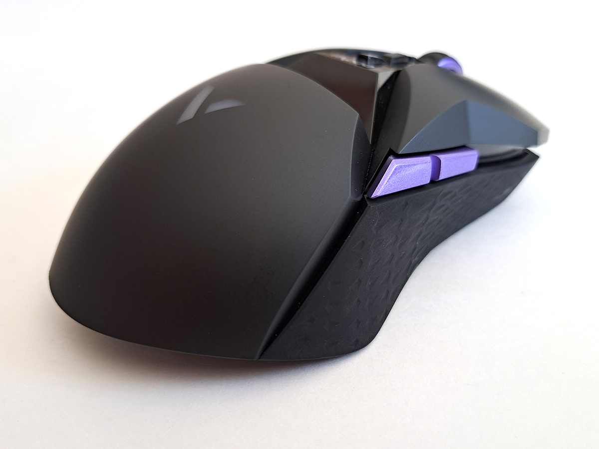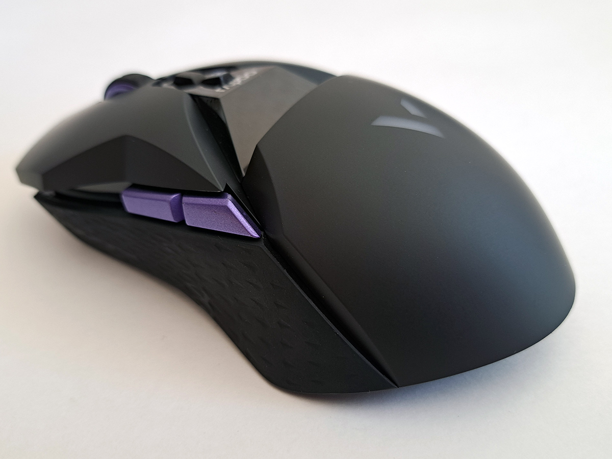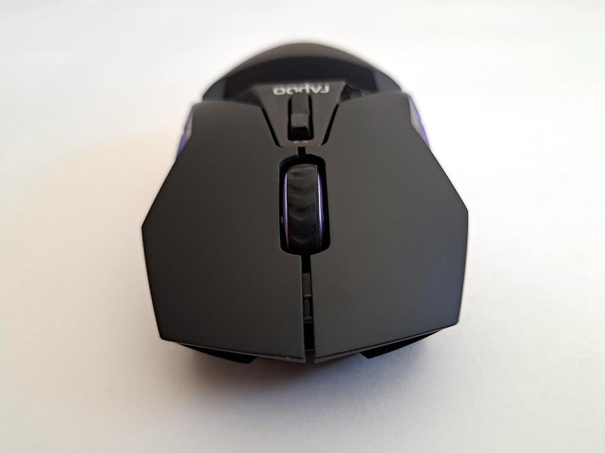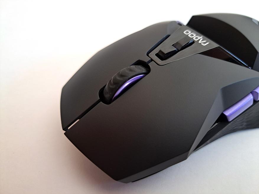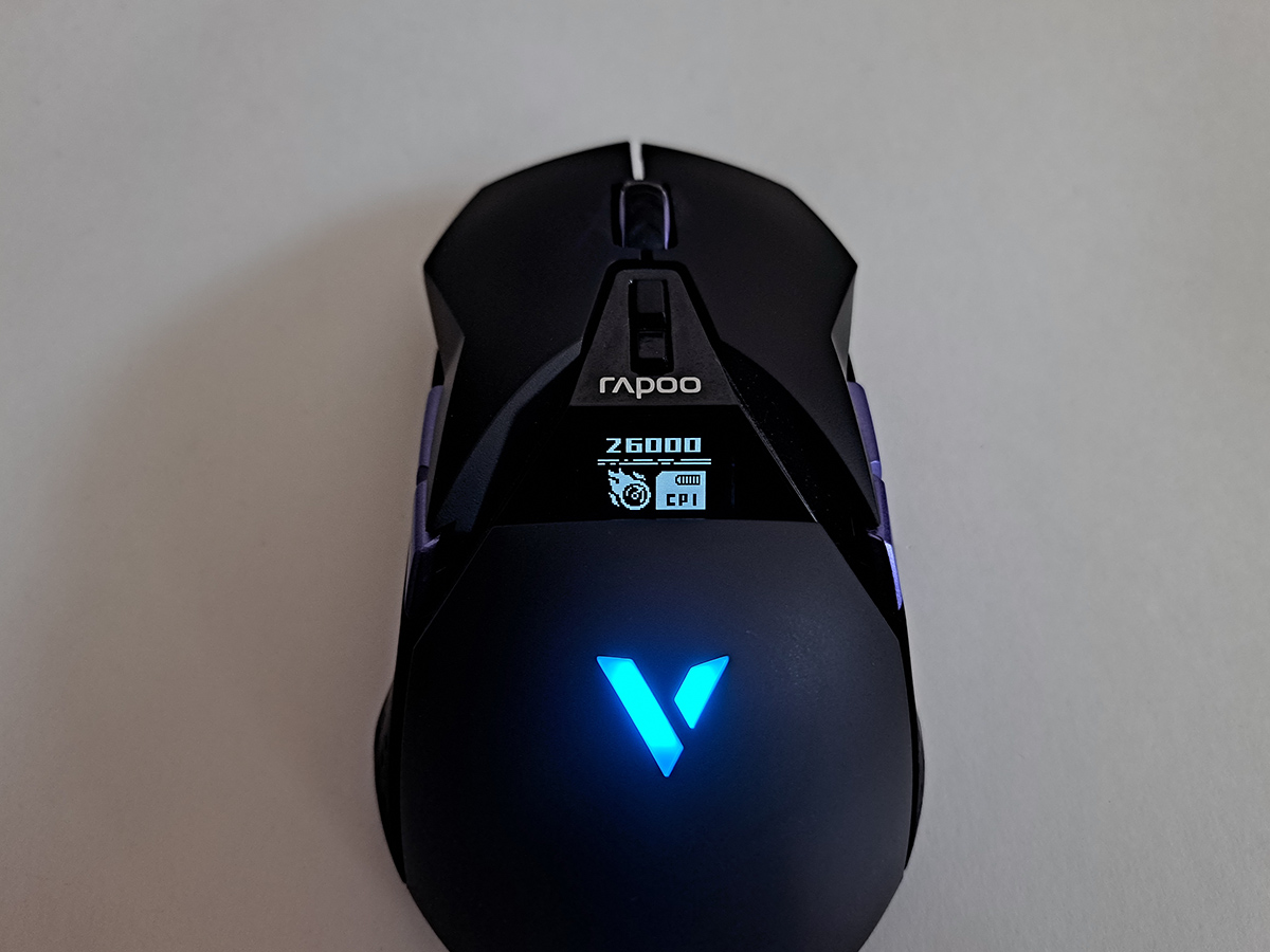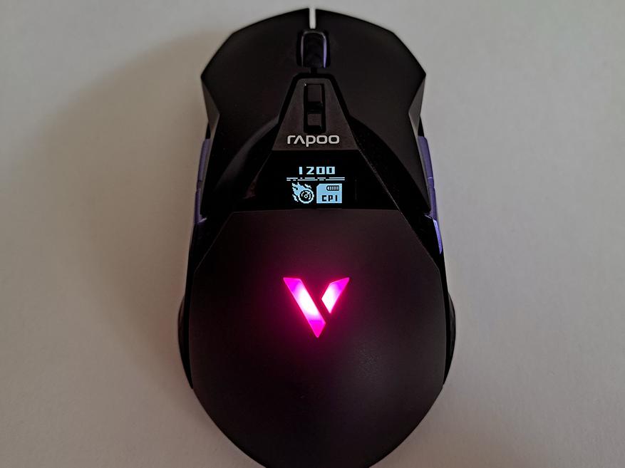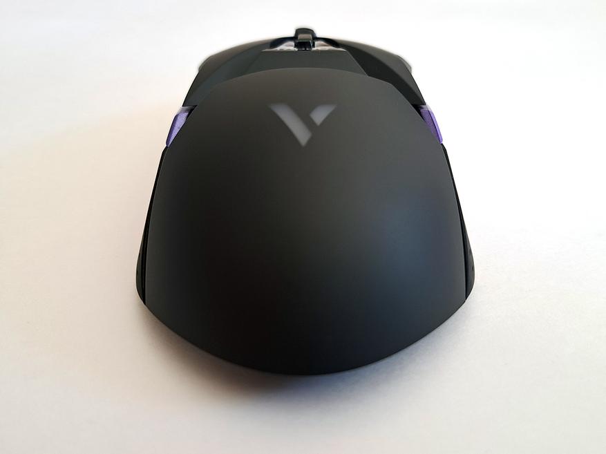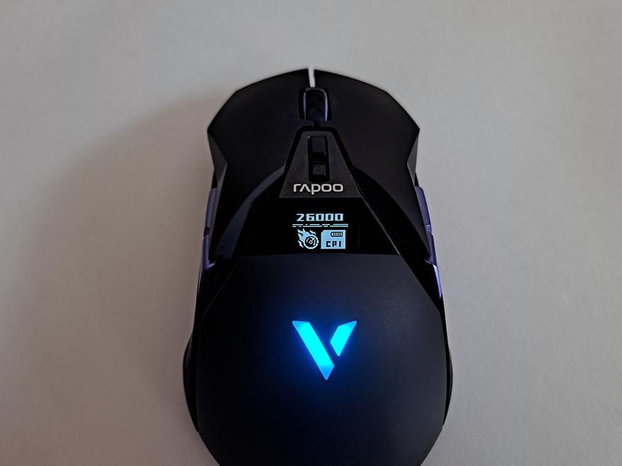 Колесико у мышки малошумное, с резиновым протектором и сглаженной насечкой. У мышки есть подсветка, но крайне скромная в виде буквы V на спинке. Позади колесика расположены кнопки переключения DPI, о смене которого информирует цвет подсветки, а также информация на экранчике (если он так настроен).