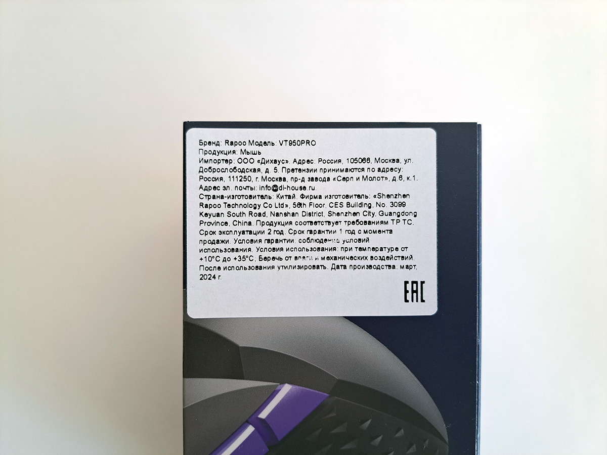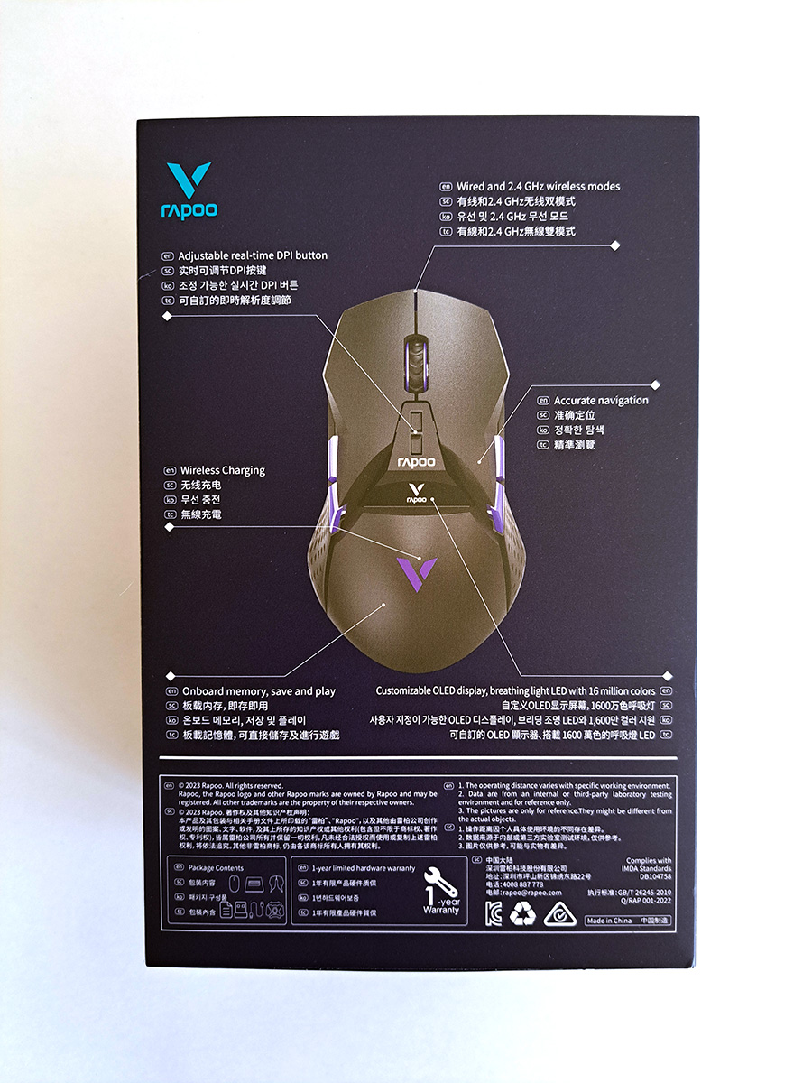 Мышка упакована в коробку из плотного картона с суперобложкой. Коробка в мрачных черных и тёмно-синих тонах, а не в оттенках циана, как это было раньше у Rapoo. Наверное, чтобы подчеркнуть серьезность и премиальность манипулятора.