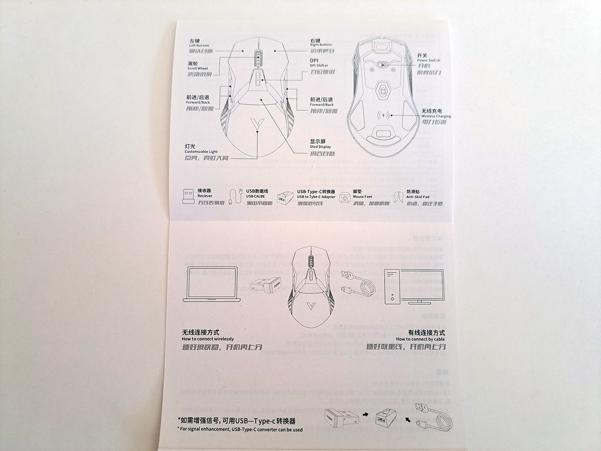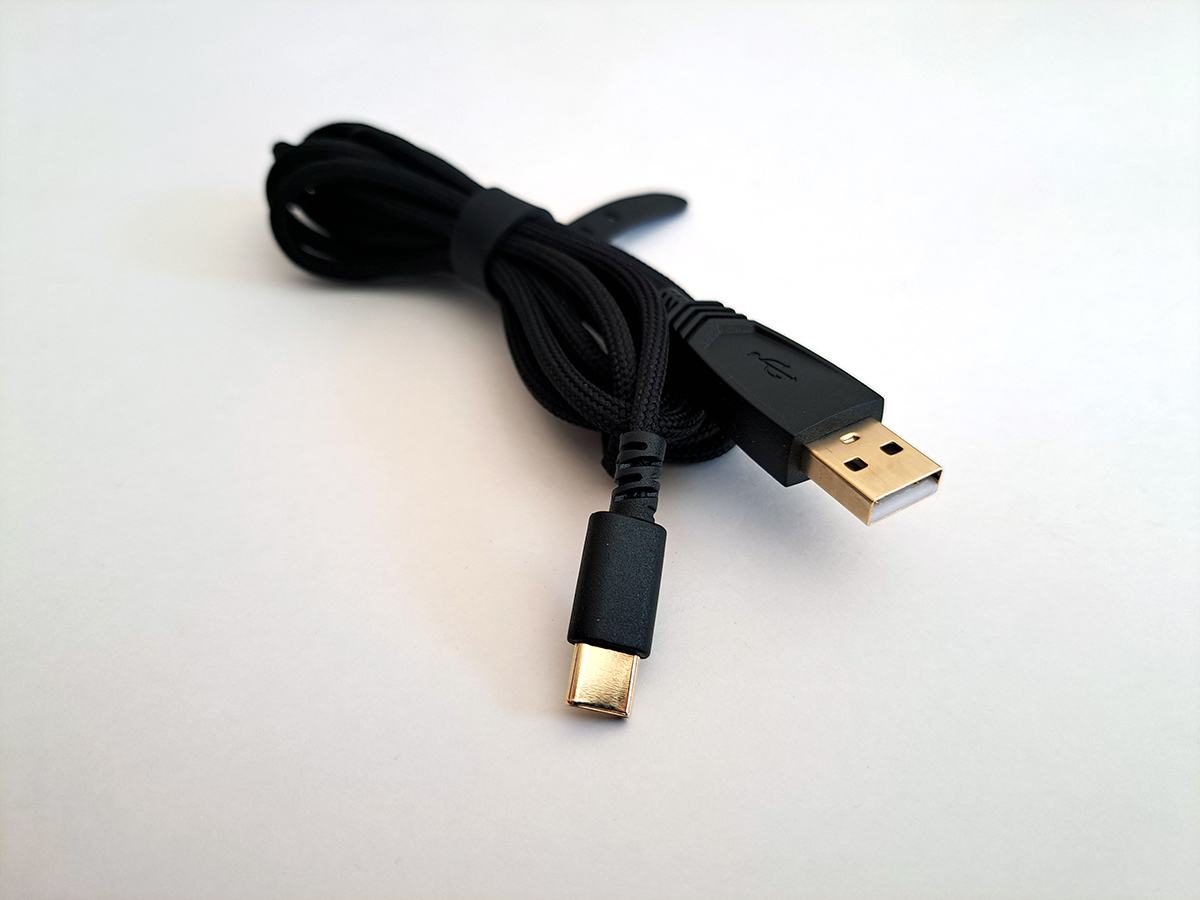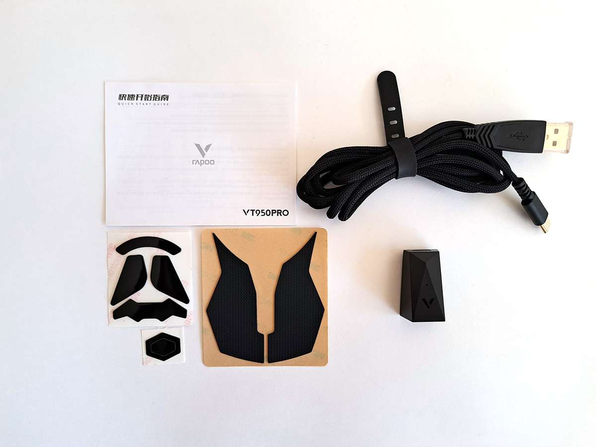 Комплектация у мышки воистину богатая: кроме руководства пользователя, мы можем увидеть — длинный USB кабель, переходник USB Type С — USB Type A, а также скользящие наклейки для брюшка мышки, и противоскользящие для спинки, так называемые глайды и грипсы соответственно.