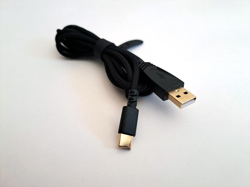 Длина кабеля составляет 185 см. Контакты позолочены, есть оплетка и утяжка для регулировки длины. Сам кабель очень мягкий, не зря в одном из обзоров его назвали «паракордовым». При помощи USB переходника кабель может стать удлинителем для донгла мышки. Например, системный блок у вас расположен под столом, при помощи кабеля с переходником, донгл можно размесить на столе, чтобы не иметь никаких проблем с качеством передачи сигнала.