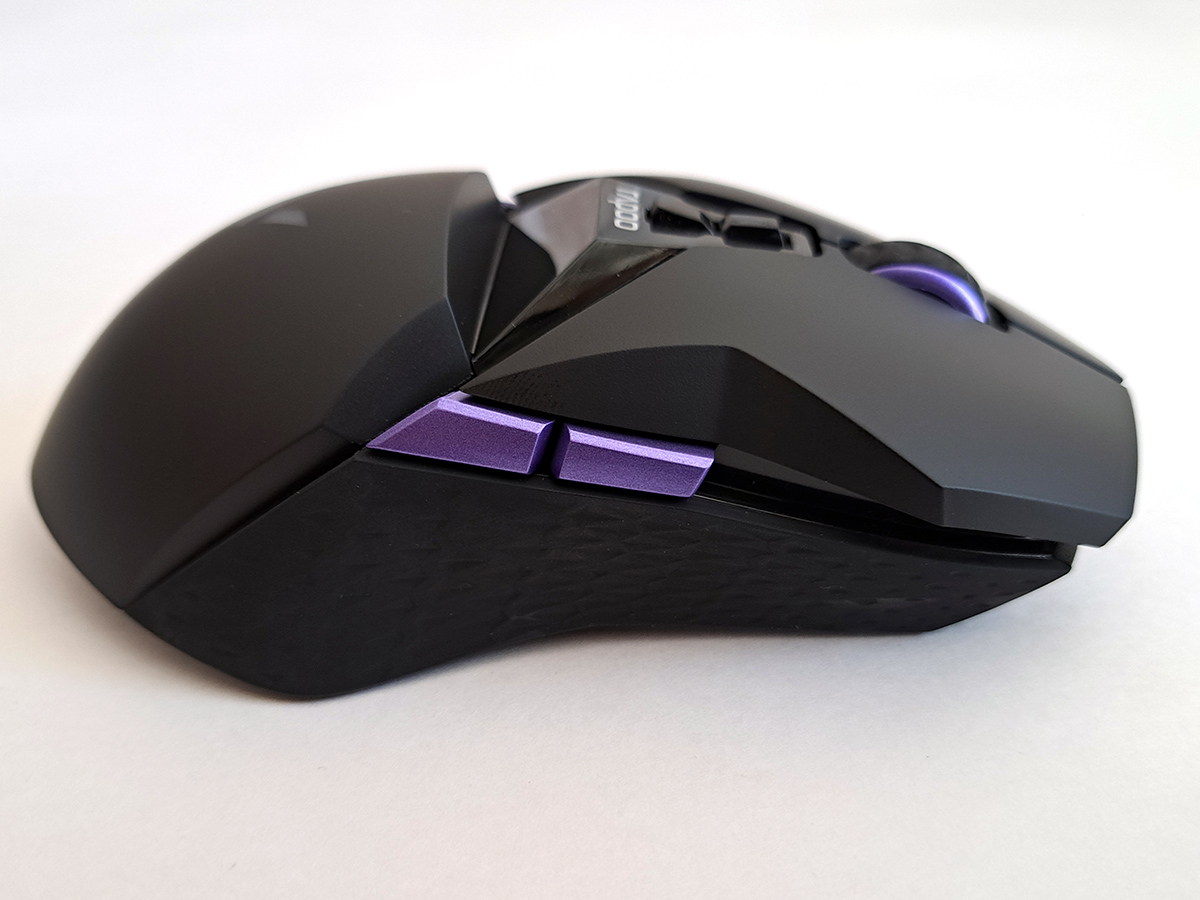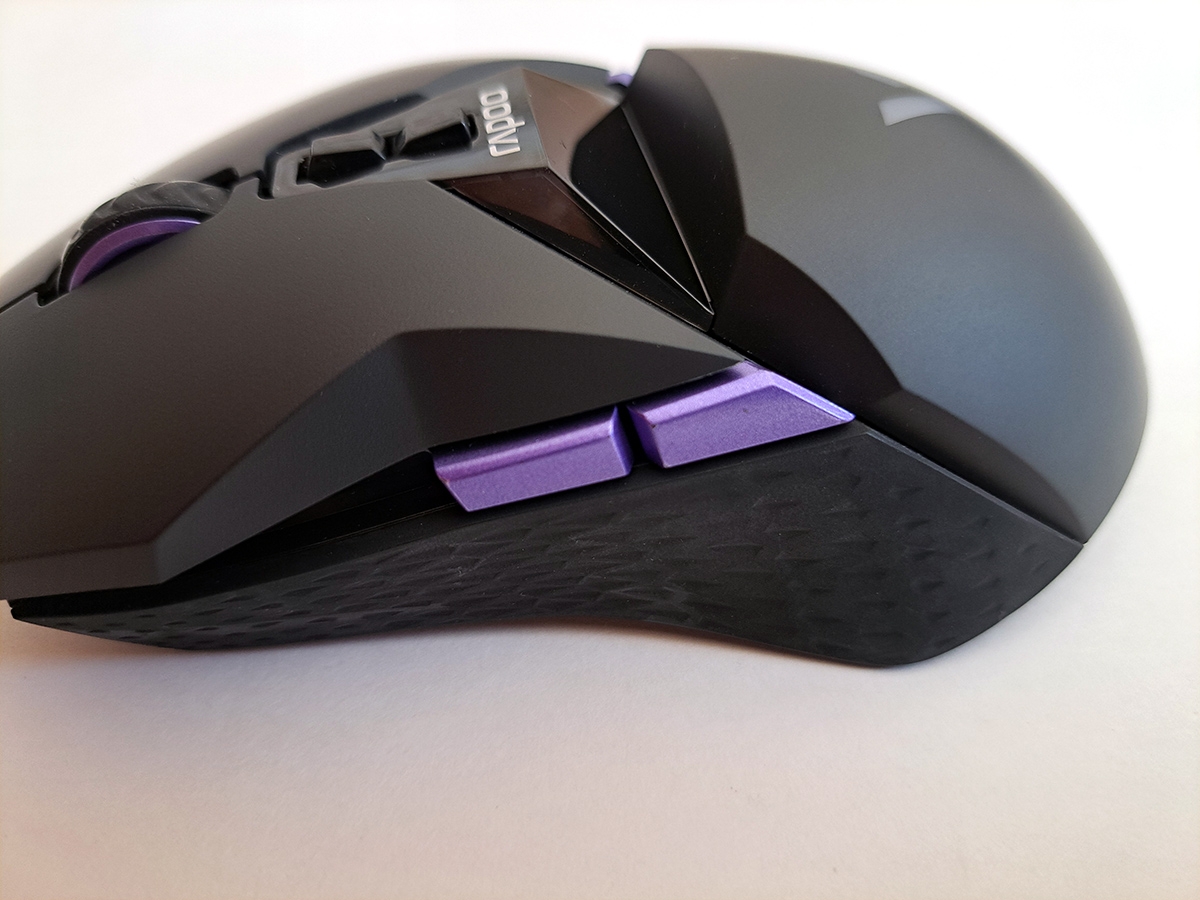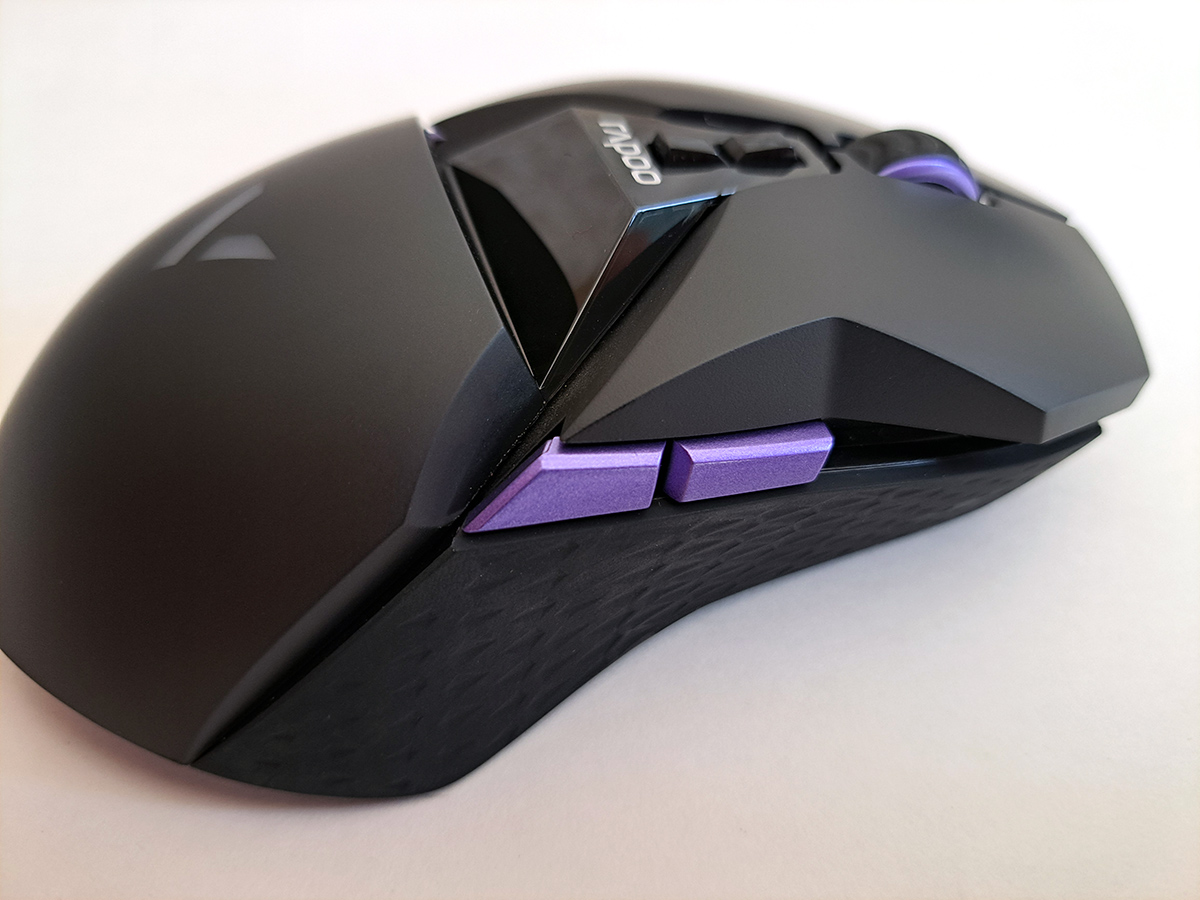Спинка и основные клавиши мышки с софтач покрытием. Боковинки снабжены рифлеными силиконовыми накладками. Боковые кнопки фиолетового цвета несколько оживляют мрачную черноту мышки. Нажатие несколько более упругое, чем у основных кнопок. Щелчки негромкие.