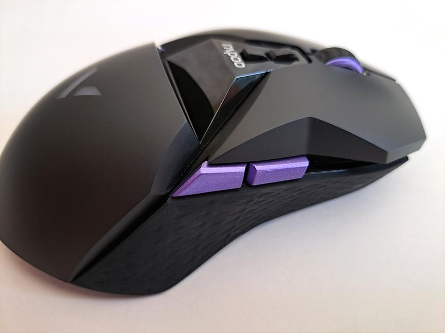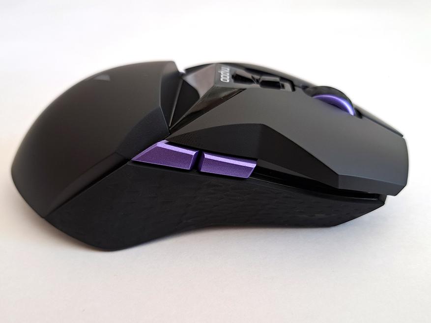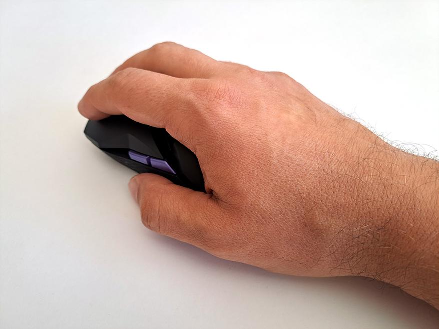 В моей большой ладони расположилась удобно. До нее, я месяц пользовался Rapoo MT760 с ярко выраженной праворукой формой. С непривычки Rapoo VT950Pro хуже заполняла ладонь, но период адаптации был очень коротким.