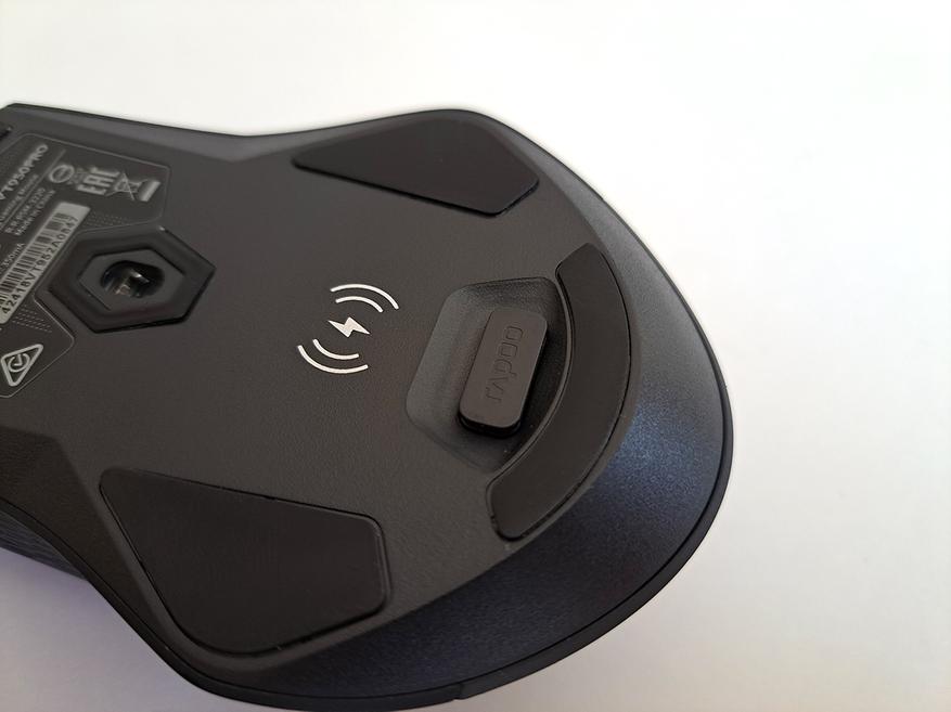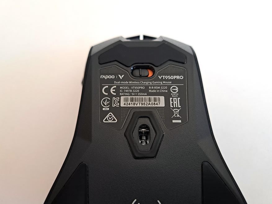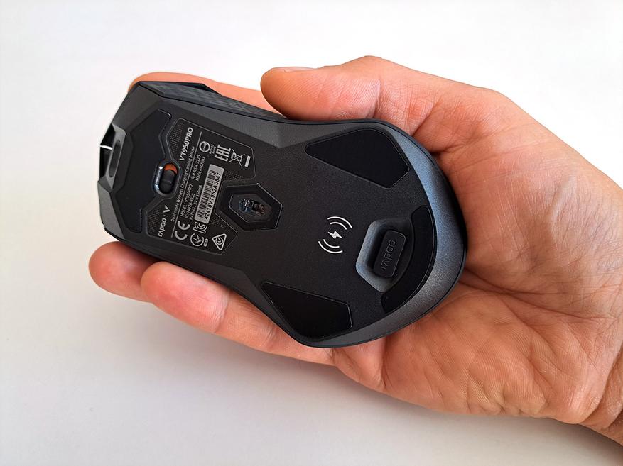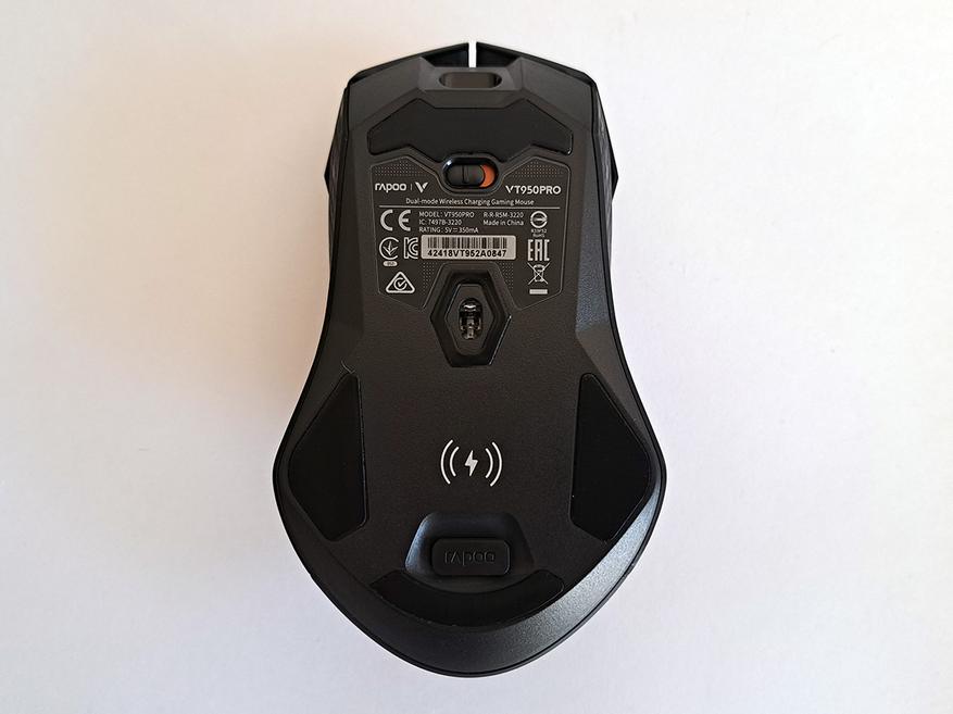 На брюшке виден тумблер включения мышки. Иногда в описании указывают, что Rapoo VT950Pro работает по Bluetooth. Может быть такое и было в ранних версиях, но на данный момент надпись Dual Mode означает приводной и беспроводной режимы работы.