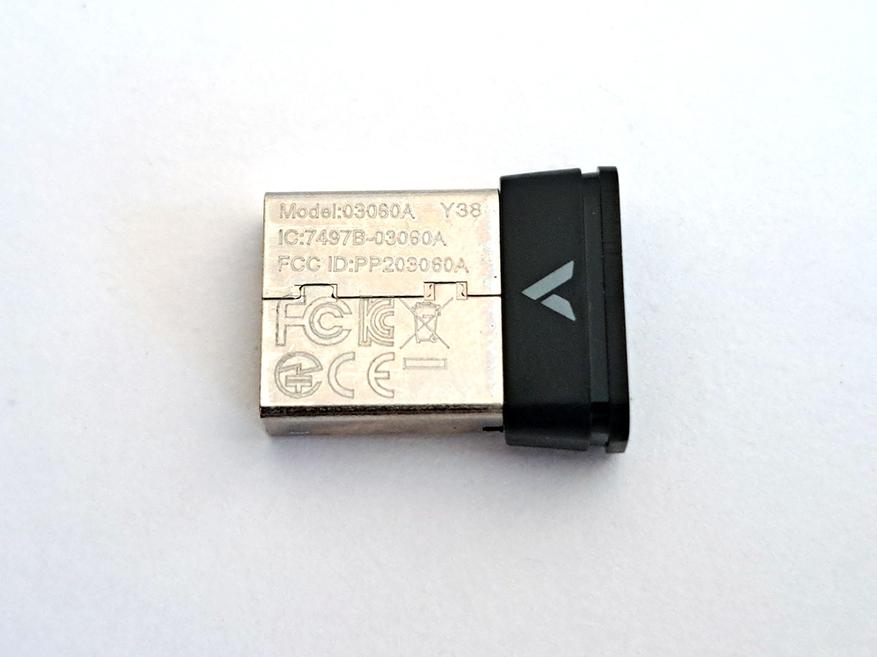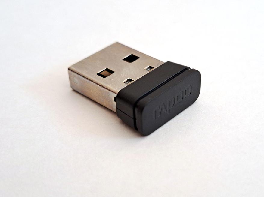 Адаптер, как у большинства беспроводных манипуляторов Rapoo содержит маркировку бренда и модели. С комплектным адаптером мышка может работать с частотой опроса 1000 Гц, а если приобрести USB приемник Rapoo V2M, то станет доступна частота опроса 4000 Гц.