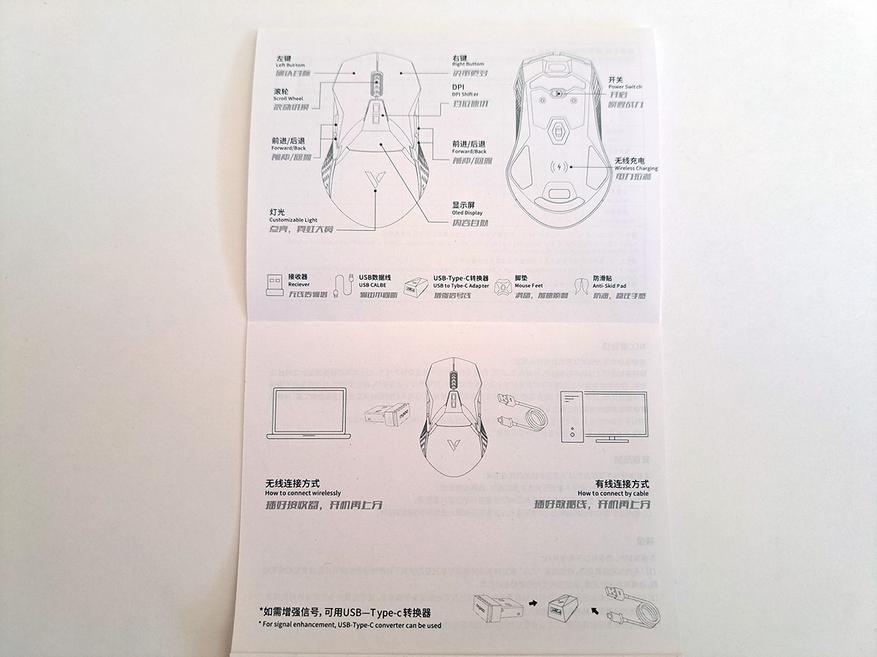 Русский язык в руководство не добавили, но знание английского на школьном уровне позволяет понять, что у мыши интересные взаимоотношения с кабелем. При подключении по кабелю она не только заряжает аккумулятор, но может стать проводной мышкой. А такая опция встречается далеко не у каждой беспроводной мыши.
